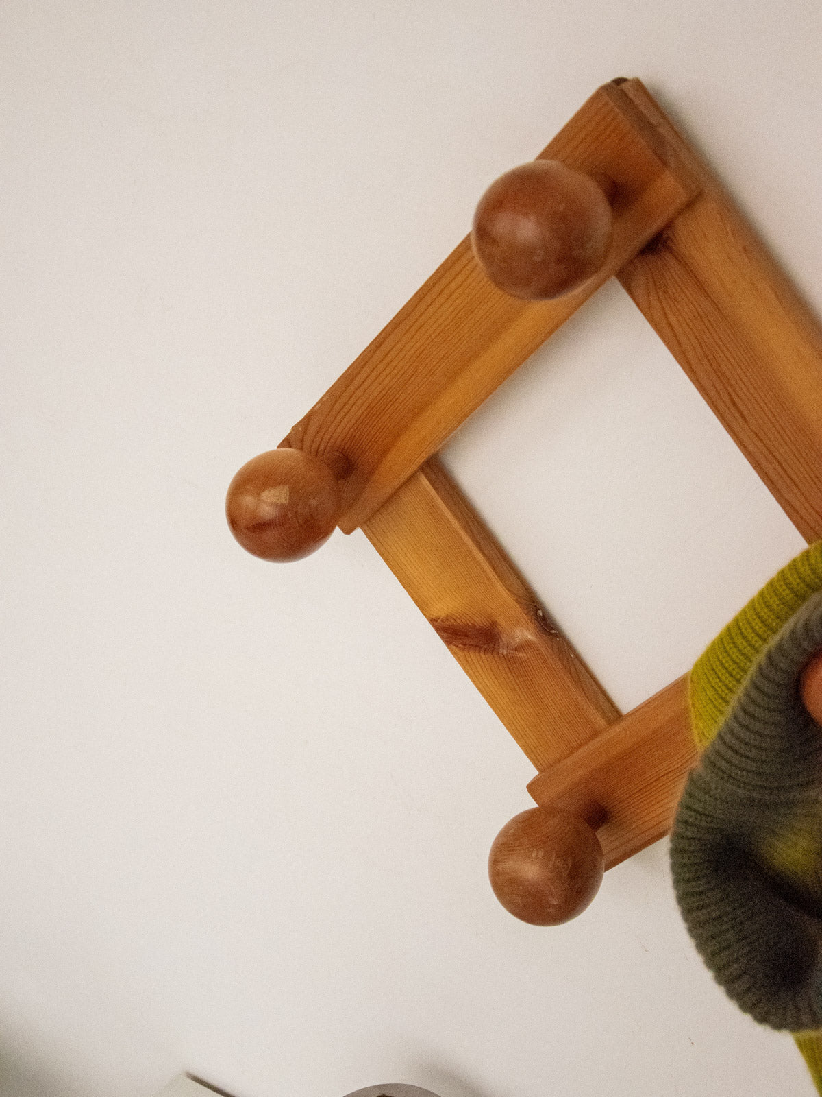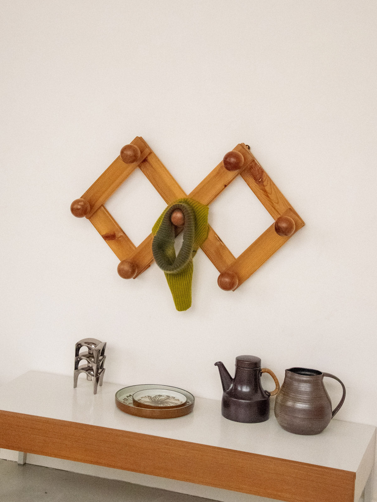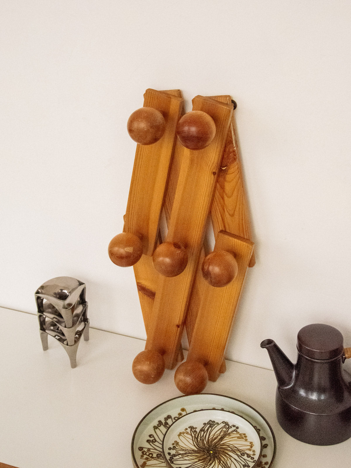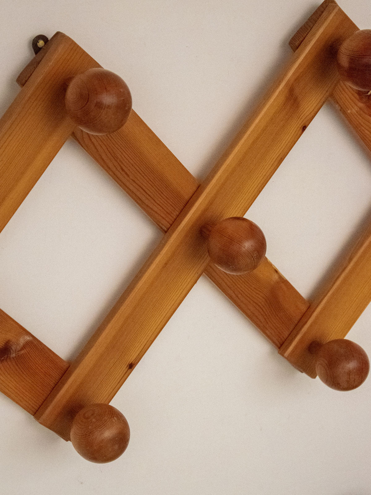 Bring a retro feel with this 1970s pine wall-mounted coat rack, with its warm grain and soft patina; its double square layout and seven folding hooks offer clever and modular storage, generous enough for coats, bags and scarves without cluttering the entrance, while its wall format optimizes space and integrates elegantly into a Scandinavian or vintage setting; it folds easily to free up the wall when needed.