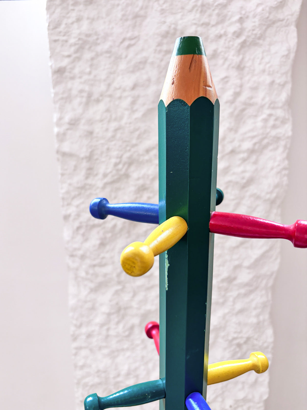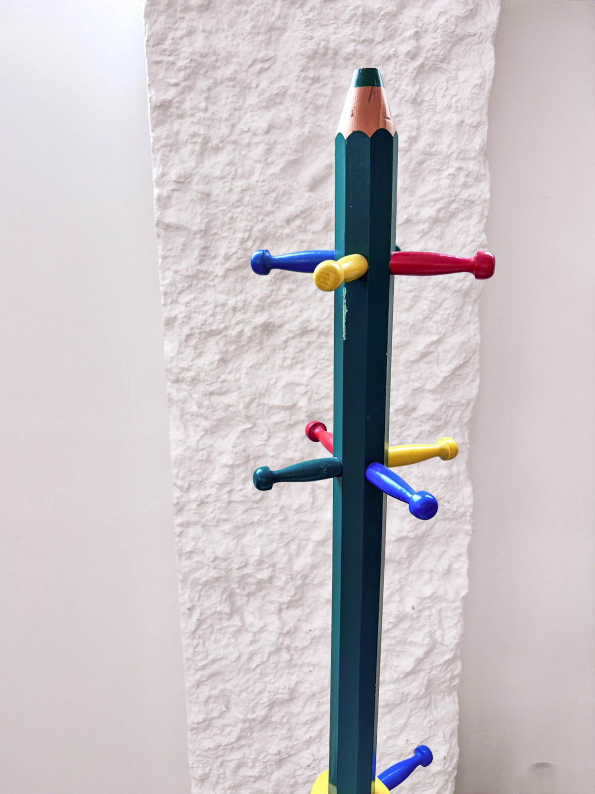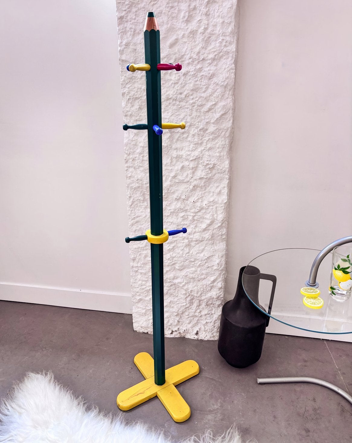 Add a retro touch to your home with this colorful 80s wooden coat rack, in the iconic Pierre Sala style. Featuring 10 sturdy hooks, this functional piece of furniture combines aesthetics and practicality, perfect for holding coats, scarves, and hats. Its bold design and vibrant hues bring a touch of joy to your hall or corridor, while remaining timeless. A must-have for vintage lovers looking for character!