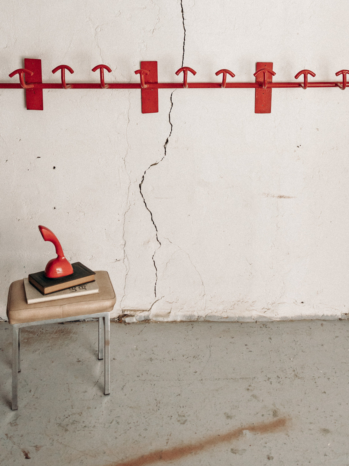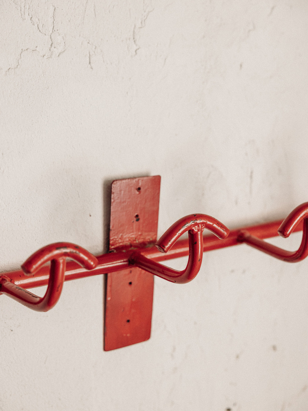 Discover this vintage red metal coat rack or hook, an old model from a 1980s fire station. With its authentic patina, it brings an industrial touch full of character to your home. Ideal in an entryway for hanging coats and accessories, it will also find its place in a hallway, bedroom, or even an office for an original and functional decoration. Its robust and timeless design makes it a unique piece that combines practicality and retro aesthetics.