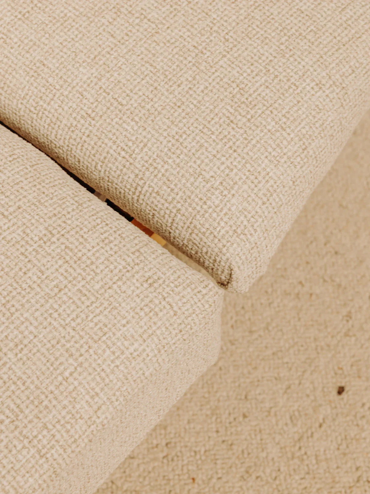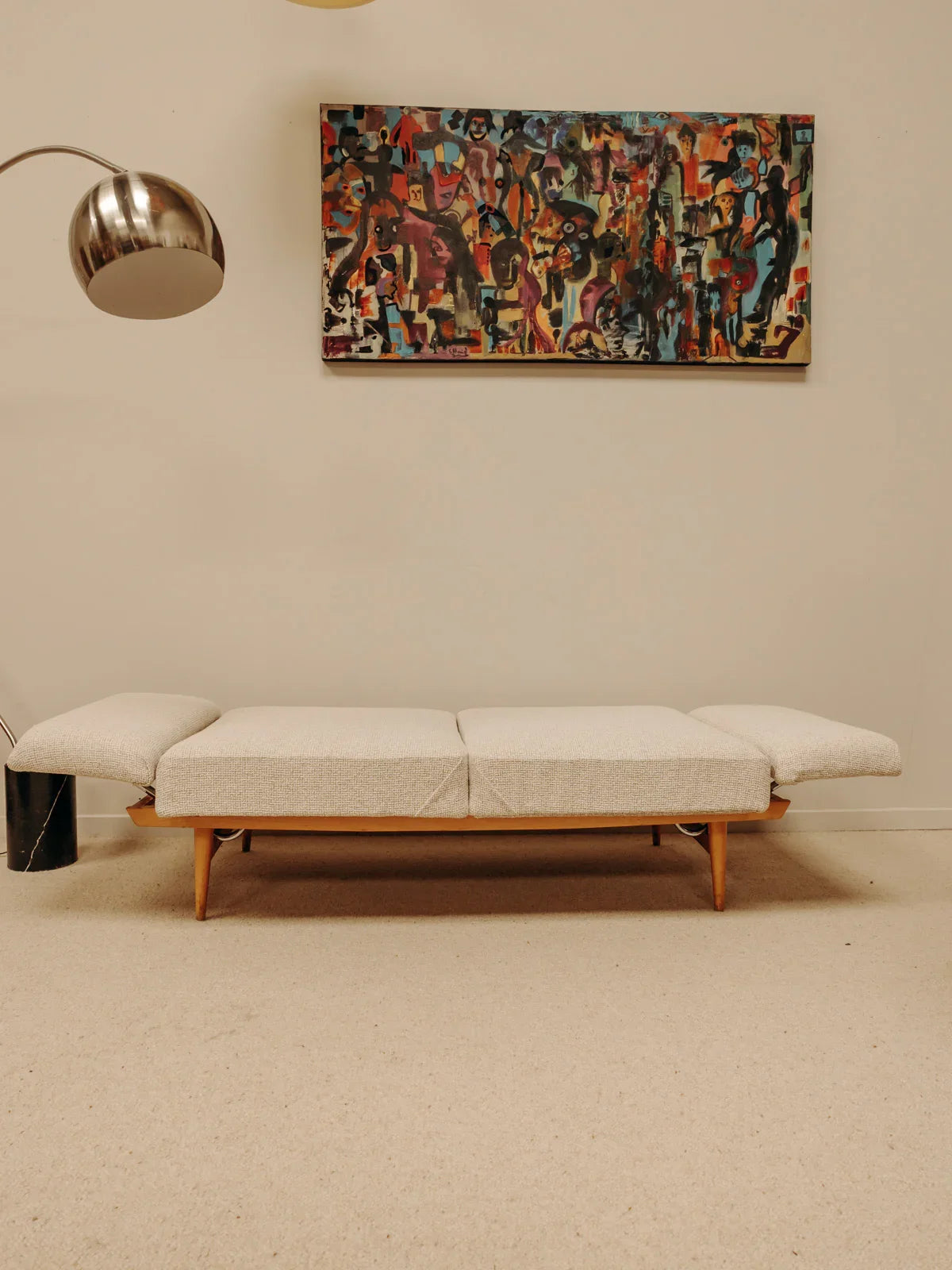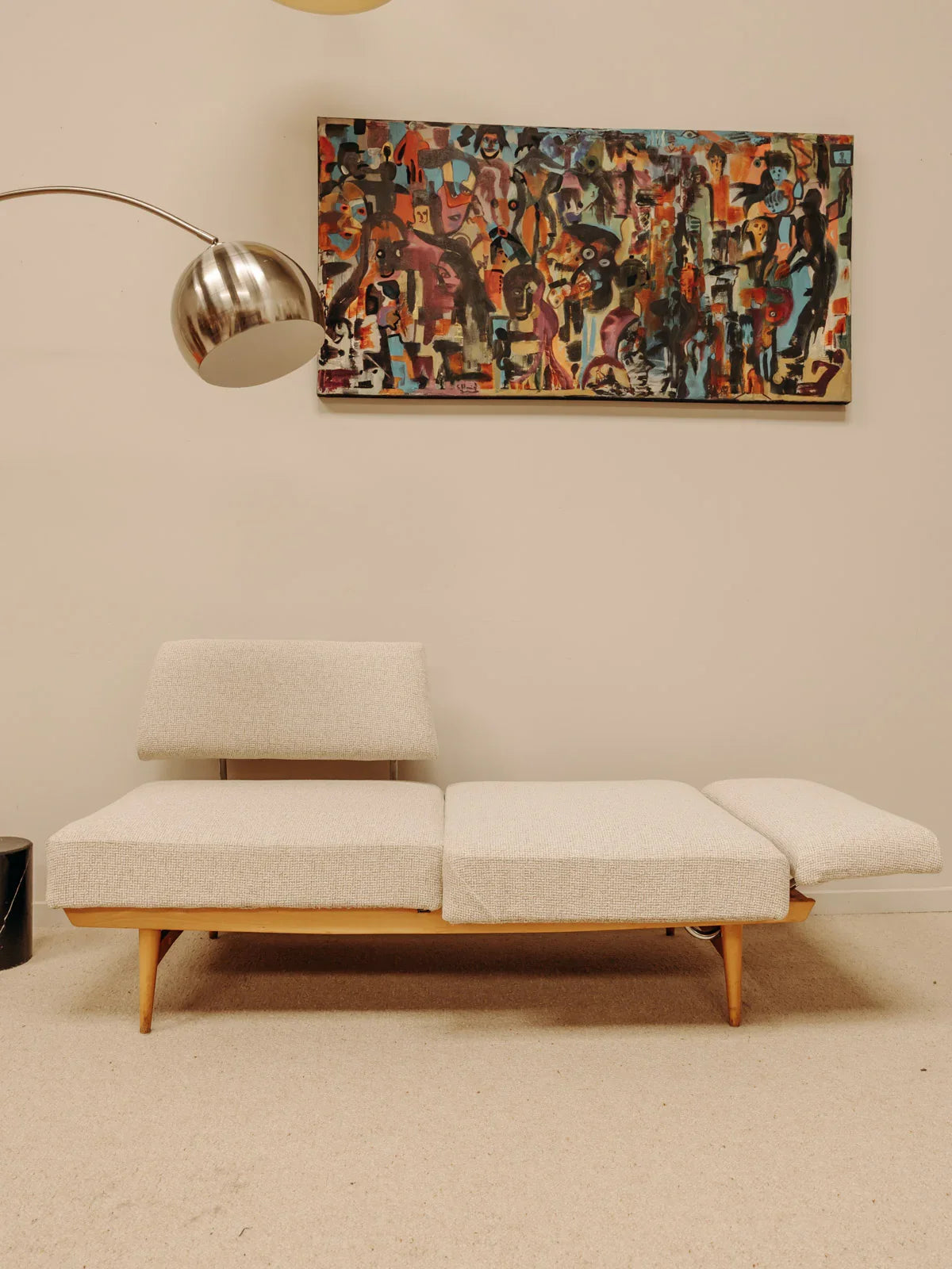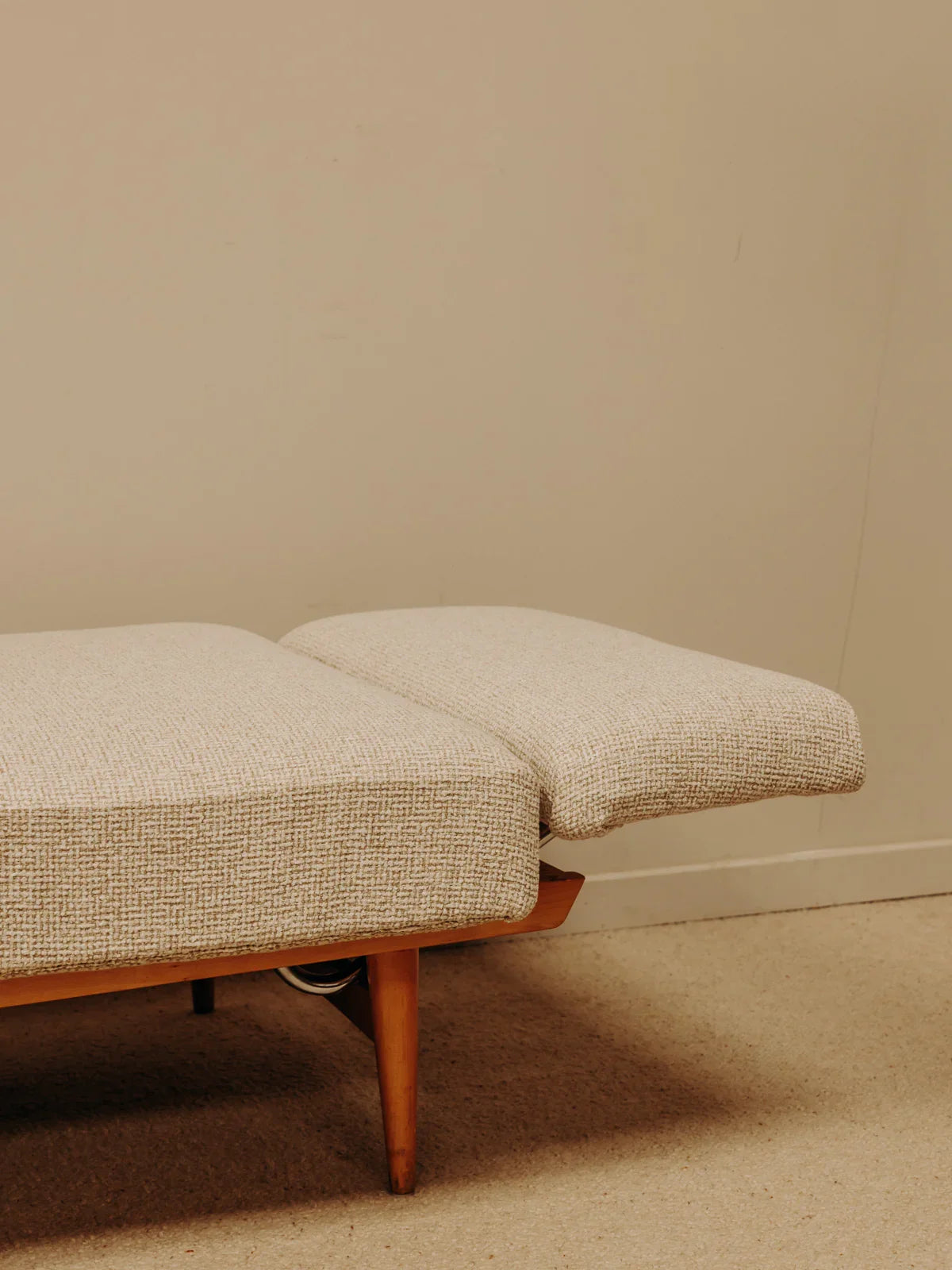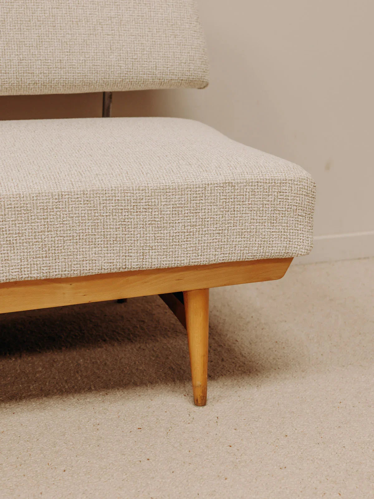 Embrace this beige Scandinavian sofa with its clean, modular design, crafted for comfort and upholstered in newly reupholstered fabric, resting on a light pine base. It easily converts into a daybed, offering ample seating and a convenient extra bed, and its compact size makes it ideal for a living room or studio apartment. The soft hue and warm wood create a bright and soothing atmosphere, perfect for a contemporary interior.