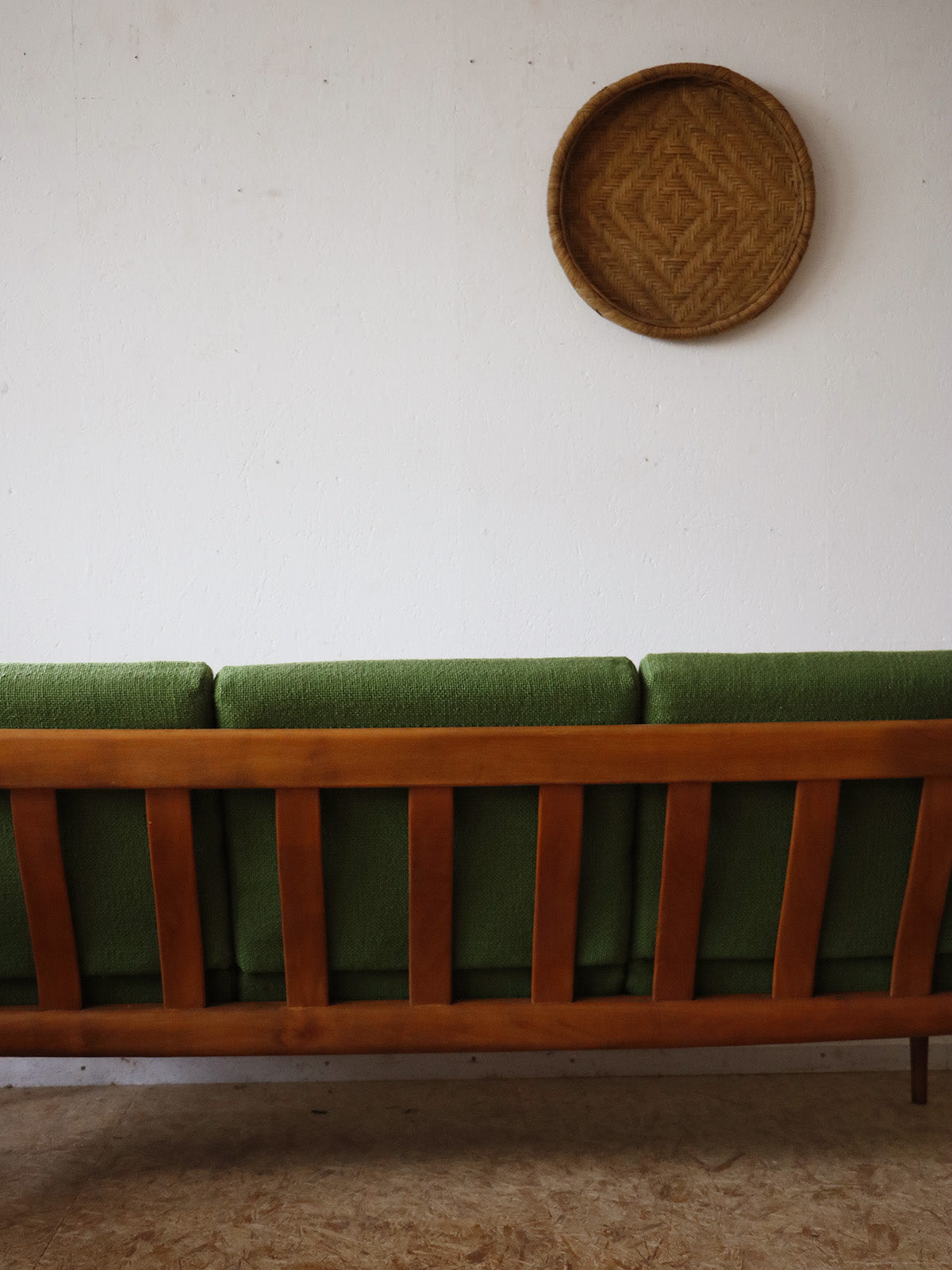 Découvrez cette banquette scandinave en teck des années 60, aux lignes sobres et à l'esthétique chaleureuse. Son système d’assise Free-Span breveté en 1949 garantit un confort souple et durable, tandis que son gabarit généreux accueille confortablement deux à trois personnes. Les coussins verts d’origine apportent une note de couleur authentique et une assise moelleuse, idéale pour un salon lumineux ou une chambre invitante. Sa patine naturelle confère une élégance discrète et intemporelle.