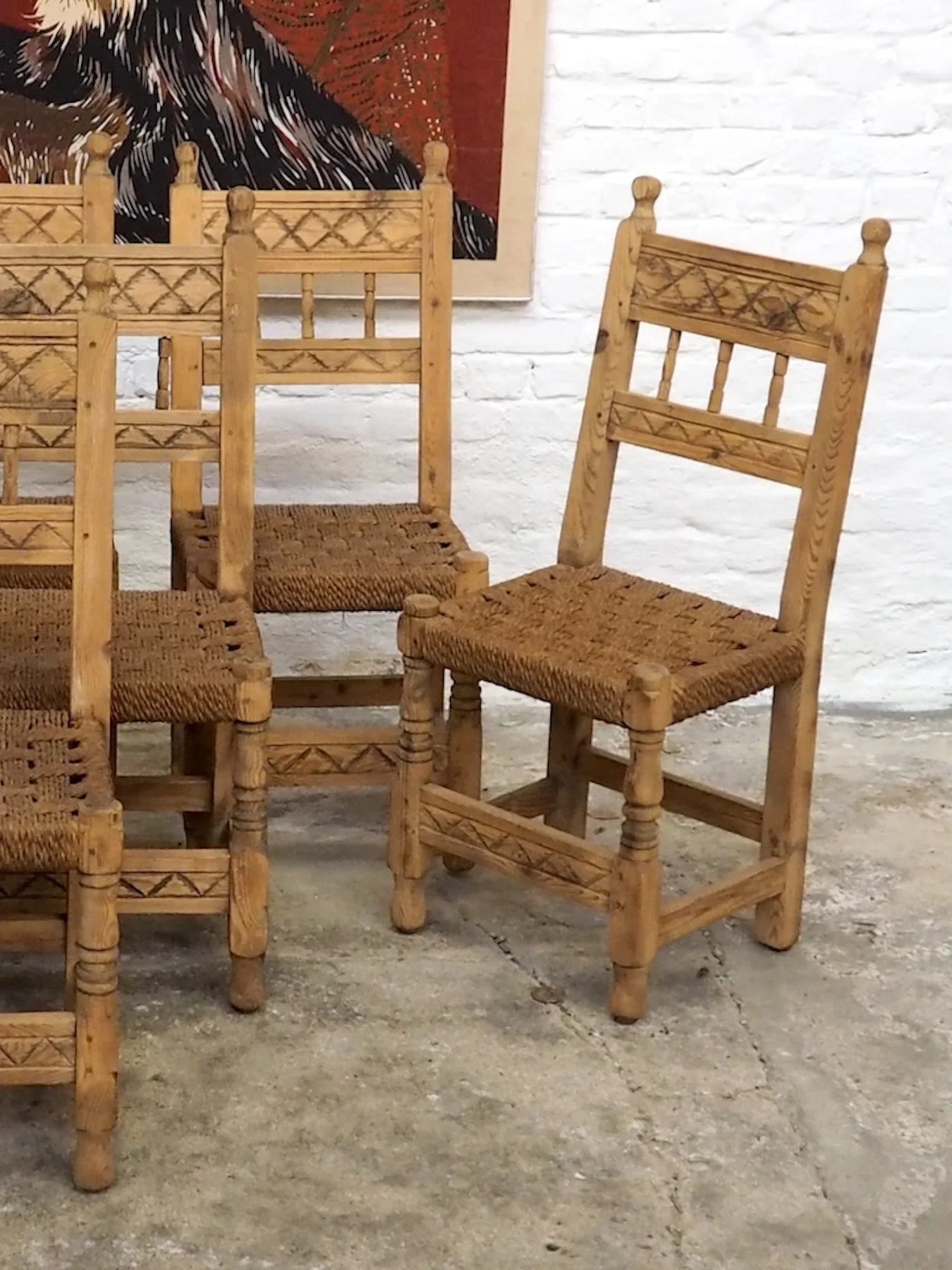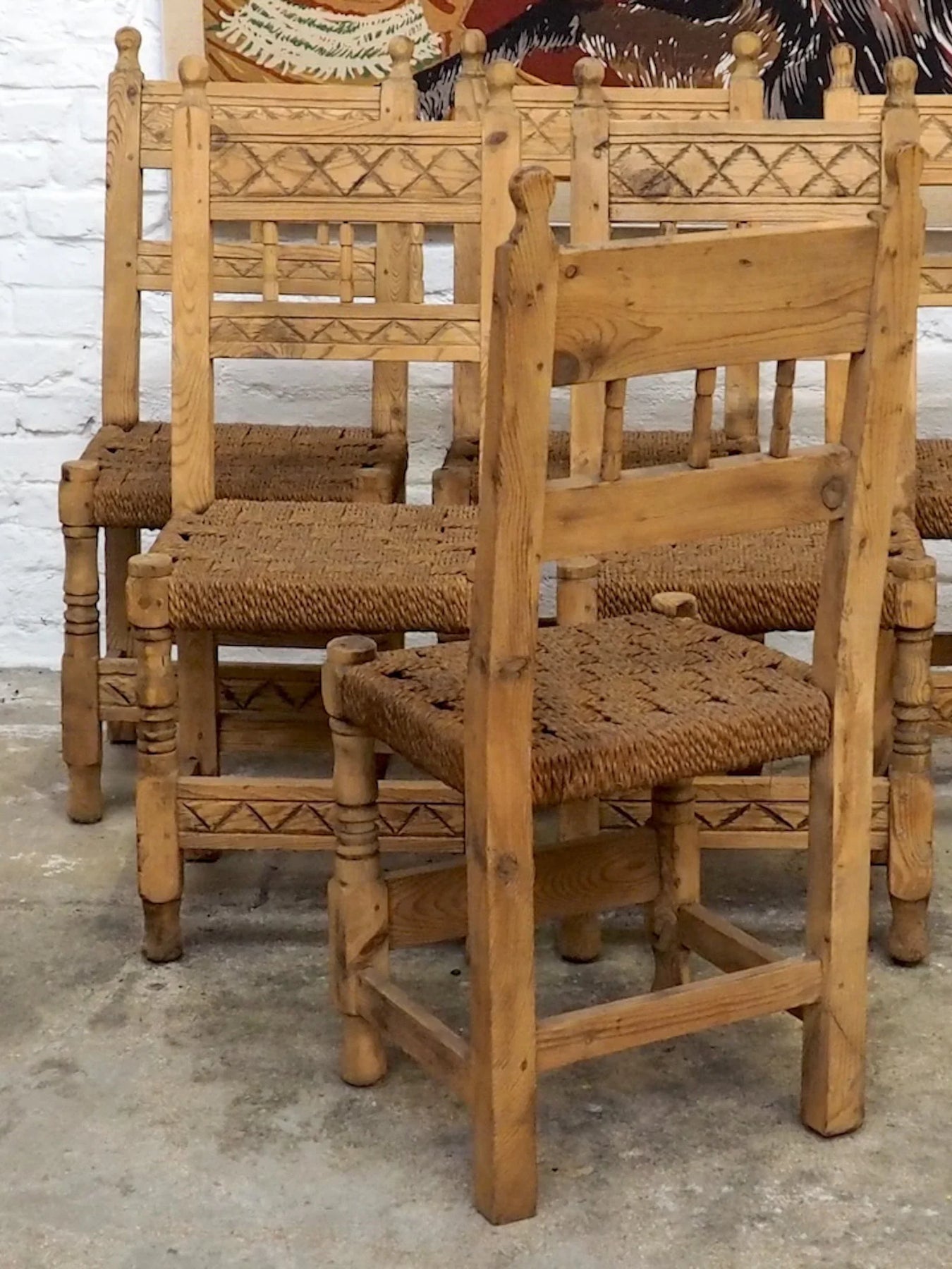 Choose this set of eight pine chairs with checkerboard-style rope weaving, which blends rustic simplicity with handcrafted design. The pine wood provides natural warmth, while the weaving creates a pleasing interplay of textures, ideal around a large dining table or in a cozy dining area. Their carefully considered proportions offer a welcoming seat and an understated presence that establishes a relaxed and elegant atmosphere.