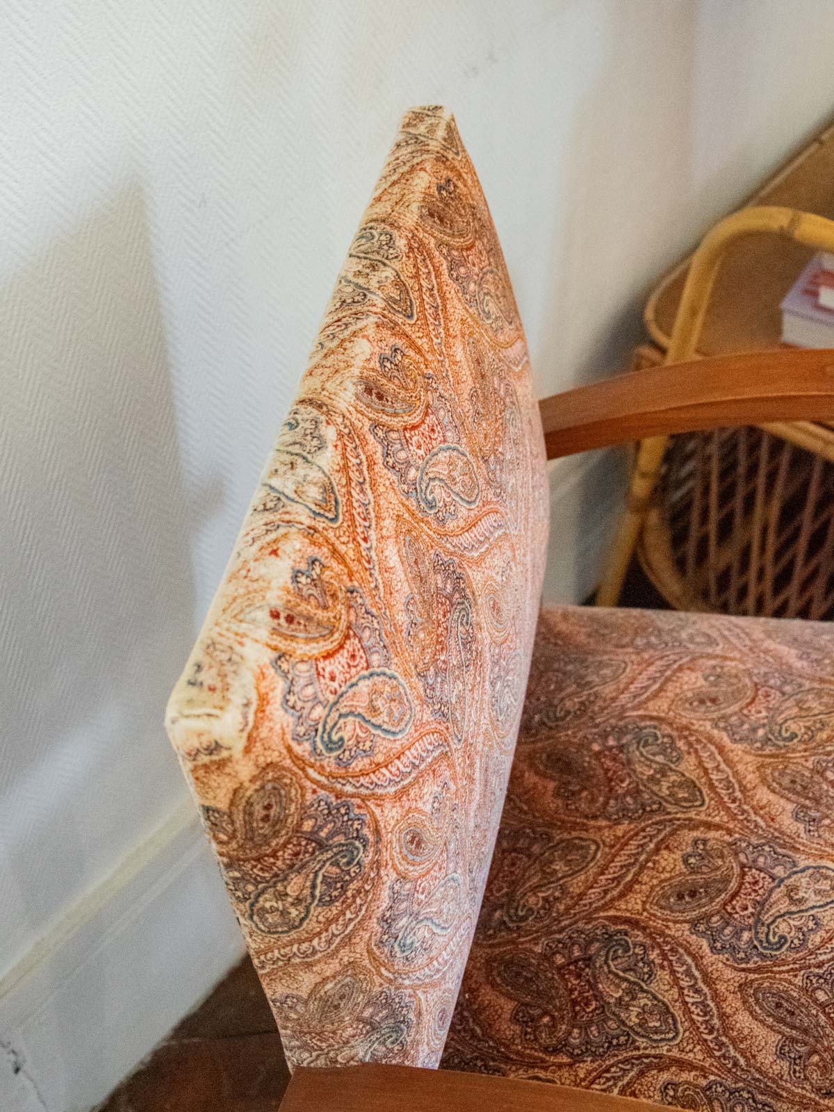 Embrace this chair with its delicately grained light wood legs, upholstered in a Persian-style fabric with burgundy, orange, and brown hues that bring warmth and character. Its balanced proportions and inviting seat make it a versatile piece for a dining room or reading nook, combining comfort and retro elegance. The wood's sturdiness underscores its everyday use while enhancing a warm and refined atmosphere. Minor marks on the fabric and wood.