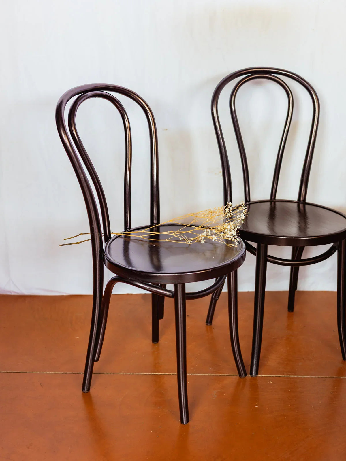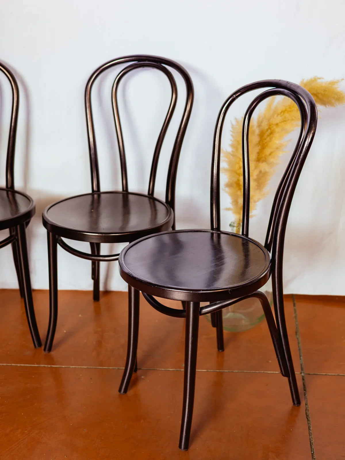 Adopt this set of four Claude chairs with rounded wooden backs and a black finish, in good condition, offering an elegant balance between a bistro feel and contemporary lines. Their welcoming seats and carefully designed height ensure comfort suitable for a dining table or a coffee corner, while the wood brings natural warmth and lasting durability. Their compact silhouette makes them easy to arrange, for a convivial and graphic ambiance.