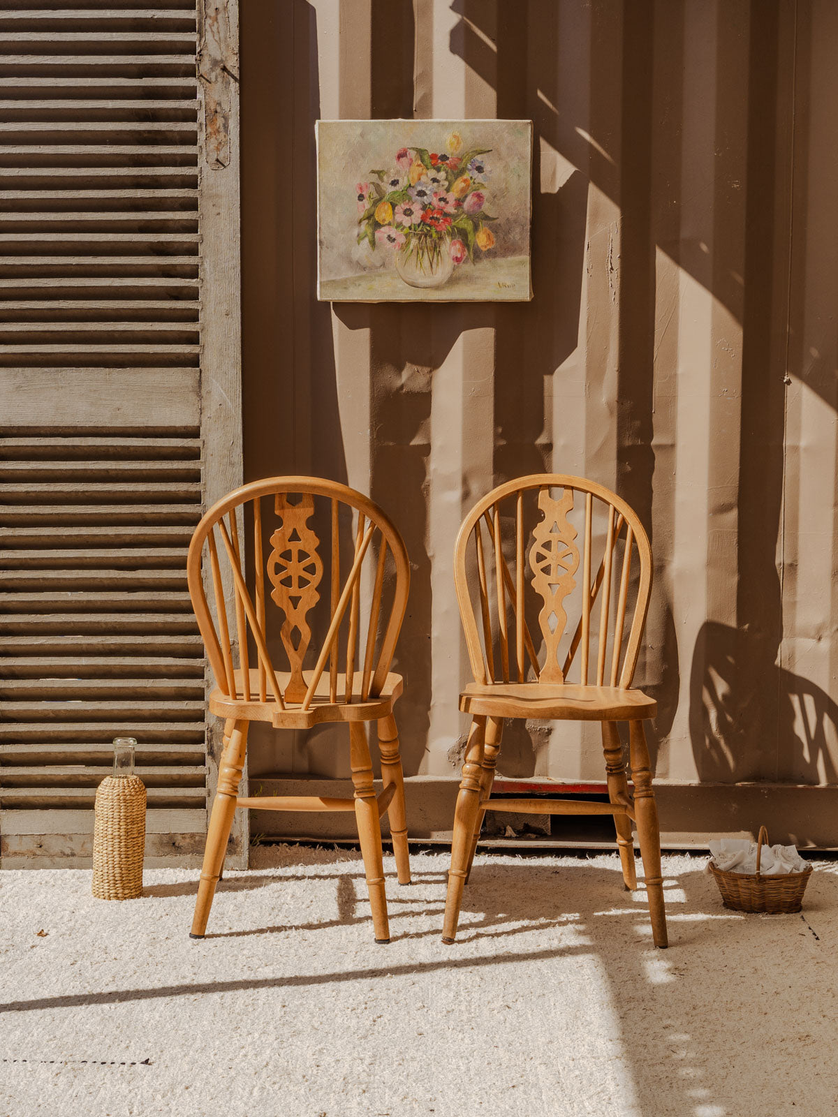 Invite this set of six wooden Windsor Wheelback chairs, dating from 1998, which brings discreet and welcoming elegance to the dining room or breakfast nook. The luminous wood and slender backrest spindles offer an airy and balanced silhouette, designed for comfortable proportions around a family table. Their inviting seat and natural patina create a warm and timeless atmosphere. Some signs of age.
