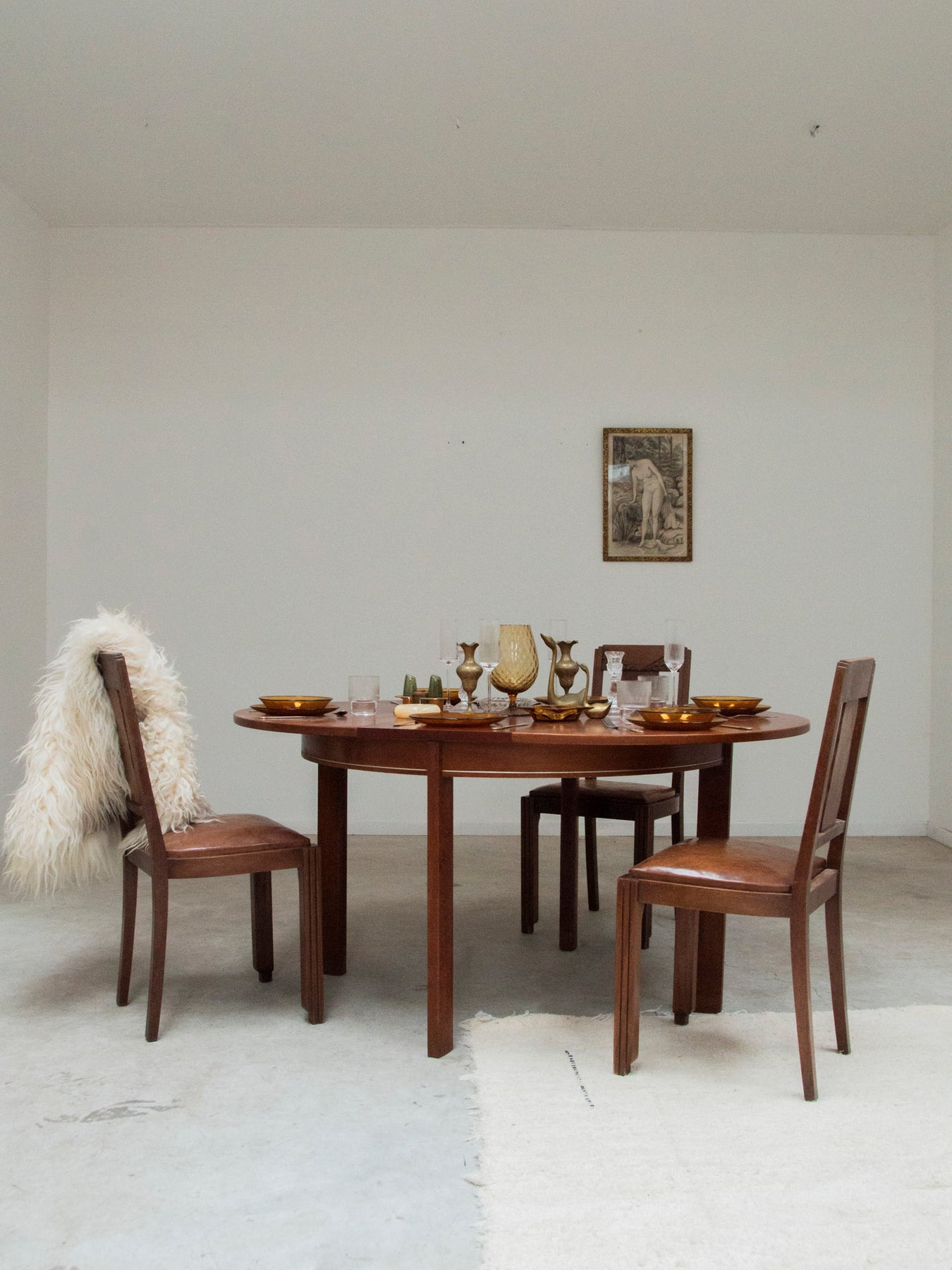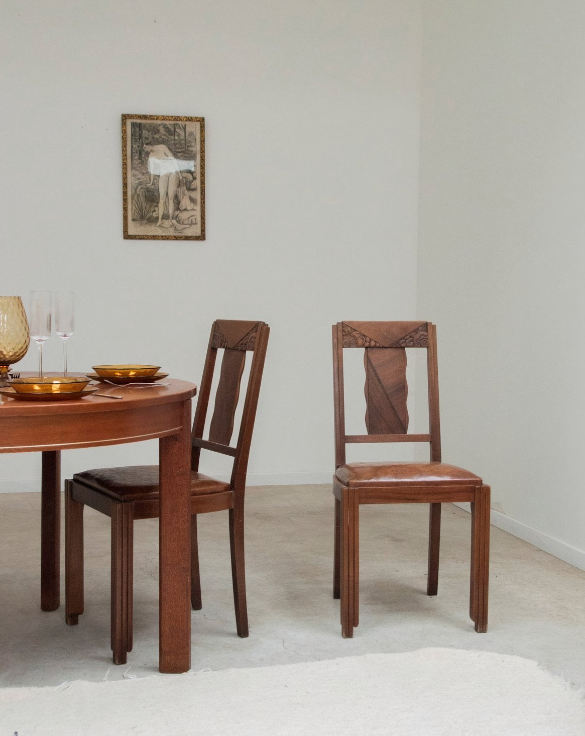 Embrace this pair of Art Deco chairs with their dark, velvety carved wood and delicately crafted, slender backrests. The brown vinyl seats offer inviting comfort, while their elegant proportions make them equally at home around a dining table or as accent seating in a living room or office. The contrast between the sculptural frame and the smooth upholstery creates a refined look, ideal for both vintage and contemporary décor. Sold as a pair, two pairs available.