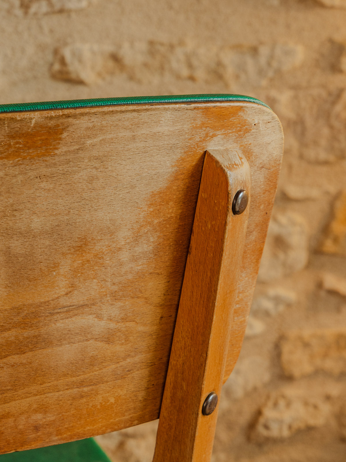 Embrace this vintage green chair with its understated charm. Upholstered in green faux leather that highlights the seat and back, it rests on a light wood frame with clean lines. Its balanced proportions make it easy to place around a table or in a reading nook, adding a touch of refined retro style and a welcoming seat. Its warm hue adds warmth to the room without being overwhelming, ideal for a cozy and understated decor. A few signs of wear only add to its authenticity.