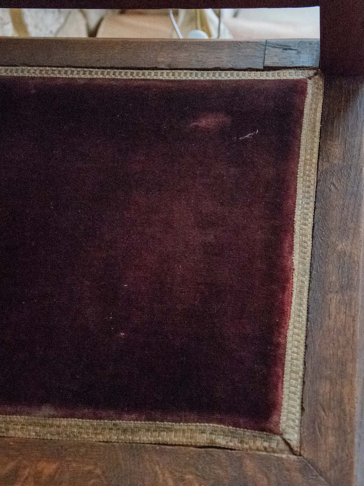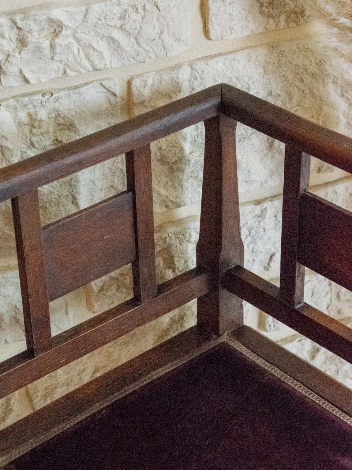 Embrace this corner armchair upholstered in rich burgundy velvet with gold piping, set upon a delicately lined wooden frame. Its enveloping seat invites reading or conversation, bringing a sophisticated and welcoming touch to a living room, bedroom, or relaxation area. The contrast between the softness of the velvet and the solidity of the wood creates an elegant presence, perfect for creating a refined and intimate atmosphere.