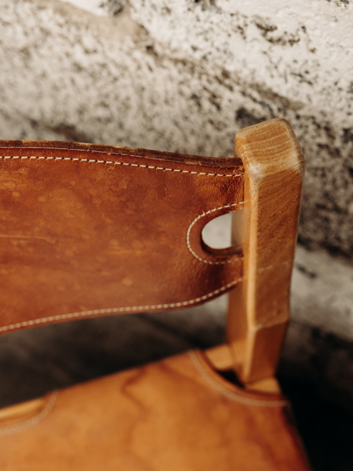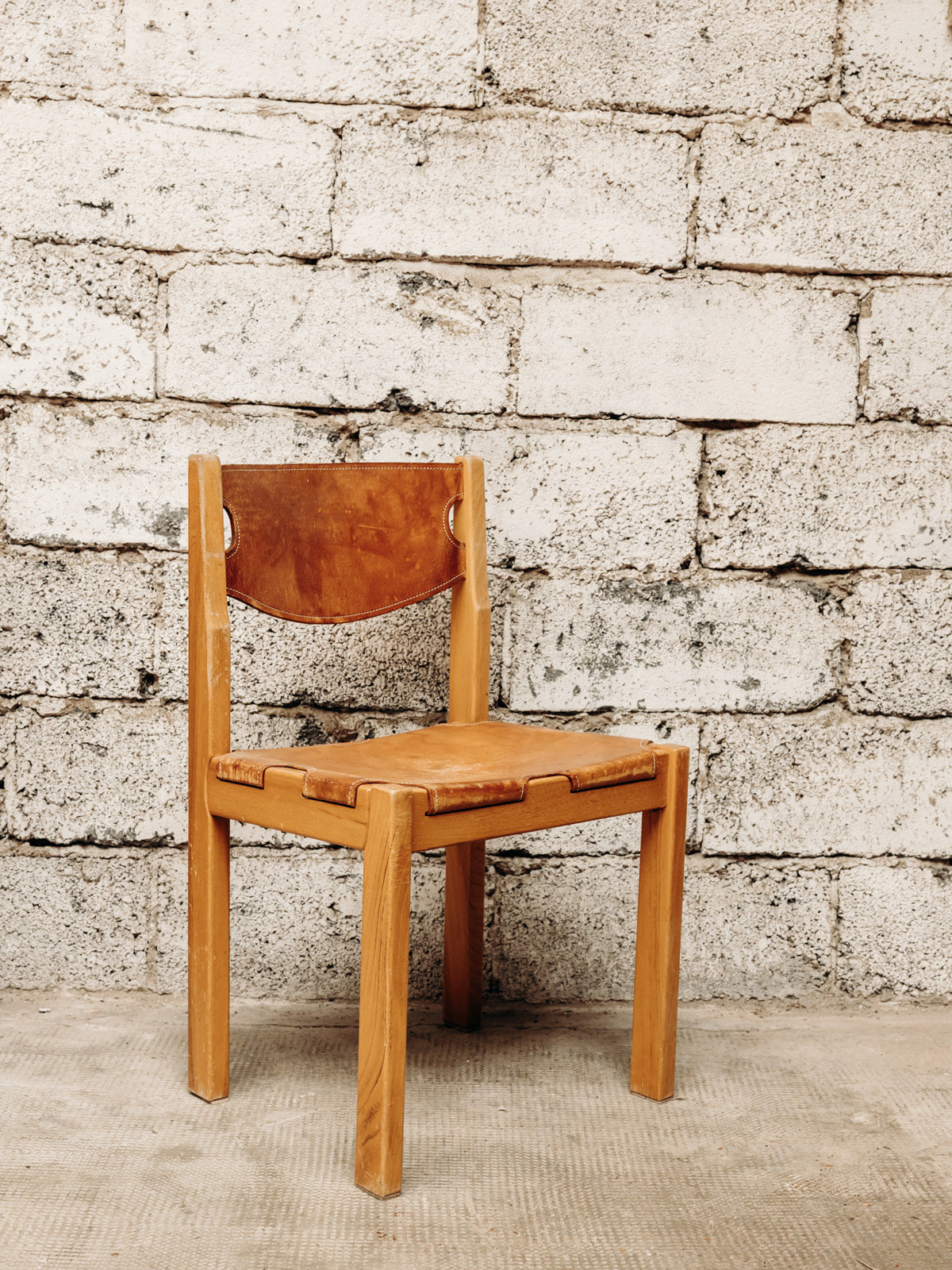 Add a touch of warmth and authenticity to your home with this brown leather and light wood chair. The leather seat and back provide immediate comfort, while the straight legs and simple silhouette evoke a natural style, perfect around a table or as an occasional chair. Its balanced proportions ensure a discreet yet assertive presence in a dining room or reading nook. Minor signs of age are present.