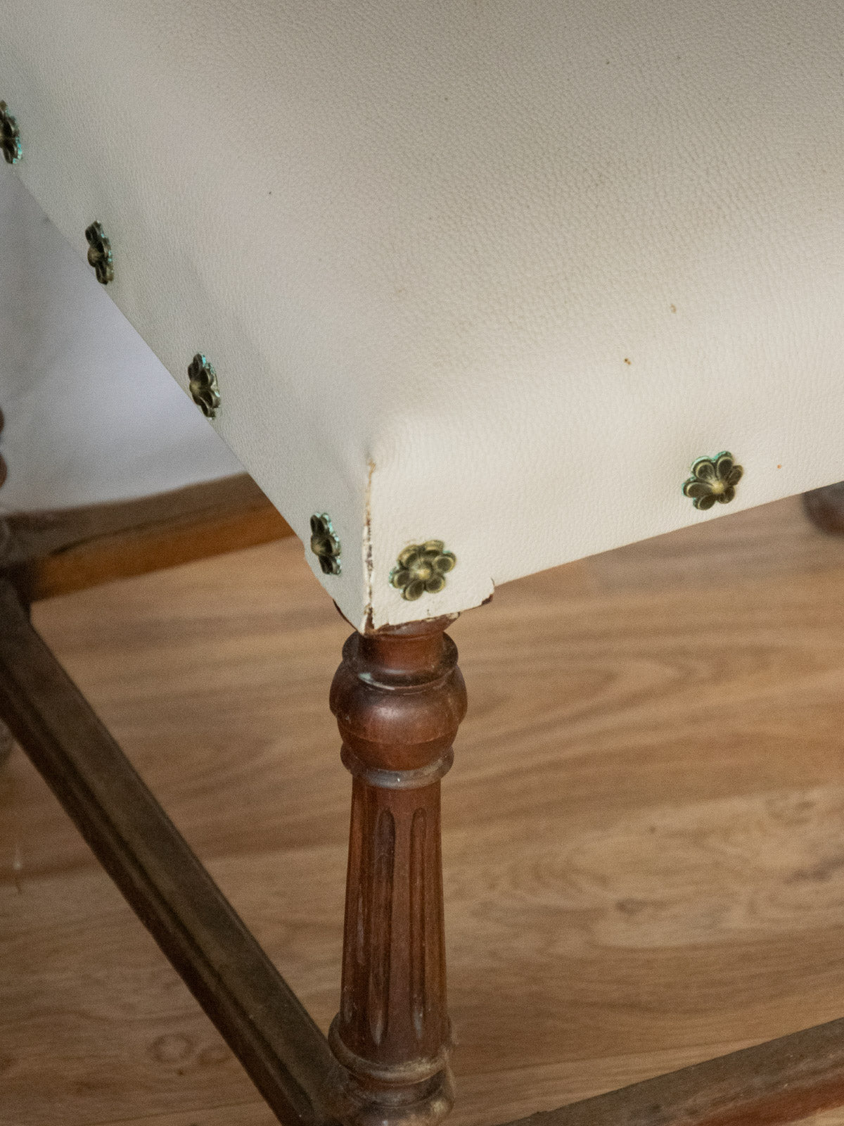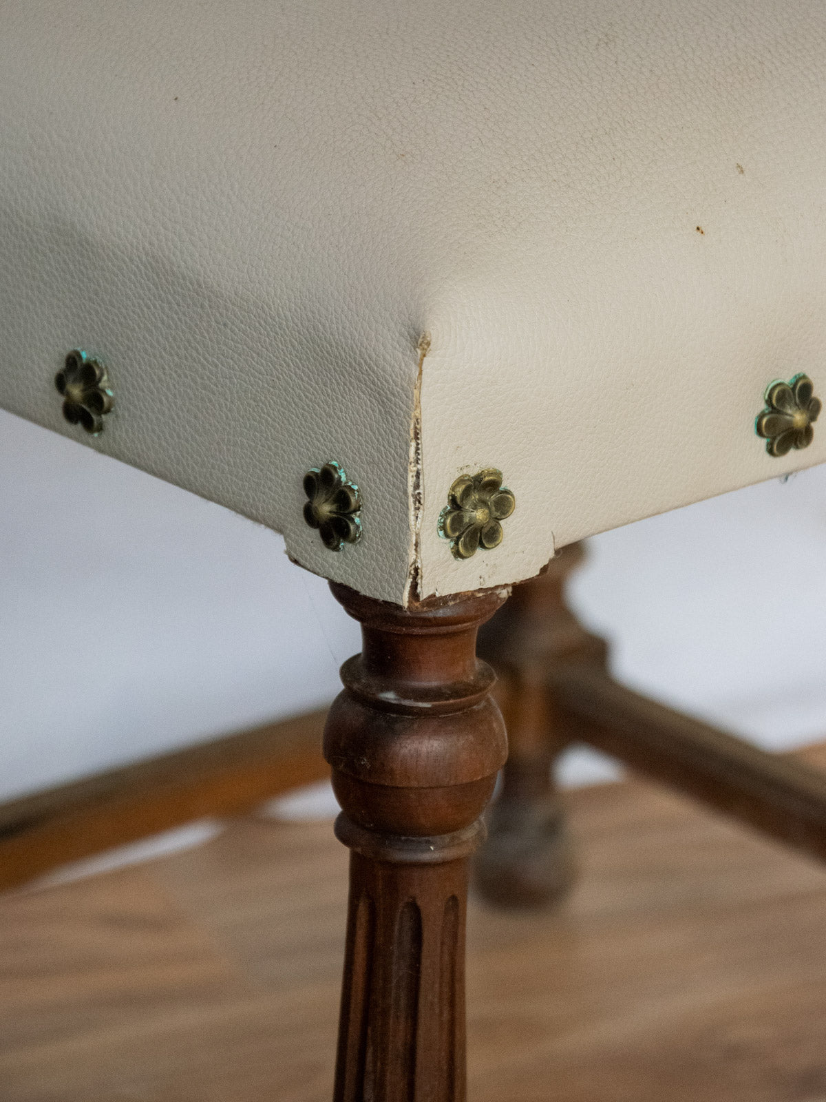 Adoptez cette chaise à assise carrée en bois foncé finement sculpté, où le travail du bois dialogue avec une assise en cuir beige refaite à neuf. Les clous fleuris soulignent la silhouette d'une touche raffinée, tandis que ses proportions compactes en font une pièce polyvalente pour une table à manger, un bureau ou un coin lecture. Son allure classique et chaleureuse instille une ambiance élégante et accueillante, idéale pour enrichir un intérieur aux accents traditionnels comme contemporains.