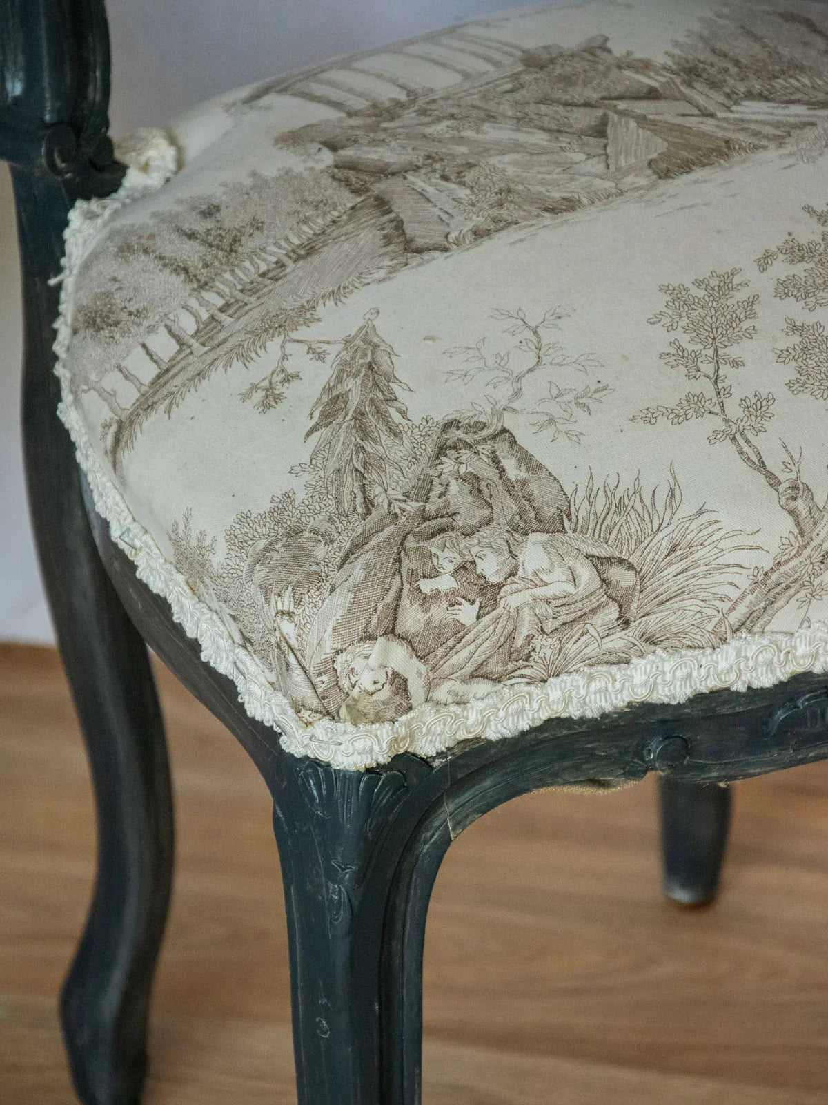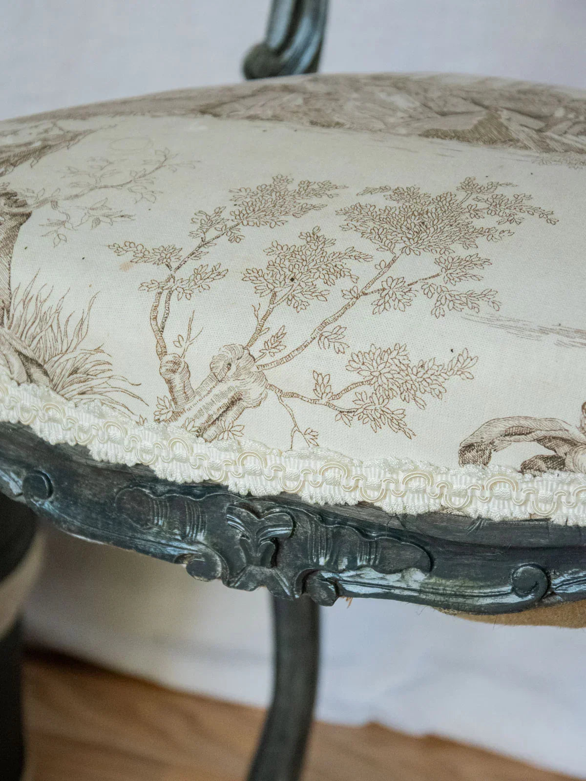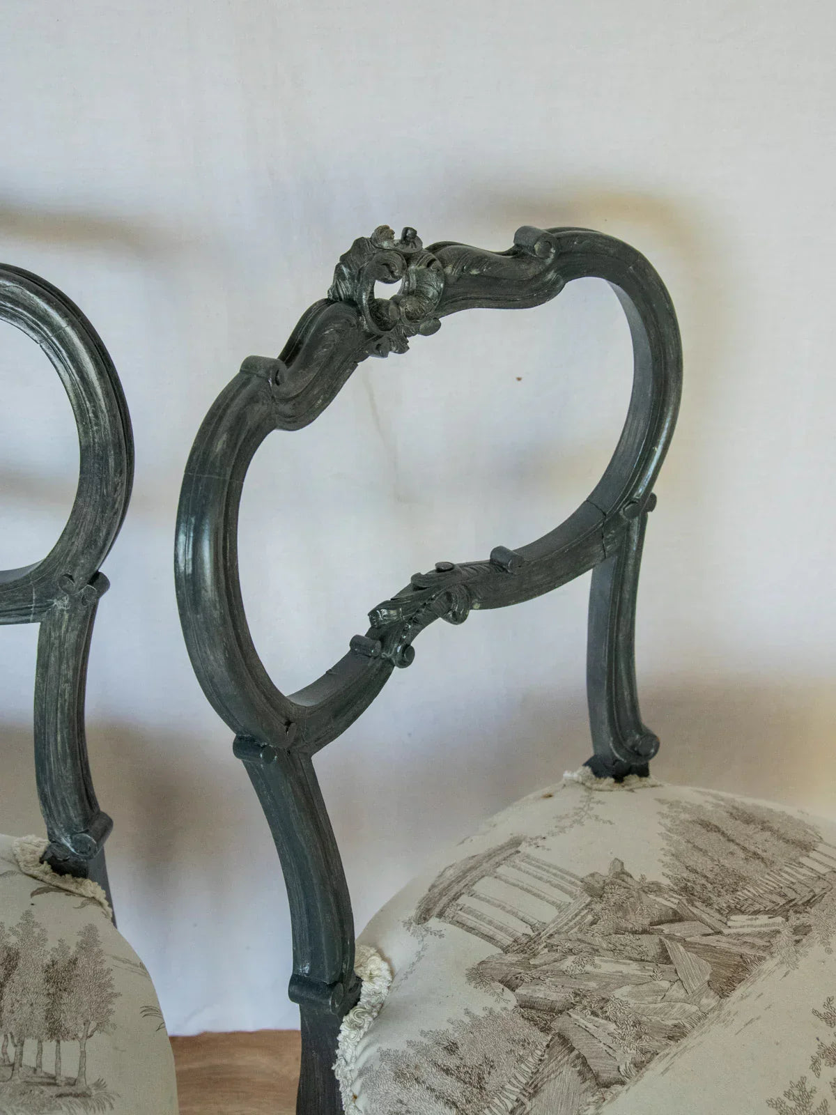 Adopt this set of two fully restored Napoleon III chairs, upholstered in a delicate Toile de Jouy fabric. The wood has been restored to its original curved lines and characteristic shape, offering comfortable and well-proportioned seating for a dining room or reading nook. The printed fabric adds a touch of rustic refinement, warming the atmosphere without overwhelming the space. The care taken with the frame and upholstery highlights their authenticity and elegance, with the fabric bearing the marks of time.