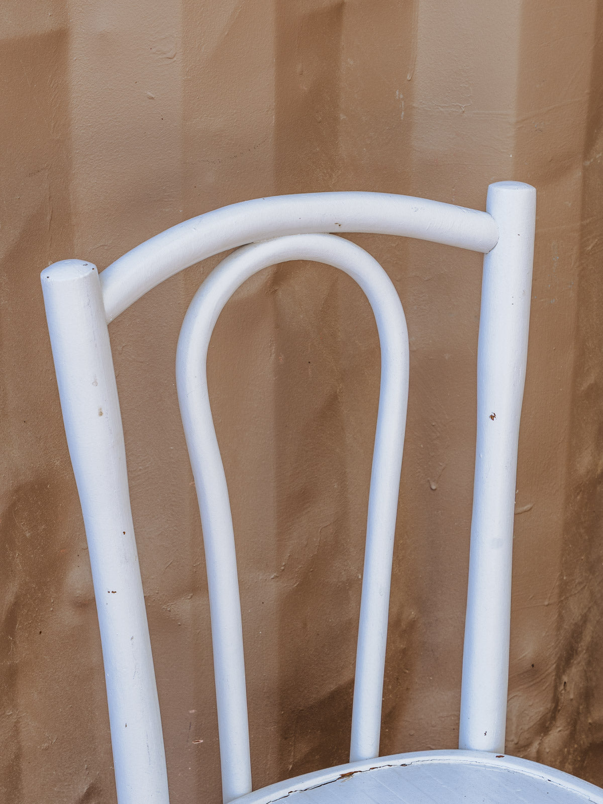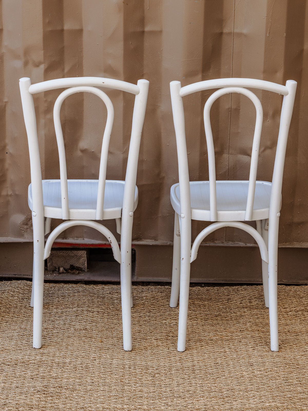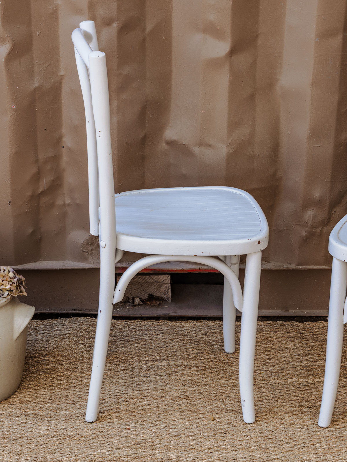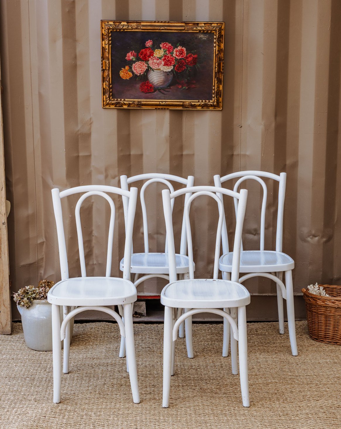 Bring bistro charm to your dining room with this set of four wooden chairs in a white and light gray finish, featuring simple and inviting lines. Their proportions and seats make them ideal for a dining area, while the subtle piping on the seat adds a touch of refinement. The wood and its soft patina create a warm and elegant atmosphere, easily fitting into a contemporary or retro interior. Some signs of age are present.