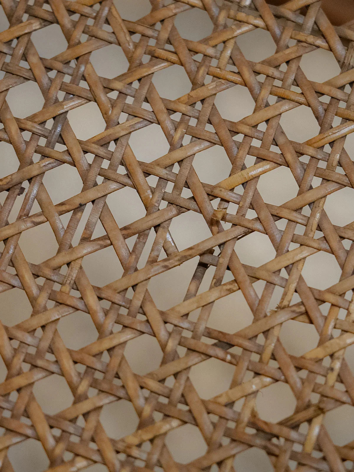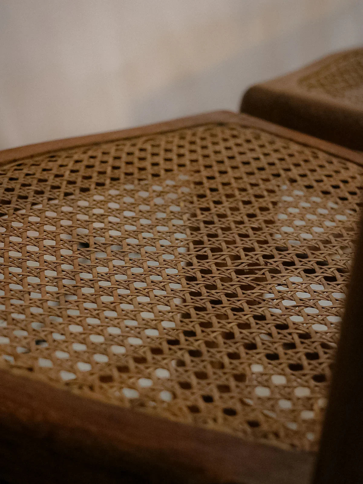 Embrace this pair of 1940s chairs crafted from dark solid wood, enhanced by machine-made caning that adds lightness and character. With their balanced proportions and comfortable seats, they fit perfectly around a dining table, in an entryway, or in a reading nook, creating a warm and retro atmosphere. A piece of caning is missing from one of the seats. A few signs of wear only add to their authenticity.