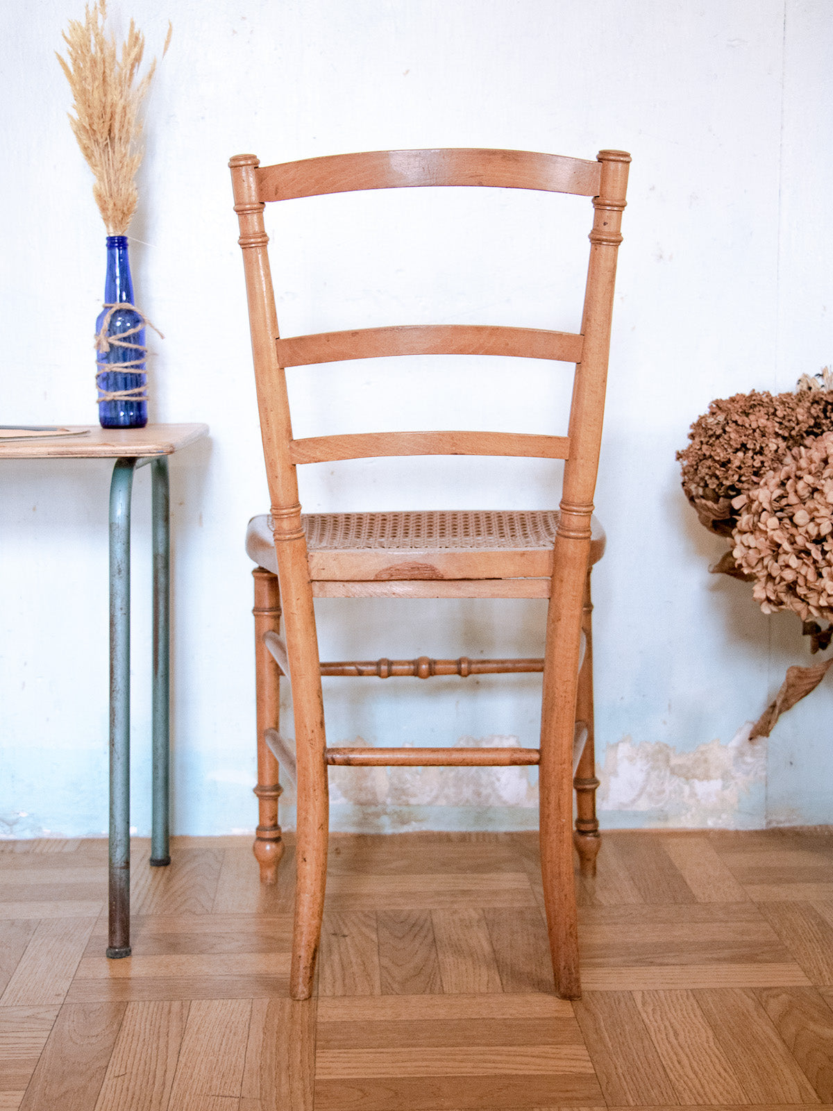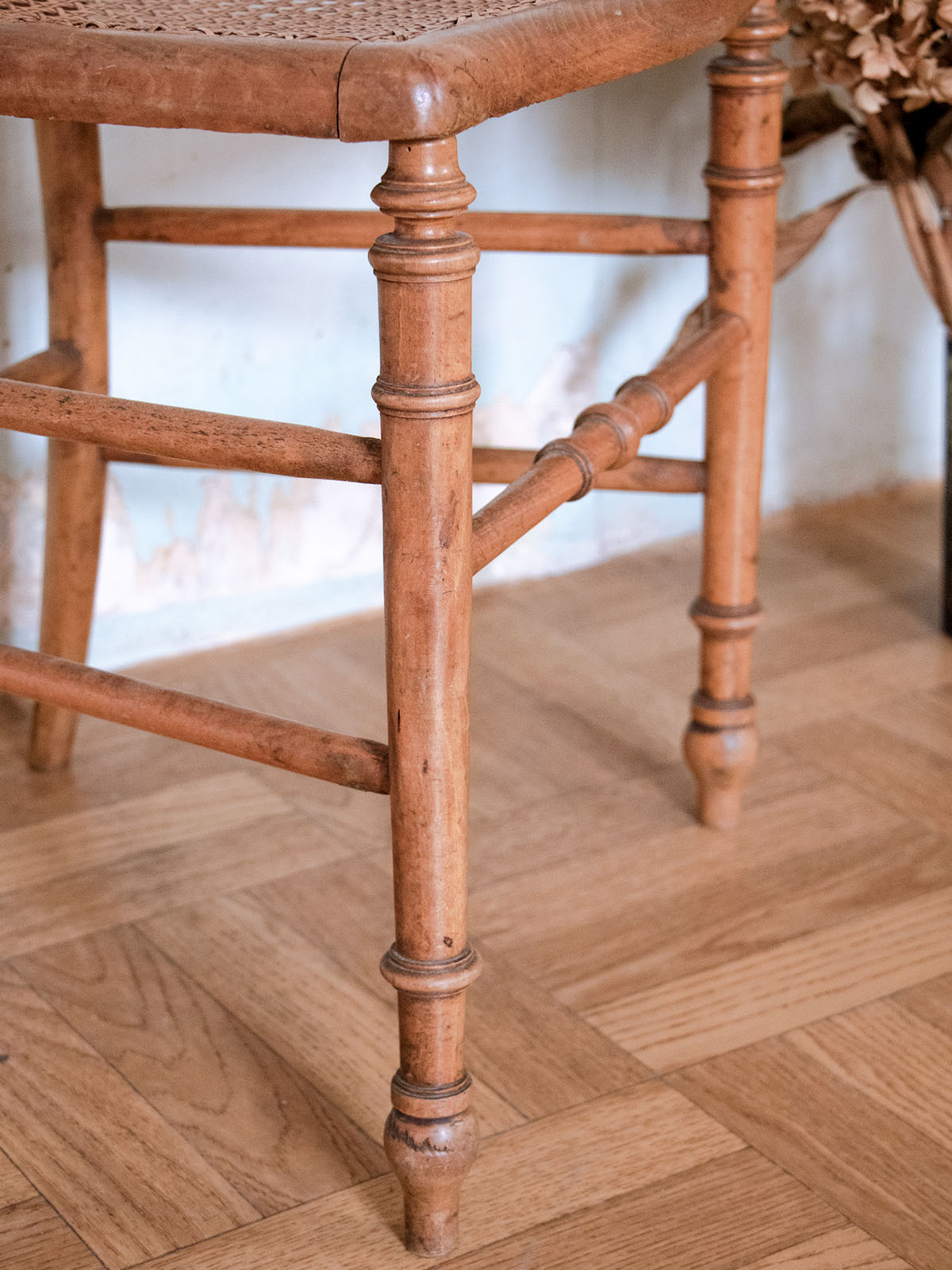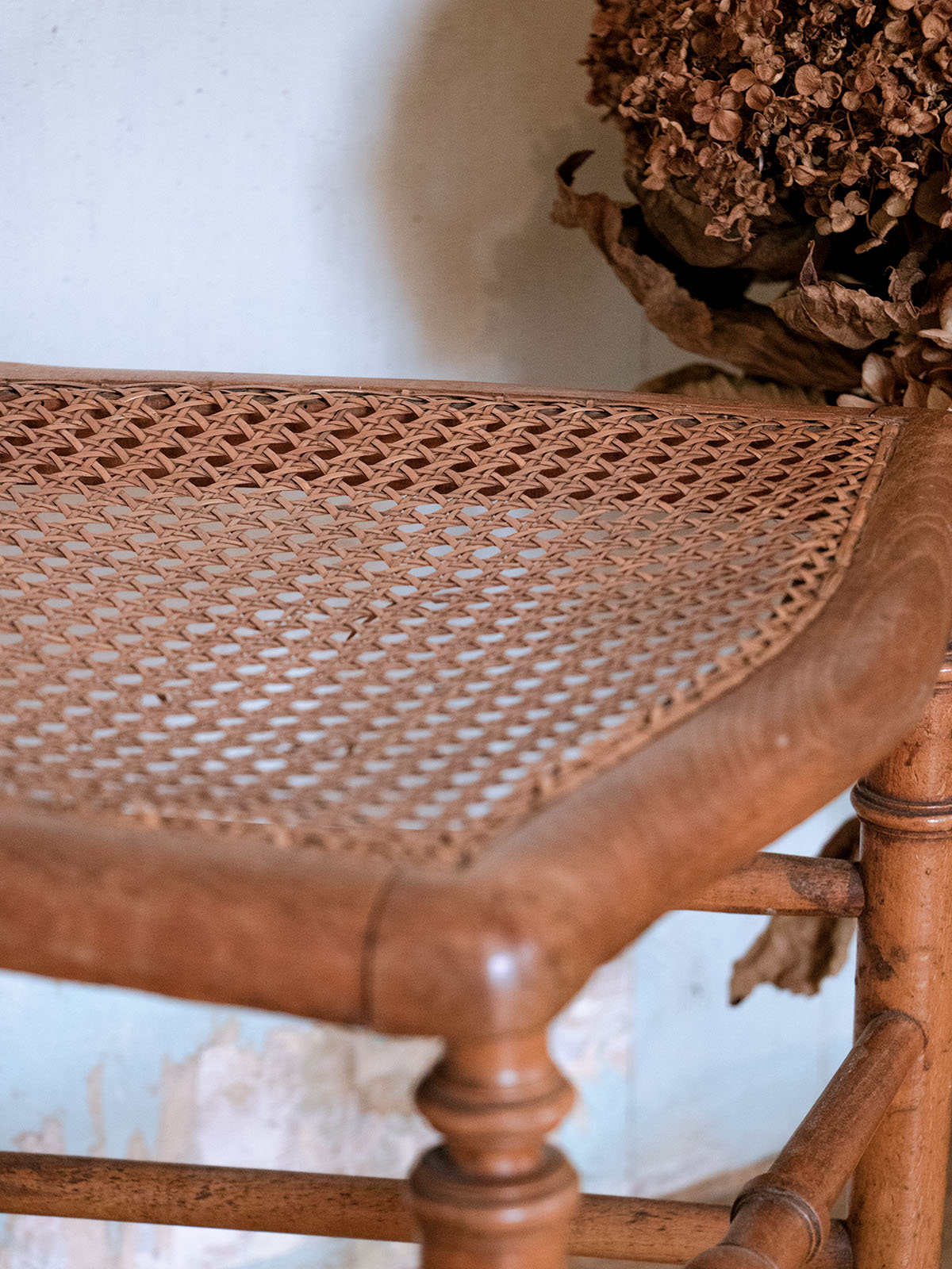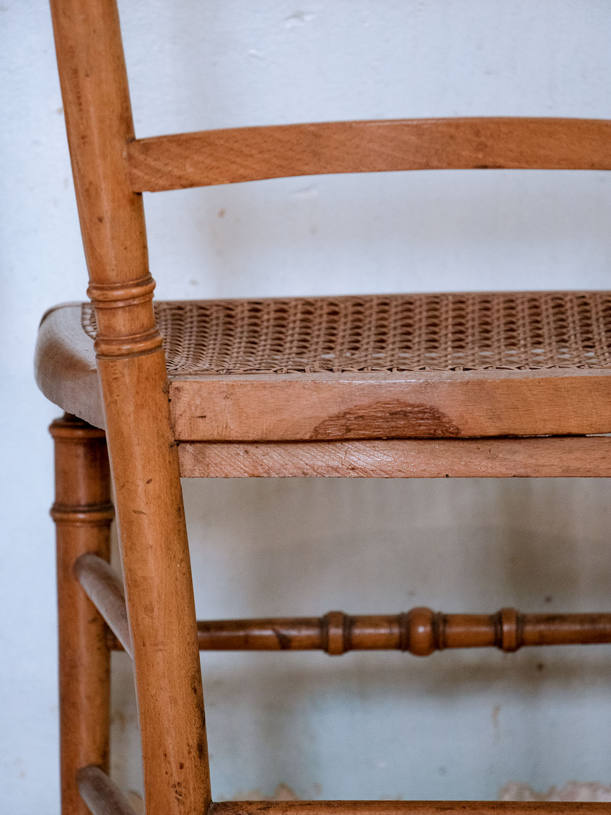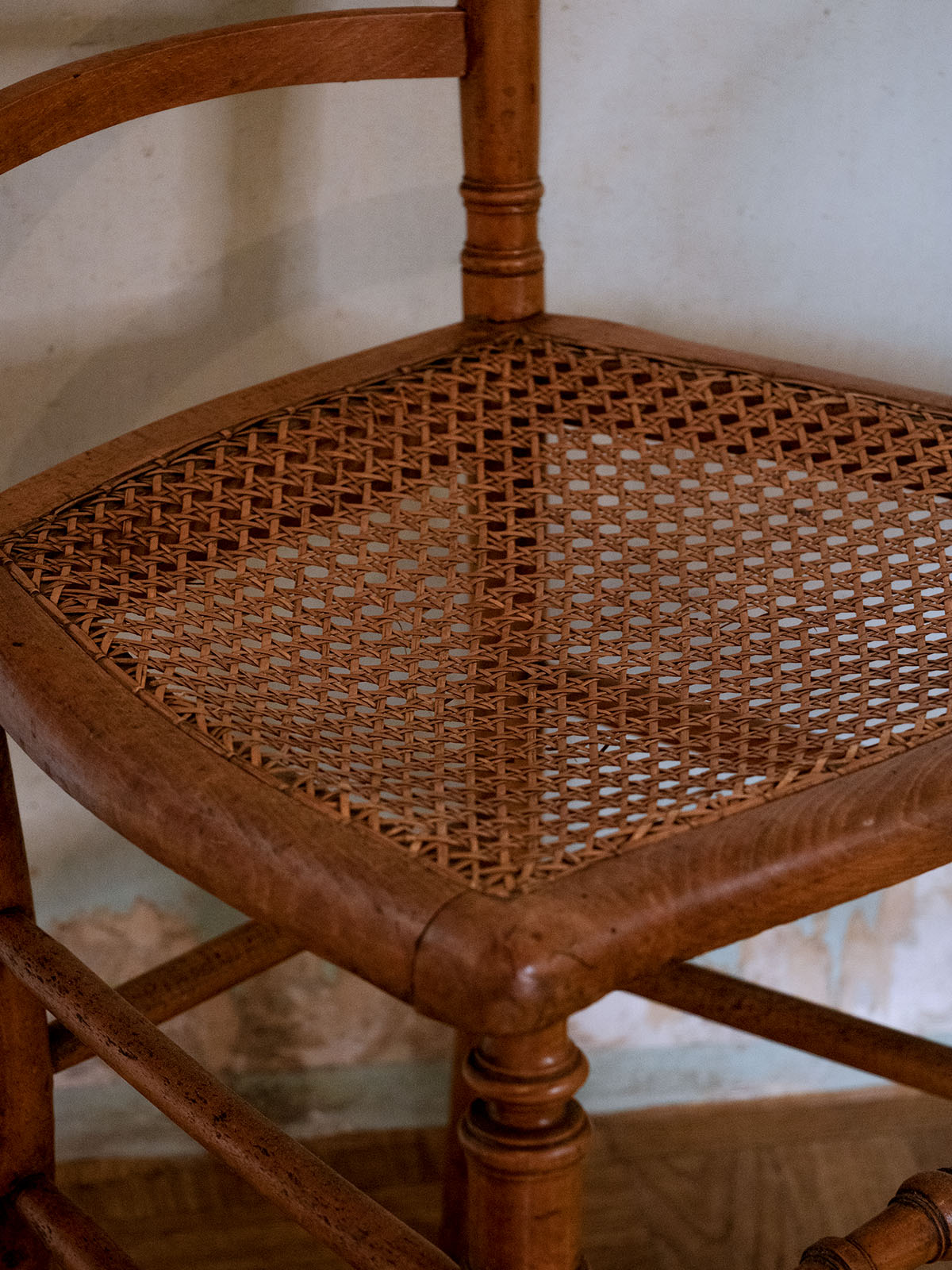 Embrace this early 20th-century chair crafted from dark-stained poplar, featuring a caned back whose understated elegance brings a warm presence to a dining room or reading nook. Its well-proportioned structure offers a comfortable seat and a slender silhouette that complements both contemporary and classic interiors, while the gently slack caning lends it an authentic charm. Minor signs of age are present.