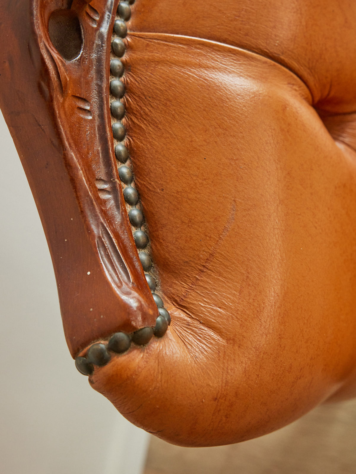 Embrace this baroque-style chair in brown leather, where the patinated leather and sculpted wood create a classic profile that is both reassuring and refined. Its generous seat and buttoned upholstery offer enveloping comfort, inviting reading or long conversations. Easy to integrate, it complements both a contemporary living room and a traditional office, bringing a warm ambiance and an elegant presence that transforms the space.