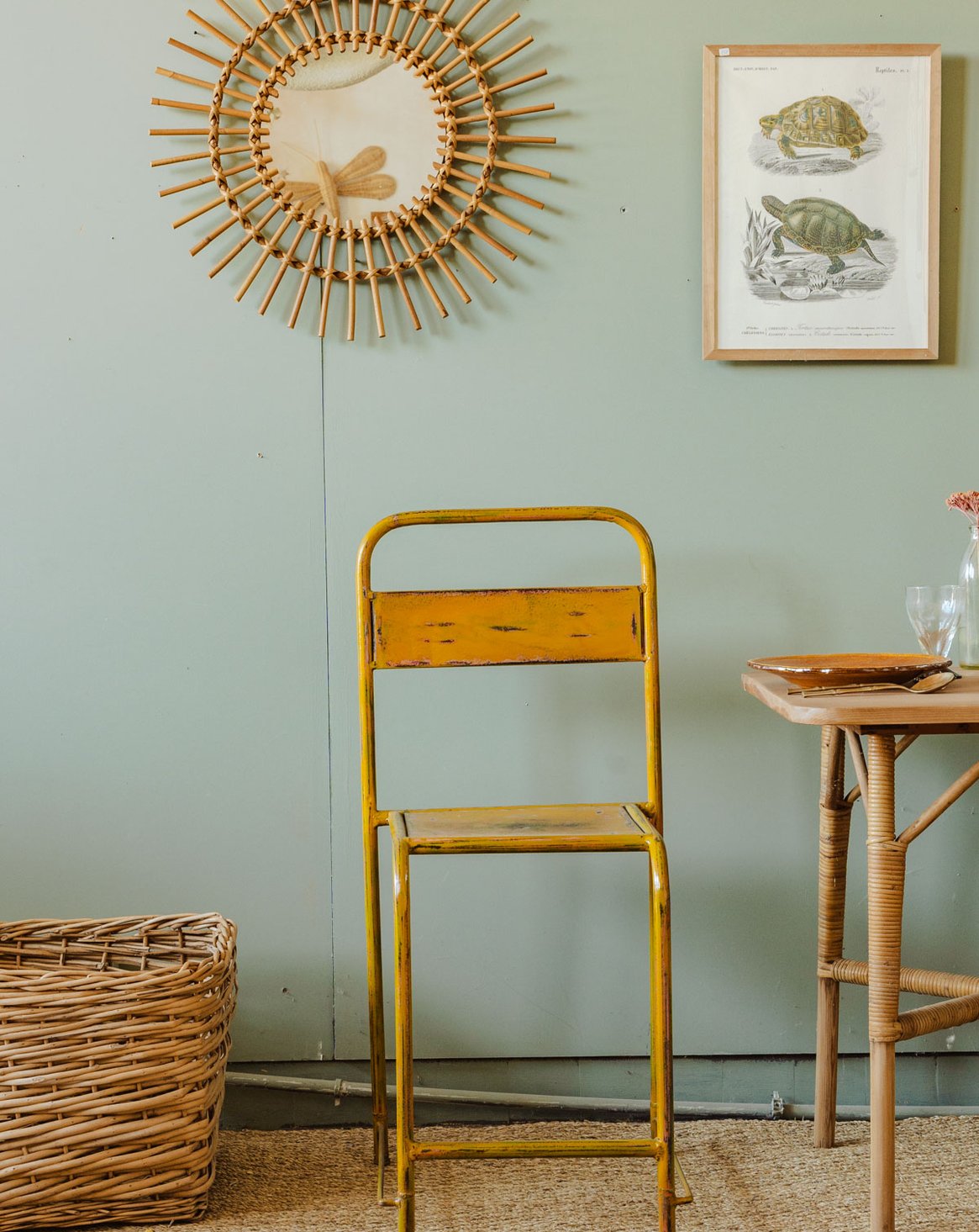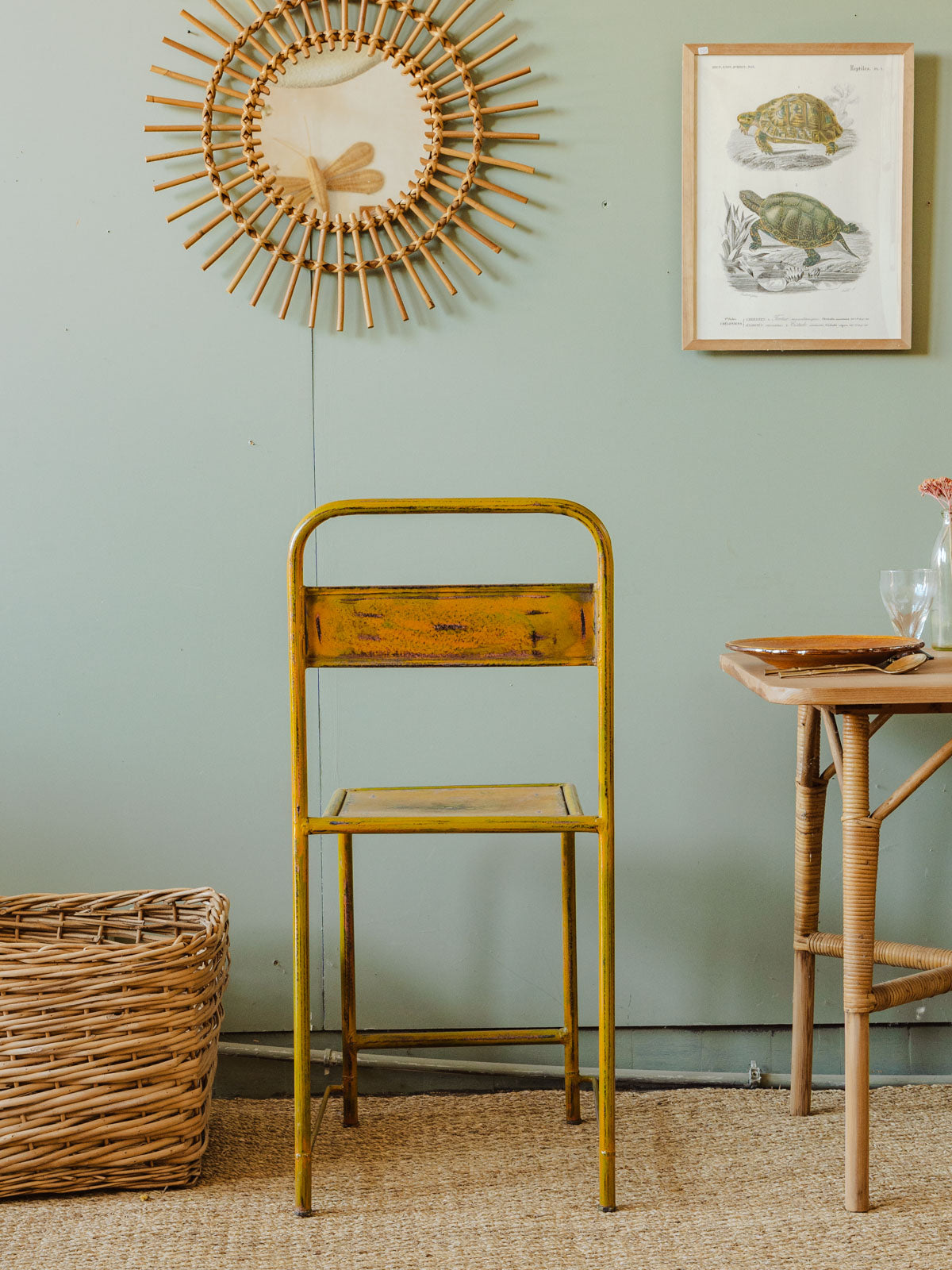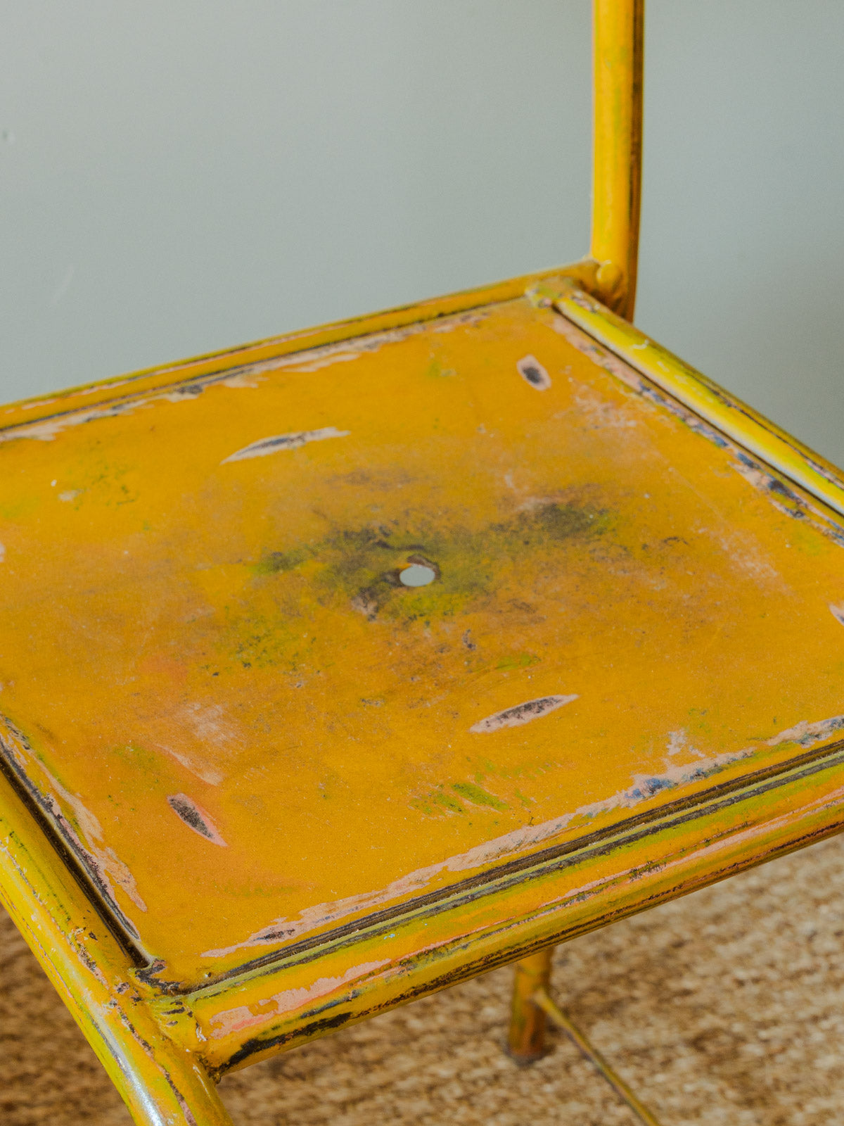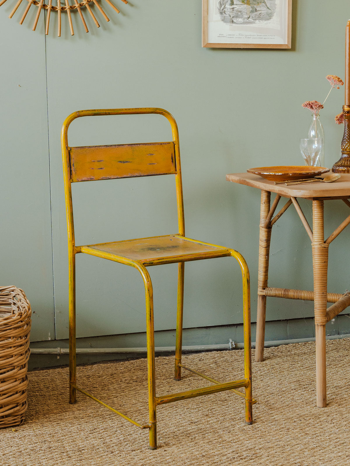 Embrace this vintage-style, patinated yellow metal chair, which brings a bright, industrial touch to a kitchen, office, or covered patio. Its compact size and balanced proportions ensure a stable and easy-to-move seat, while the slightly aged finish tells a warm story; it blends perfectly with contemporary or bohemian interiors, combining raw materials and soft colors. A manufacturing hole is present in the seat.