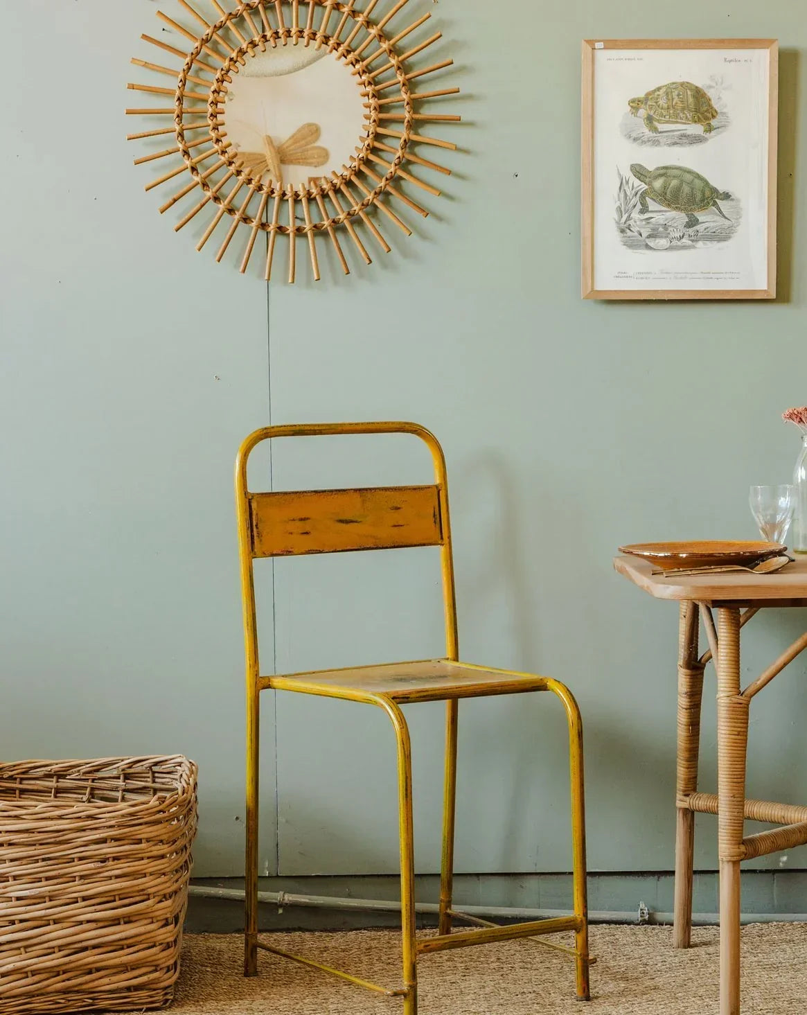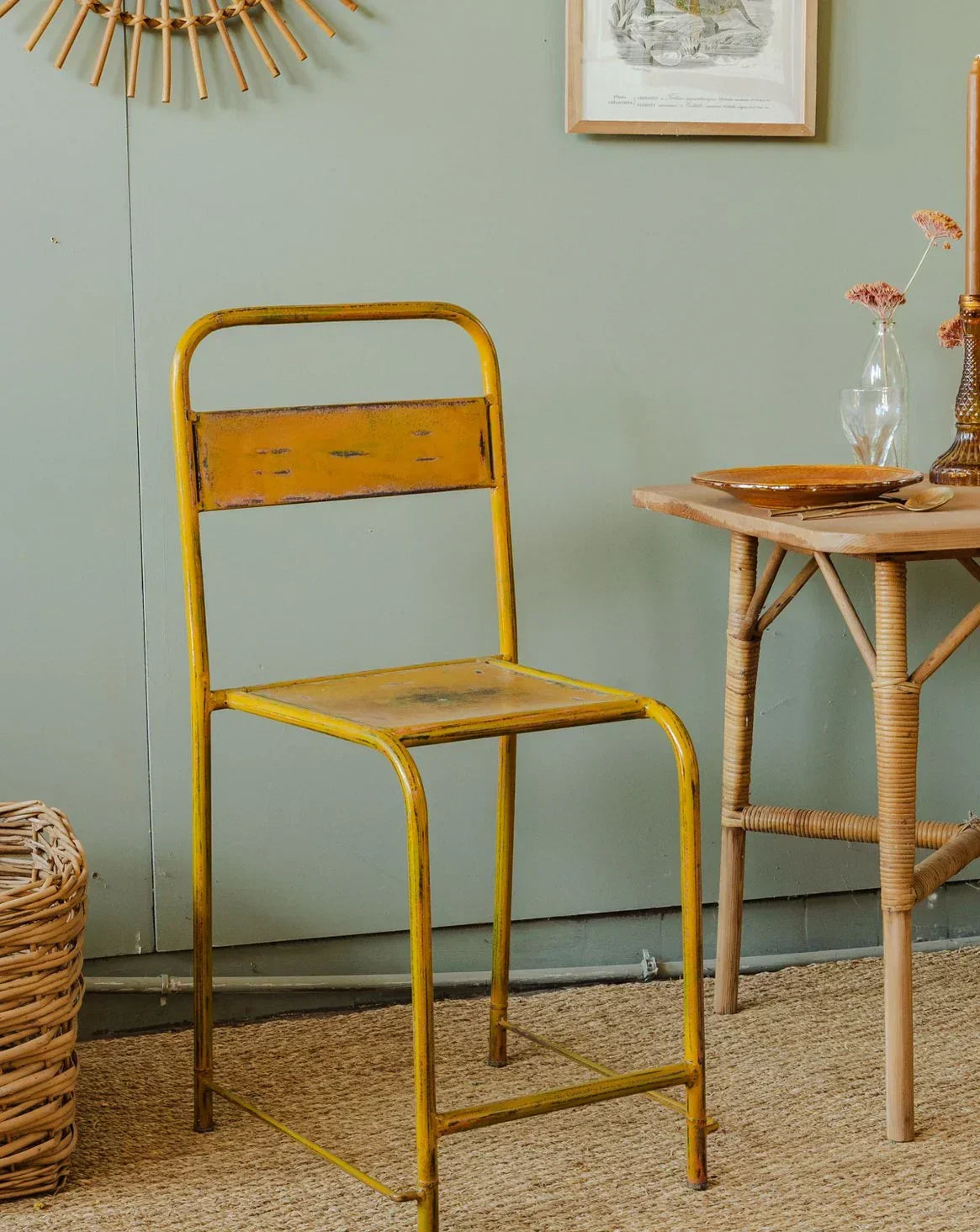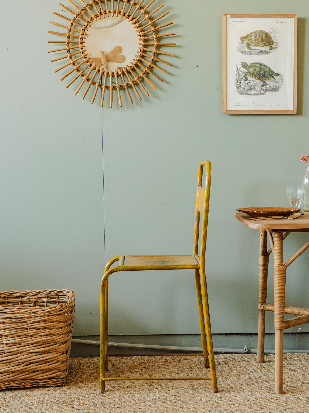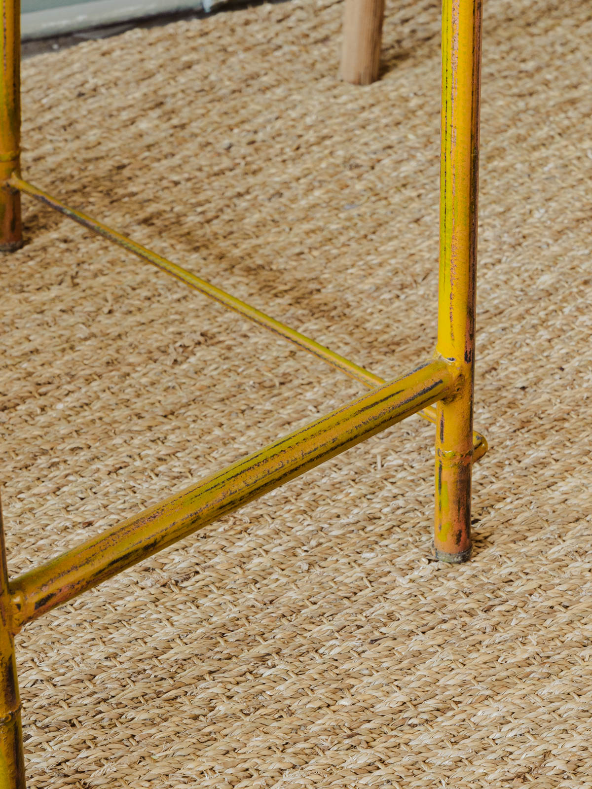 Embrace this vintage-style, patinated yellow metal chair, which brings a bright, industrial touch to a kitchen, office, or covered patio. Its compact size and balanced proportions ensure a stable and easy-to-move seat, while the slightly aged finish tells a warm story; it blends perfectly with contemporary or bohemian interiors, combining raw materials and soft colors. A manufacturing hole is present in the seat.