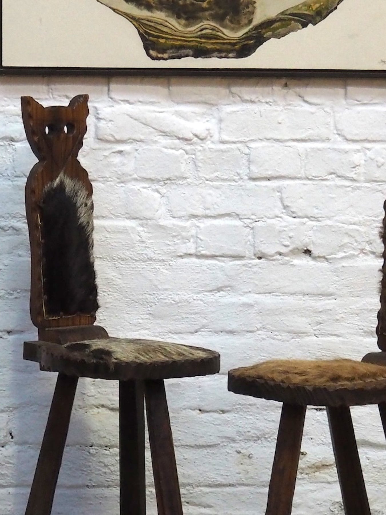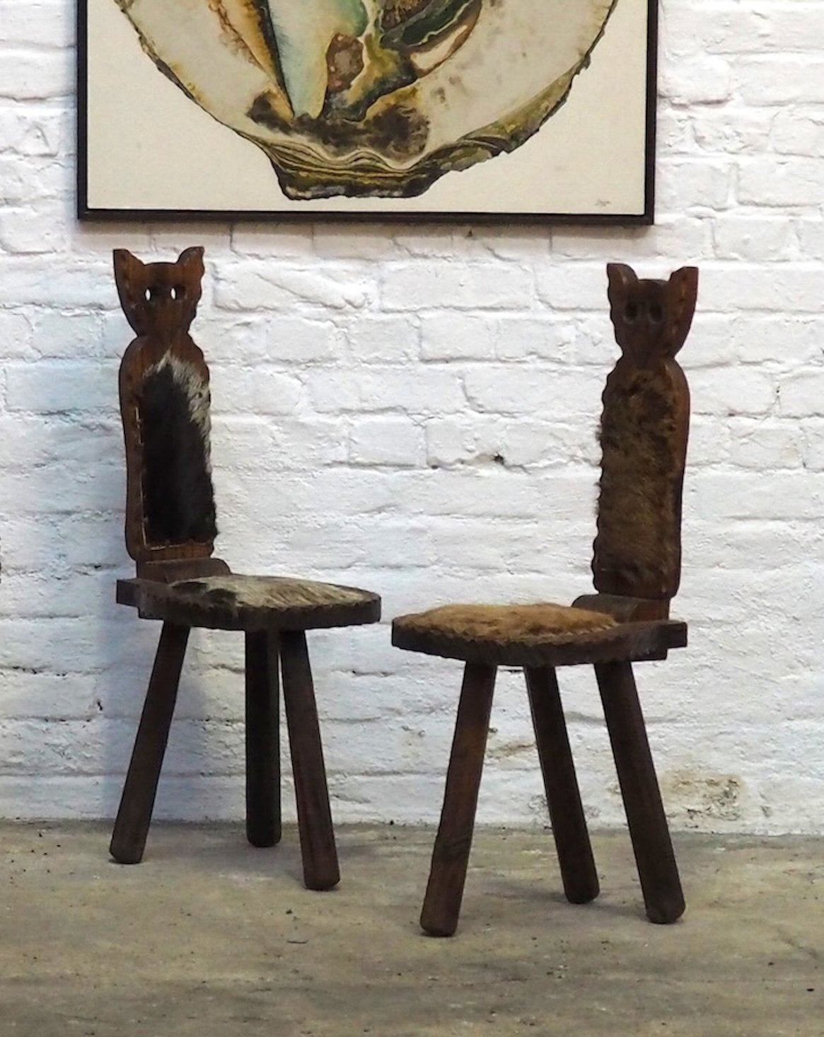 Adoptez cette paire de petites chaises tripodes au style brutaliste, pliables et sculpturales, qui mêlent la chaleur du pin à la douceur de la fourrure pour une présence à la fois graphique et accueillante. Leur assise compacte et leur dossier haut évoquent une silhouette en forme de tête de hibou, idéale pour optimiser des espaces restreints tout en offrant une posture confortable. Le bois martelé et la fourrure d'habillage créent une ambiance chaleureuse et contemporaine.