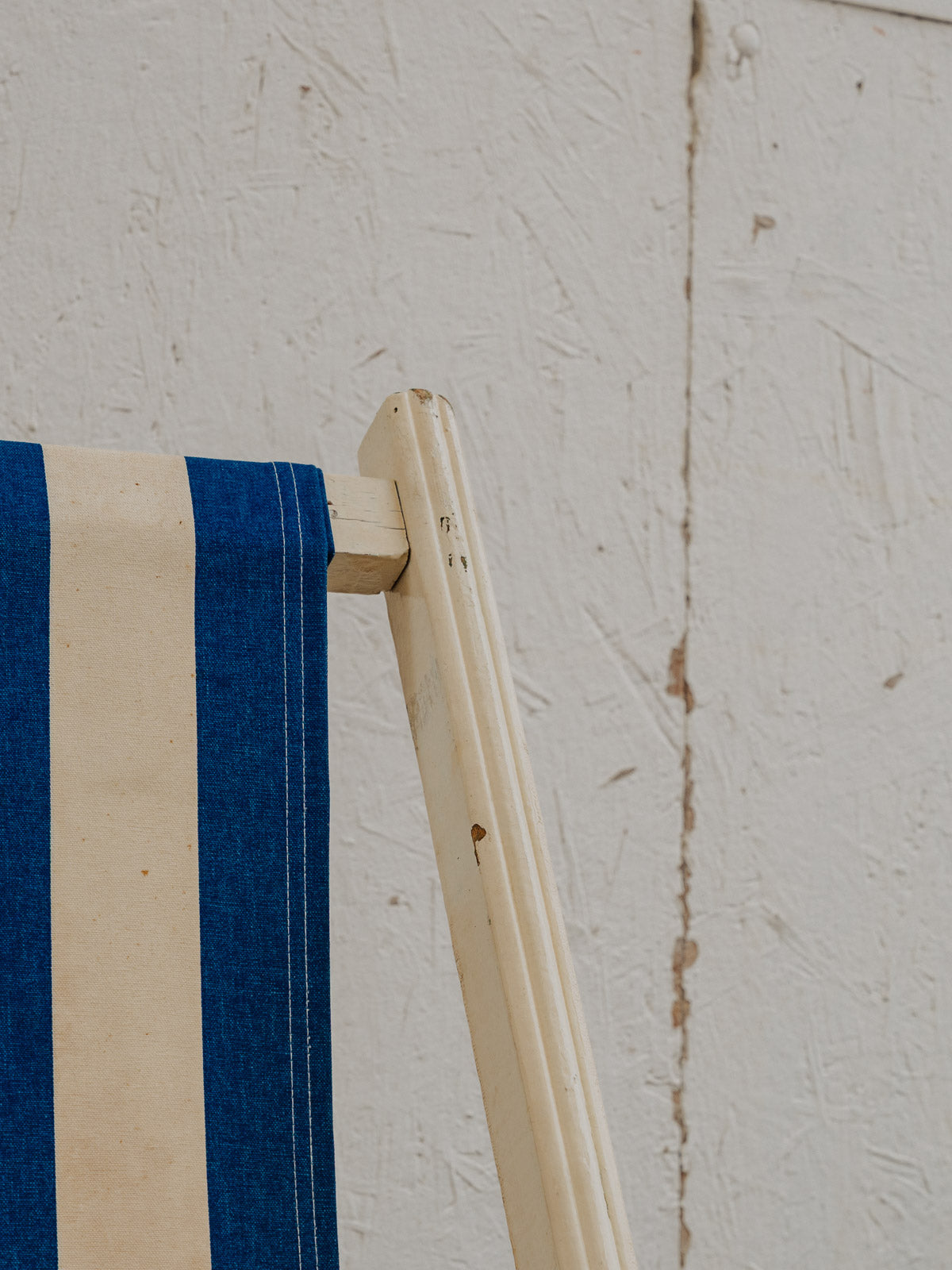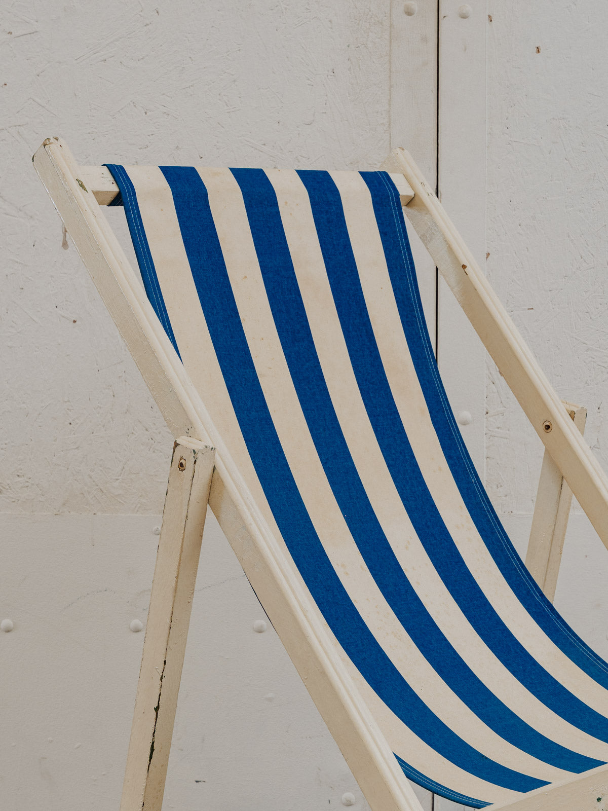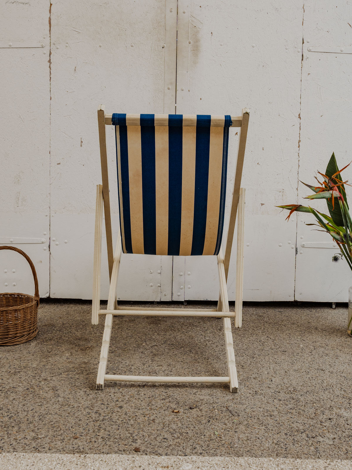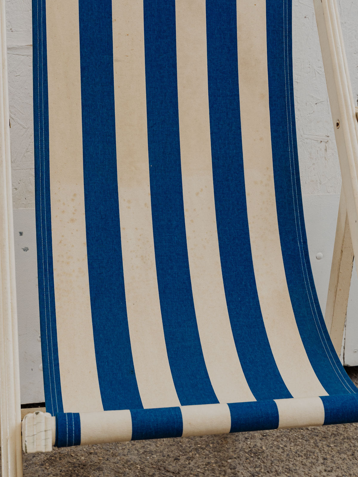 Invitez ce transat vintage aux rayures blanches et bleues et à la structure en bois peint en blanc, pour une silhouette légère qui illumine terrasse et intérieur. La toile en tissu offre confort, tandis que ses multiples positions permettent de passer d'une assise droite à un bain de soleil détendu selon l'envie. Facilement pliable, il se range et se transporte sans difficulté. Quelques traces du temps présentes.