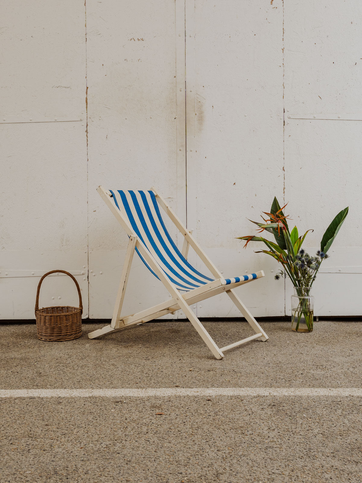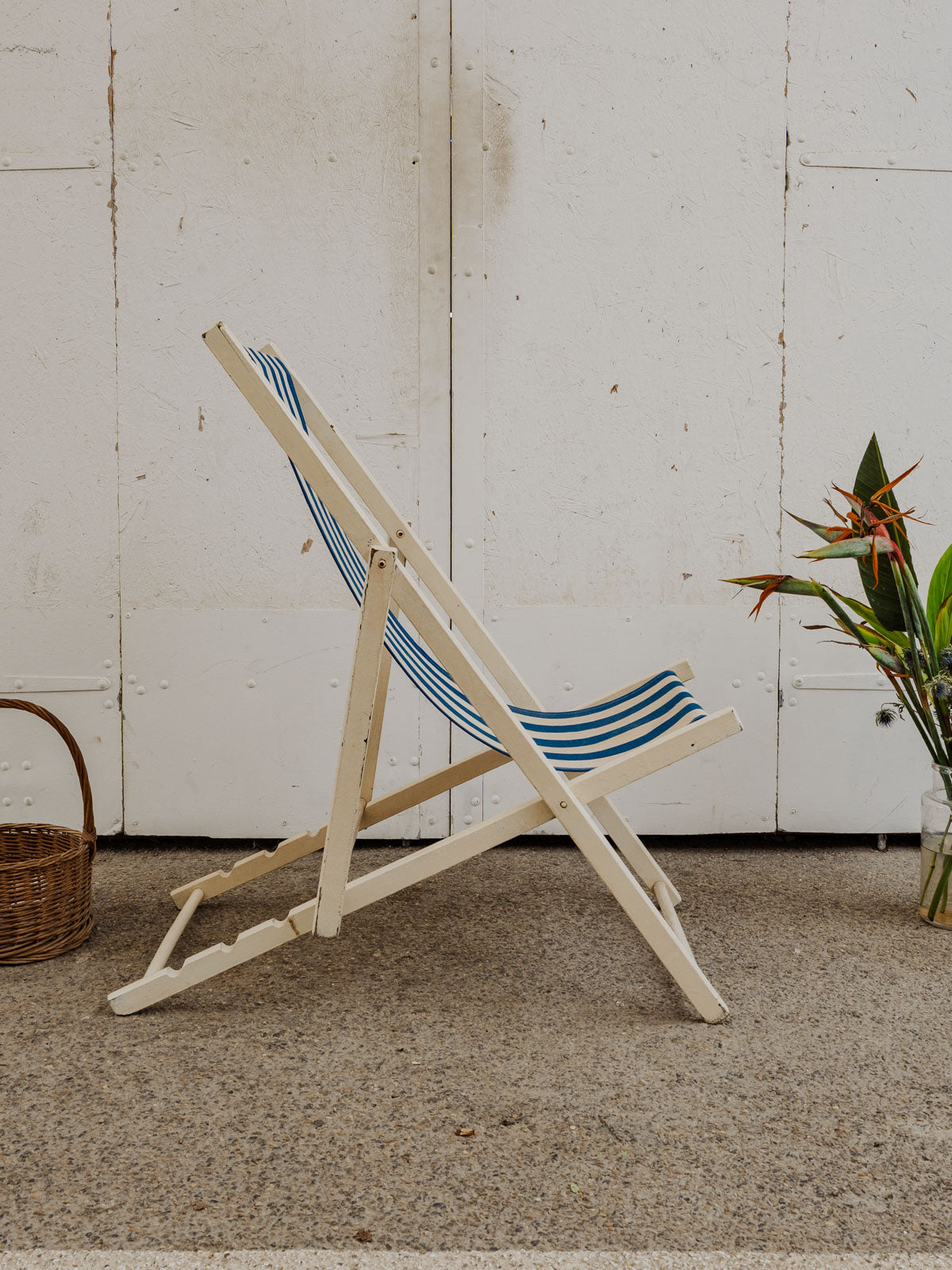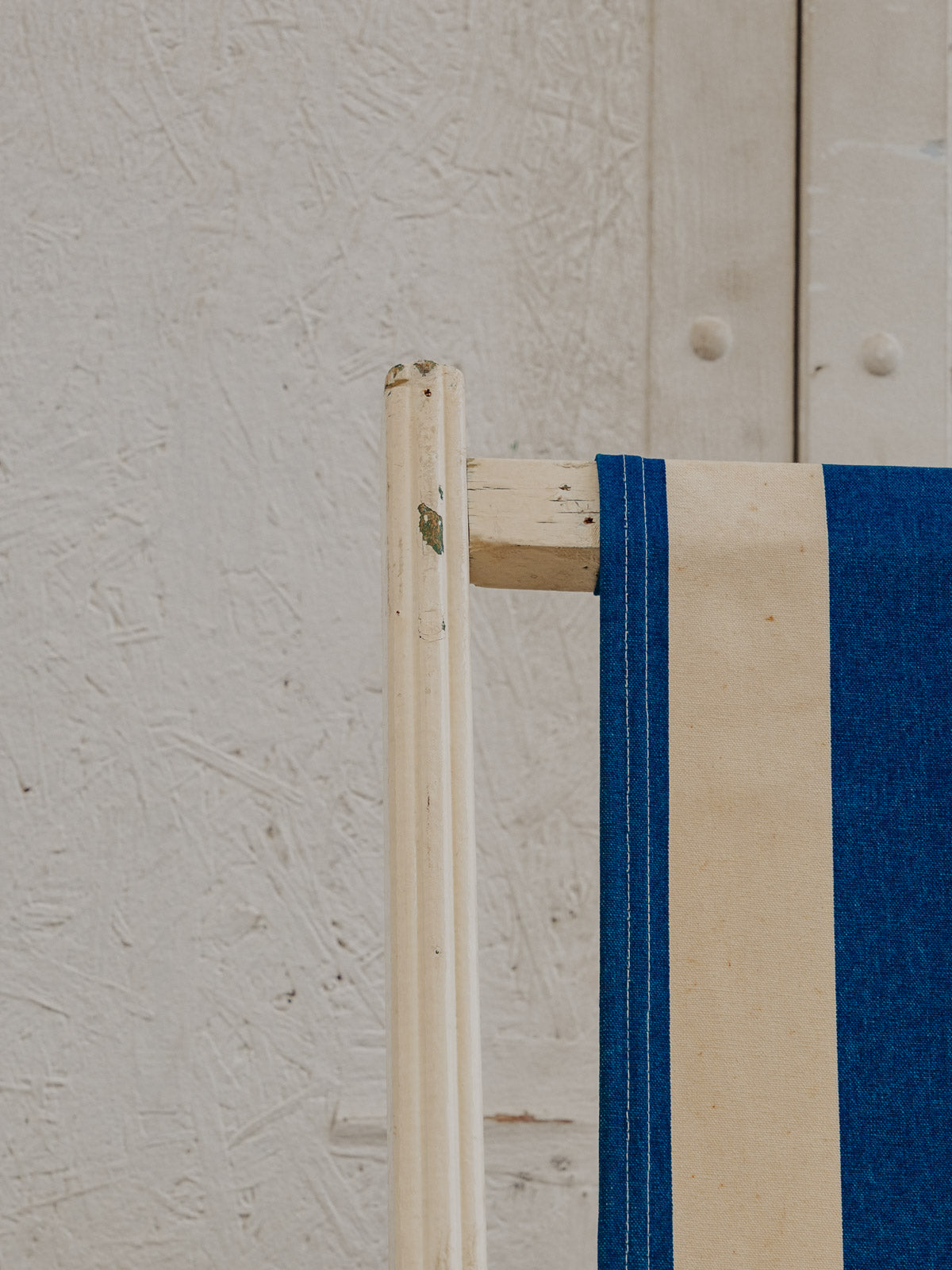 Invitez ce transat vintage aux rayures blanches et bleues et à la structure en bois peint en blanc, pour une silhouette légère qui illumine terrasse et intérieur. La toile en tissu offre confort, tandis que ses multiples positions permettent de passer d'une assise droite à un bain de soleil détendu selon l'envie. Facilement pliable, il se range et se transporte sans difficulté. Quelques traces du temps présentes.