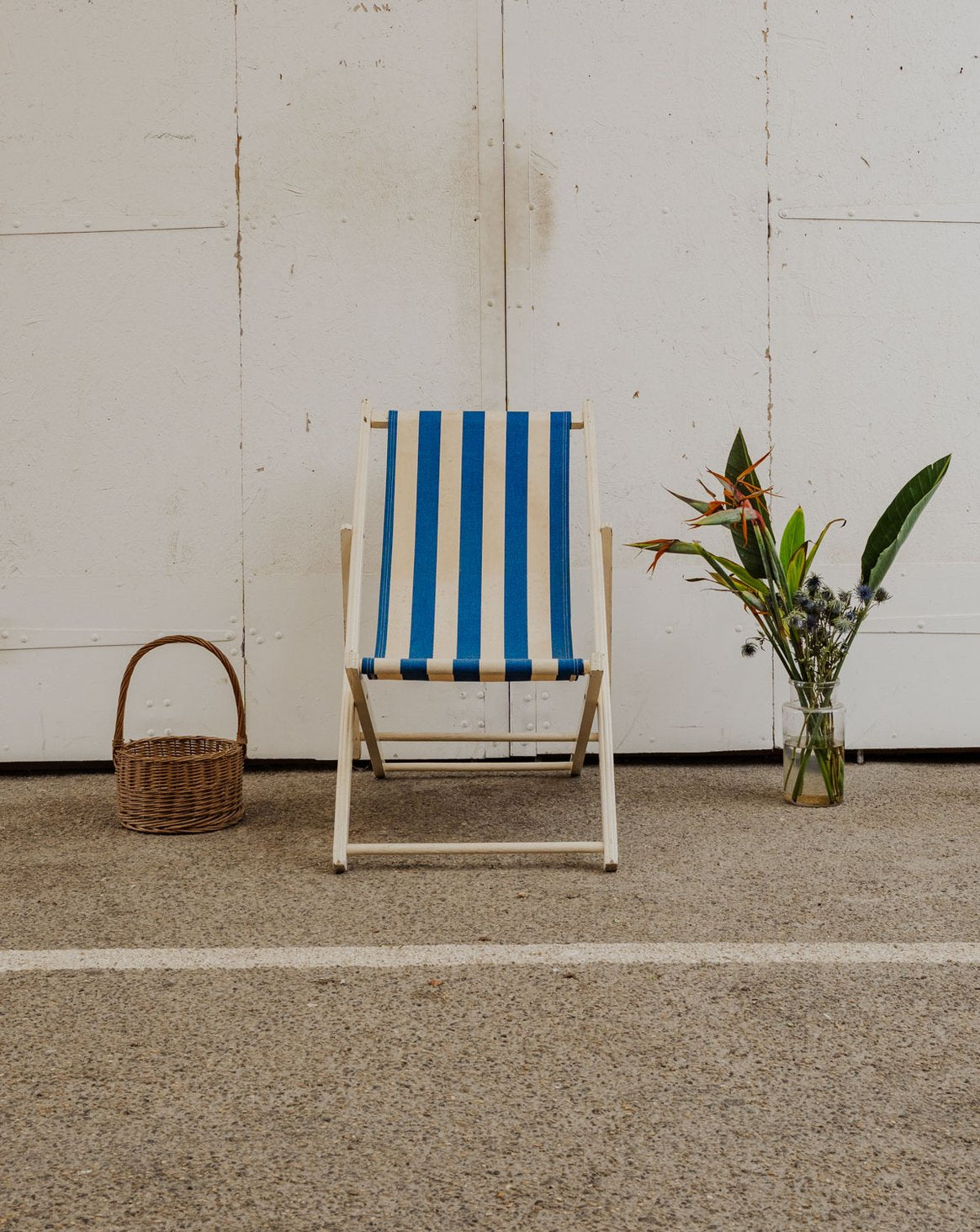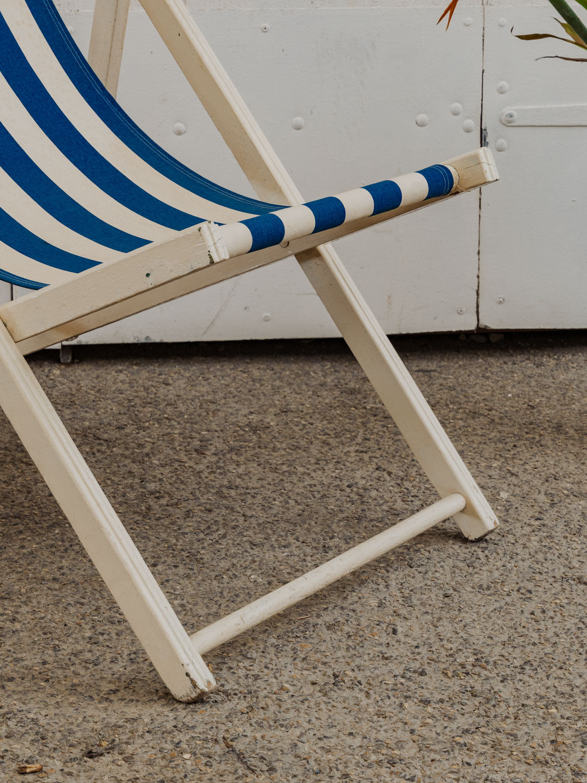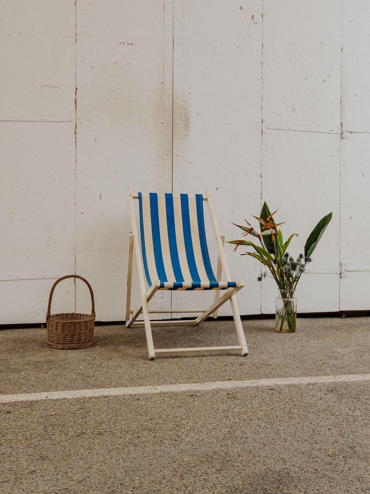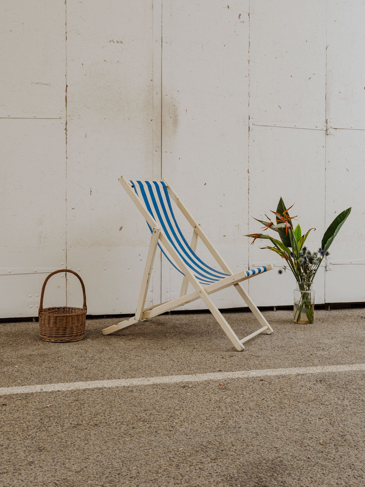 Invitez ce transat vintage aux rayures blanches et bleues et à la structure en bois peint en blanc, pour une silhouette légère qui illumine terrasse et intérieur. La toile en tissu offre confort, tandis que ses multiples positions permettent de passer d'une assise droite à un bain de soleil détendu selon l'envie. Facilement pliable, il se range et se transporte sans difficulté. Quelques traces du temps présentes.