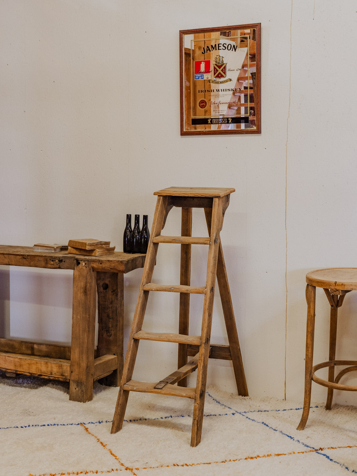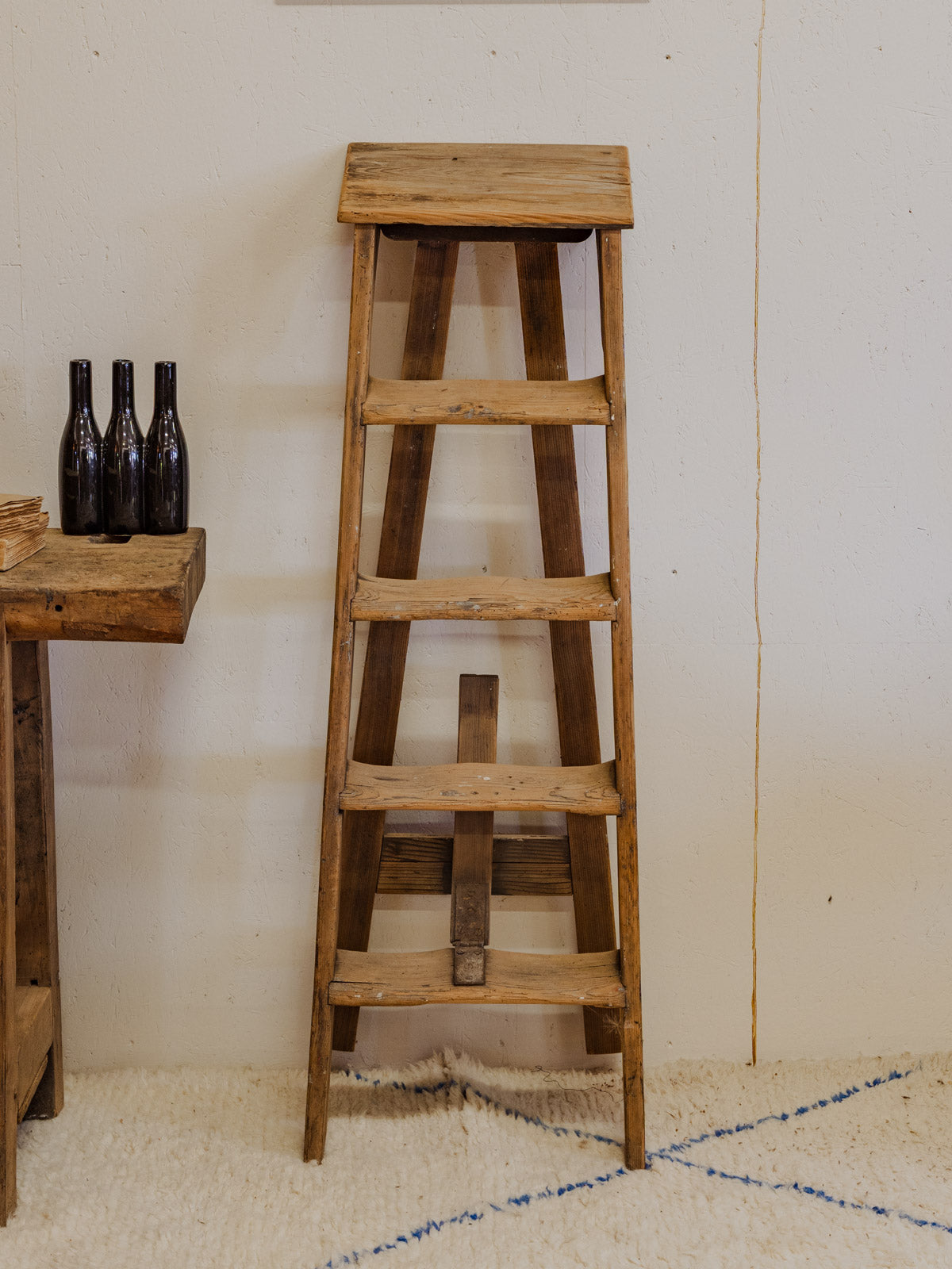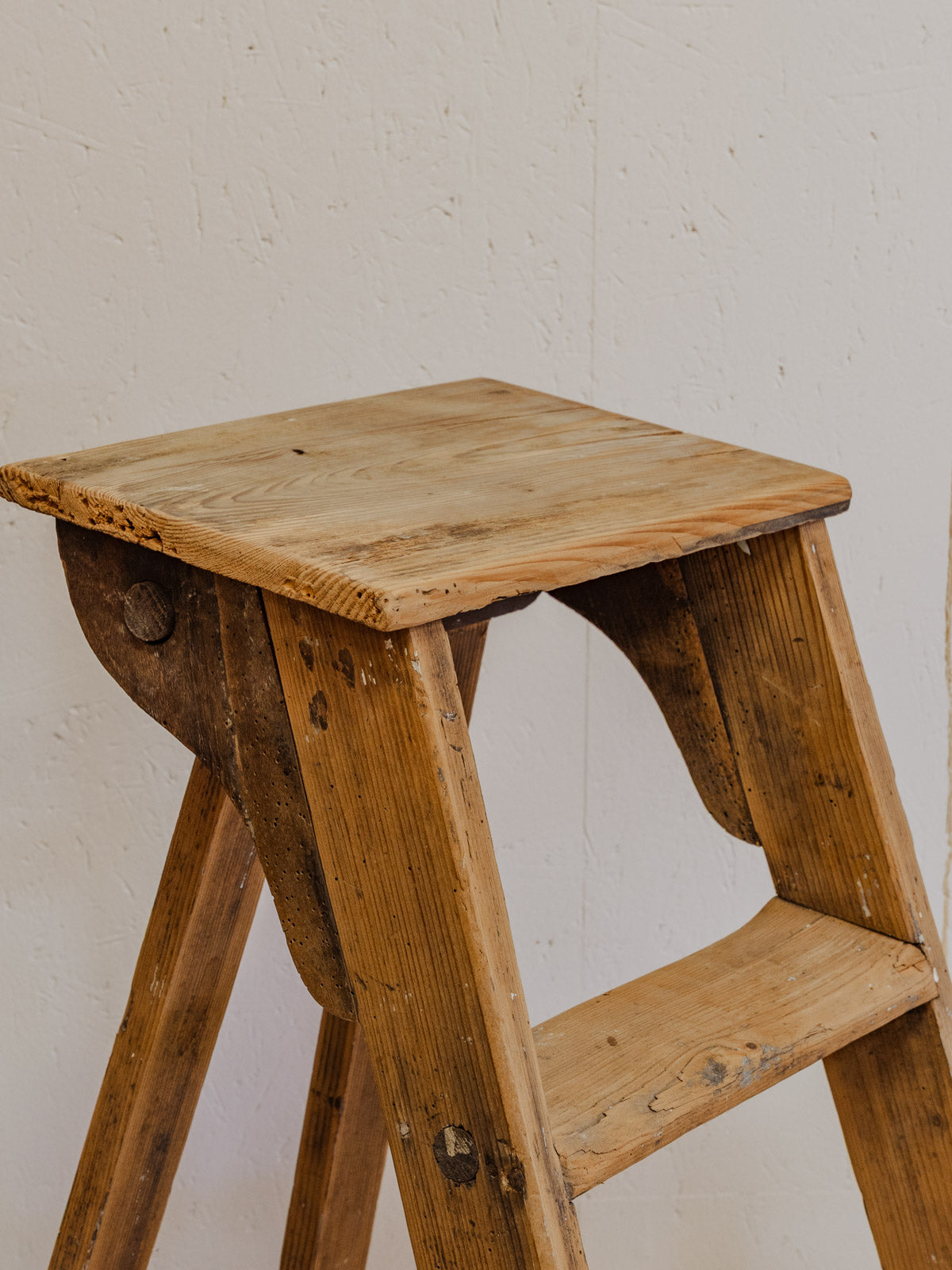Bring home this antique four-step wooden step stool, a perfect blend of practicality and understated elegance. Its silhouette and small platform make it a convenient step stool for reaching a shelf, a plant stand, or a side table in an entryway or bathroom. The light, patinated wood creates a soft glow and a warm, rustic yet contemporary ambiance. Some signs of age are present.