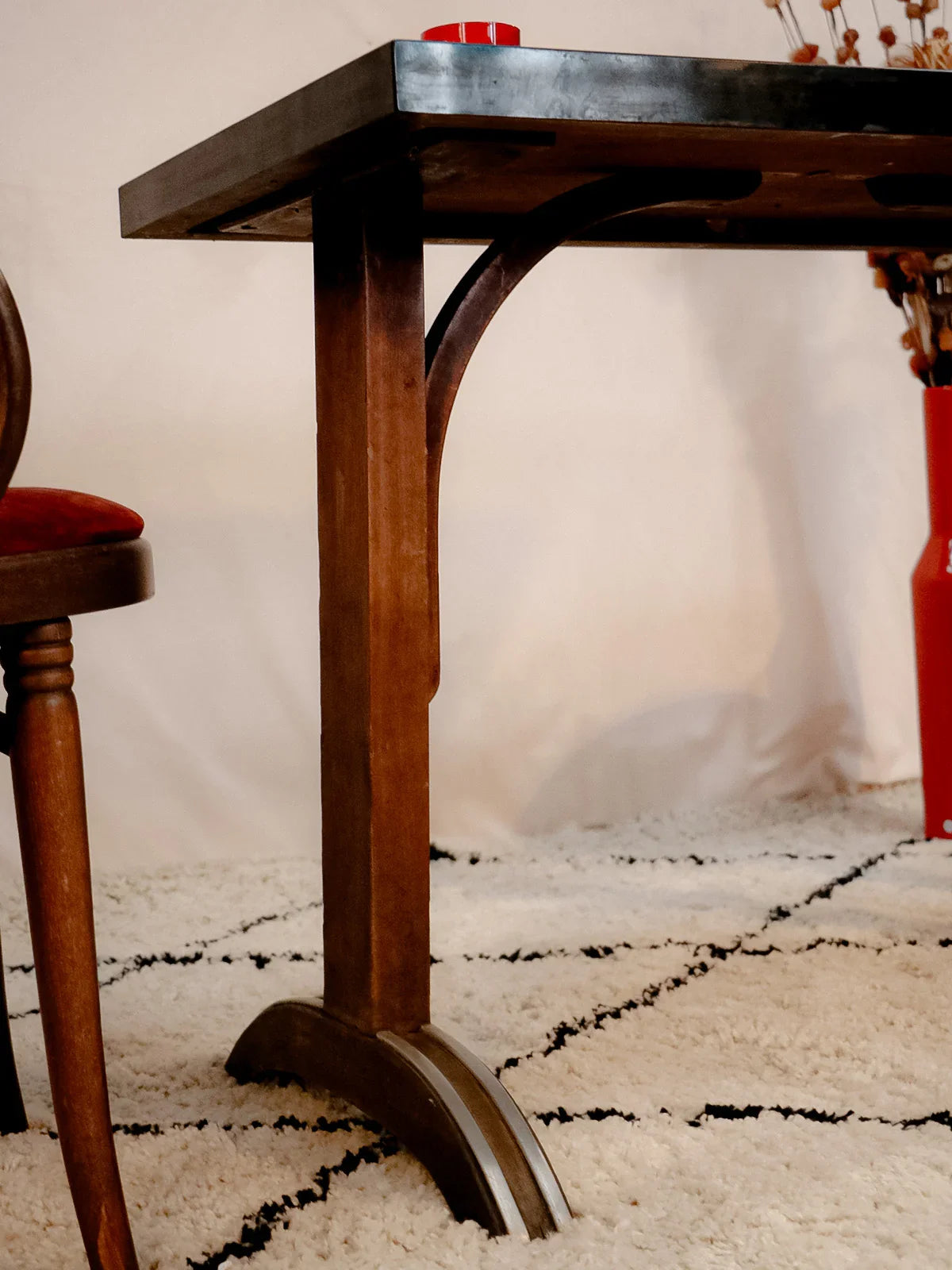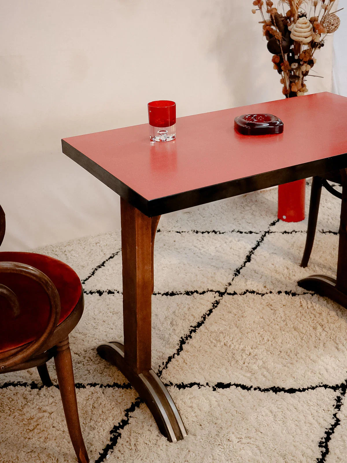 Bring a touch of cozy bistro style to your home with this compact dining table featuring a red Formica top and dark-stained beech legs. Its manageable size makes it perfect for meals for two or four, while the contrasting materials blend practicality with retro charm. Ideal for a kitchen or dining area seeking a graphic and authentic feel, it offers stability and easy maintenance for everyday use.