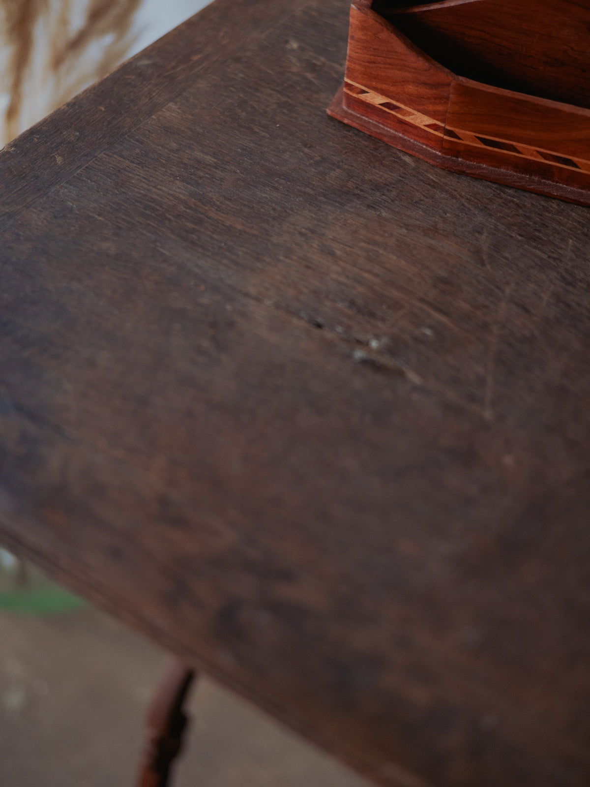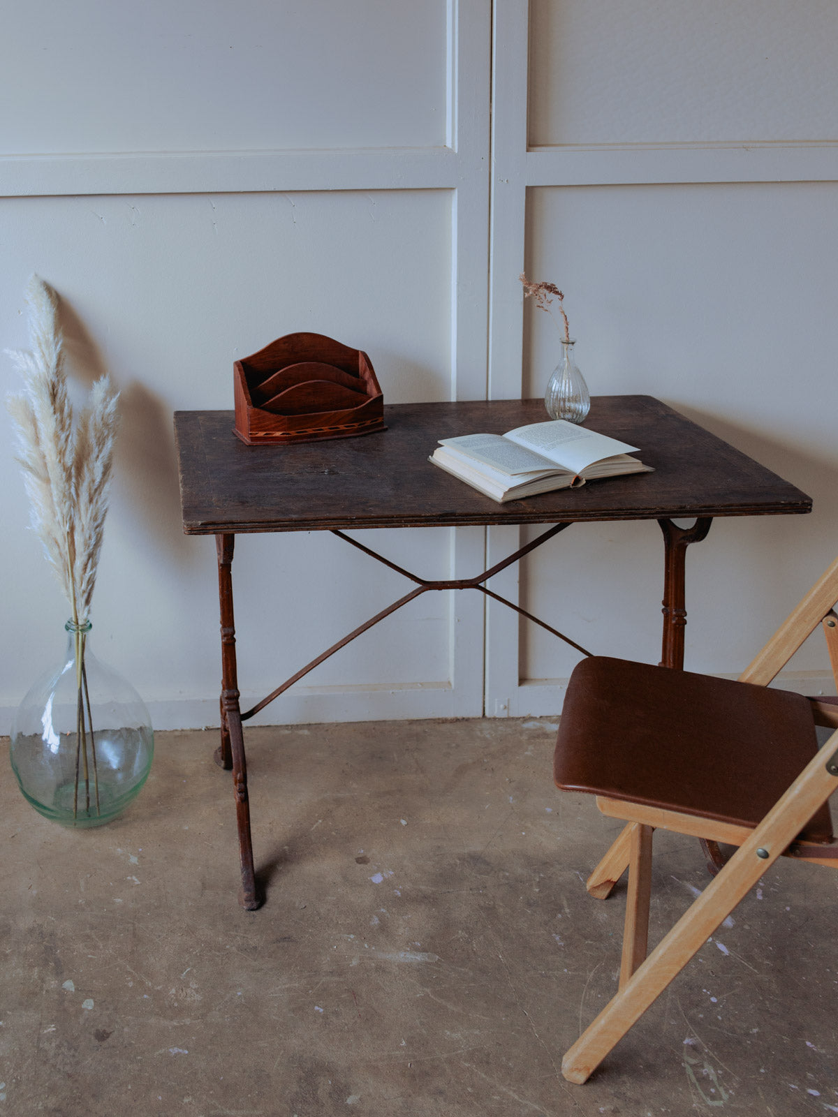 Apportez une touche bistro chaleureuse avec cette table au plateau en bois plaqué et piètement en métal peint couleur caramel. Sa taille conviviale accueille confortablement deux à quatre personnes pour un café, un repas en cuisine ou un coin lecture, tandis que le mariage du bois et du métal crée une ambiance à la fois industrielle et douce. Le placage présente un léger bombé et la peinture du piètement s'est un peu écaillée. Quelques marques d'usage qui font son authenticité.