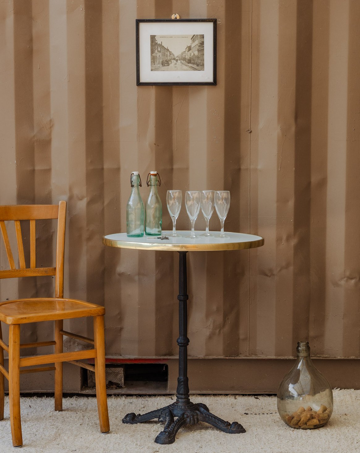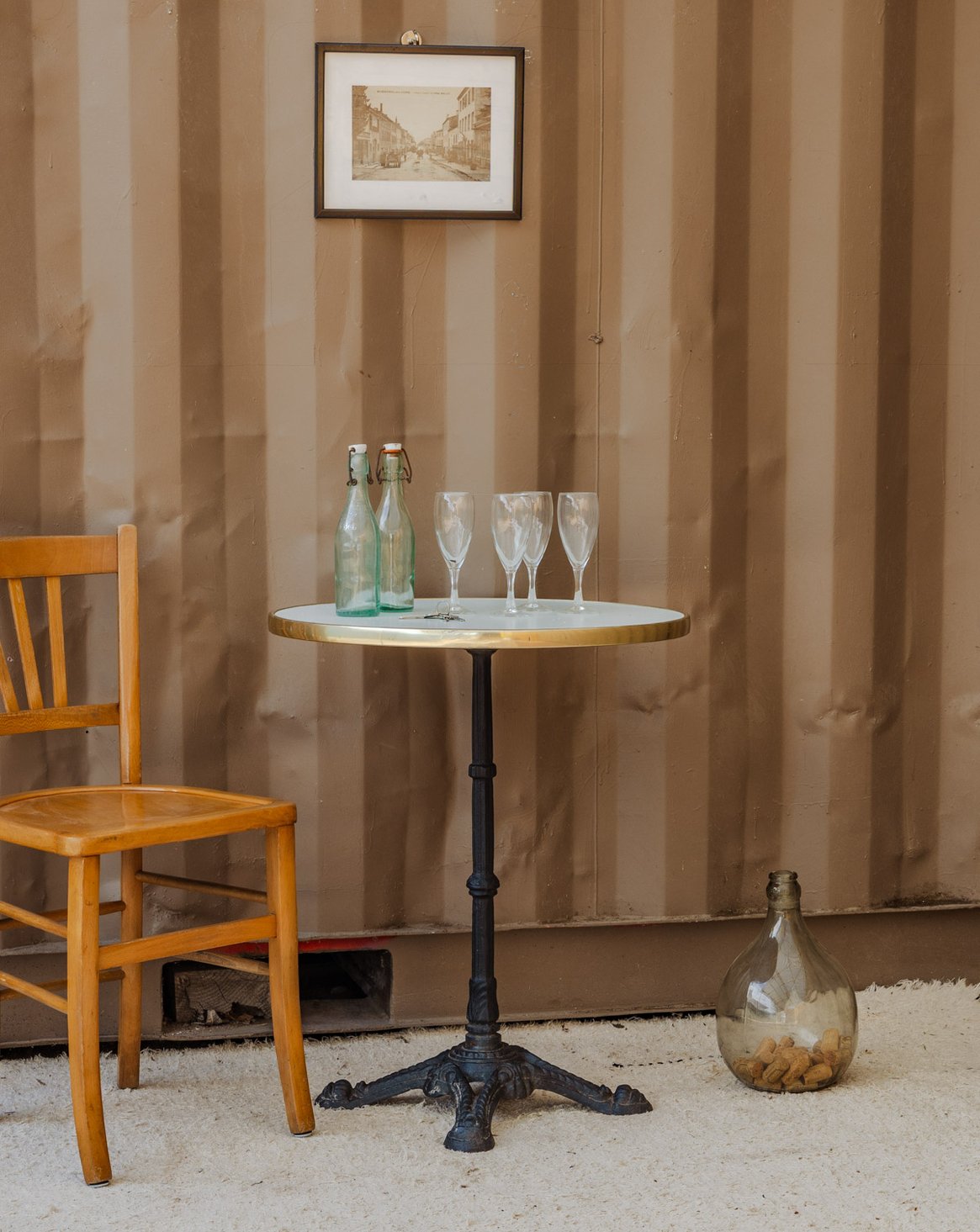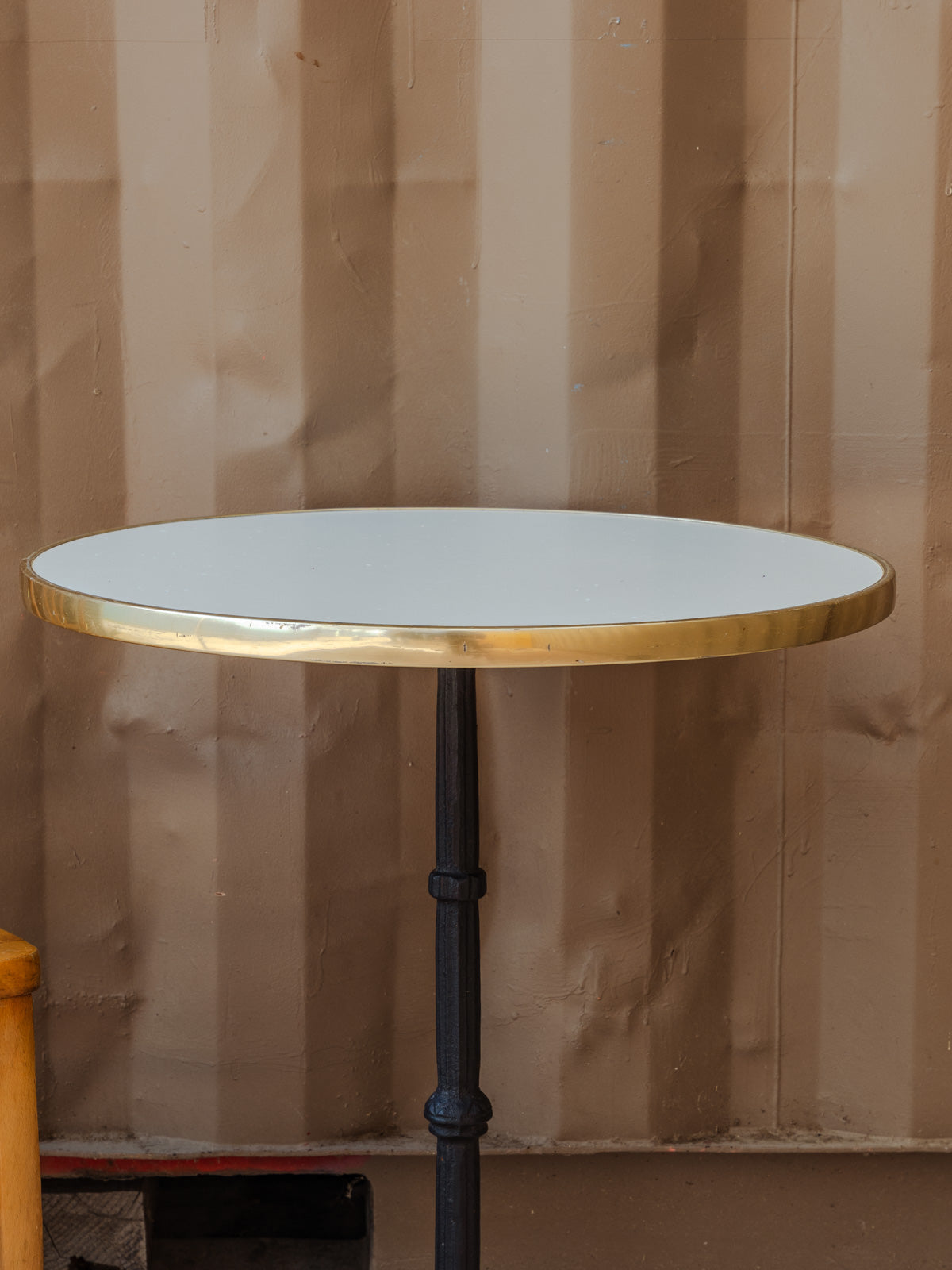 Bring the Parisian bistro atmosphere into your home with this dining table featuring a round white resin top, highlighted by a golden rim and resting on black legs. Designed for four guests, its silhouette and contrasting materials add a chic and contemporary touch, ideal for an intimate dining nook or an open-plan kitchen. Some signs of age are present. Six units available.