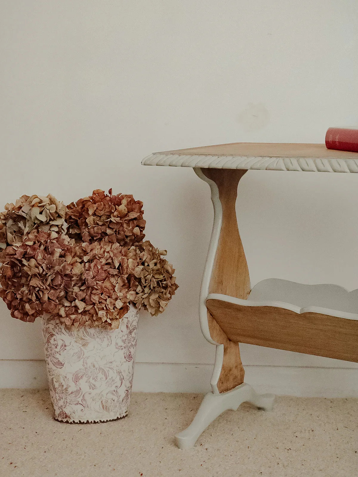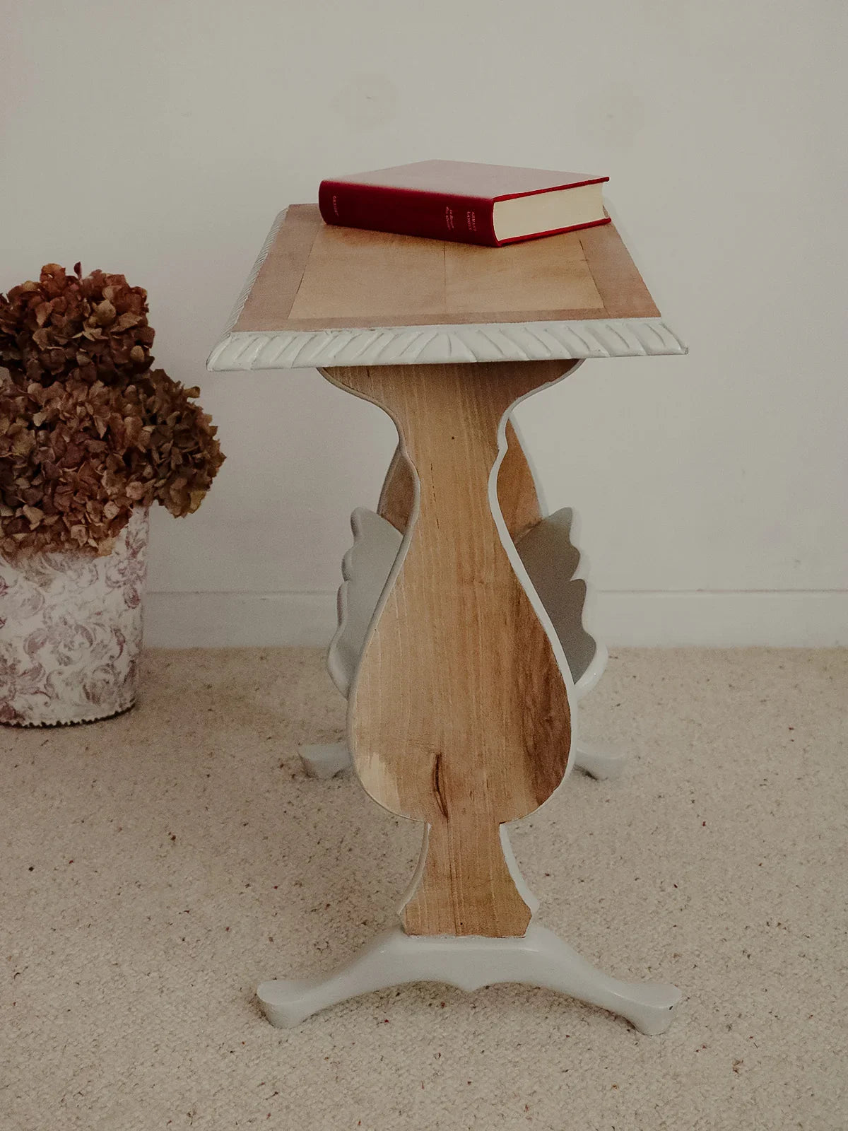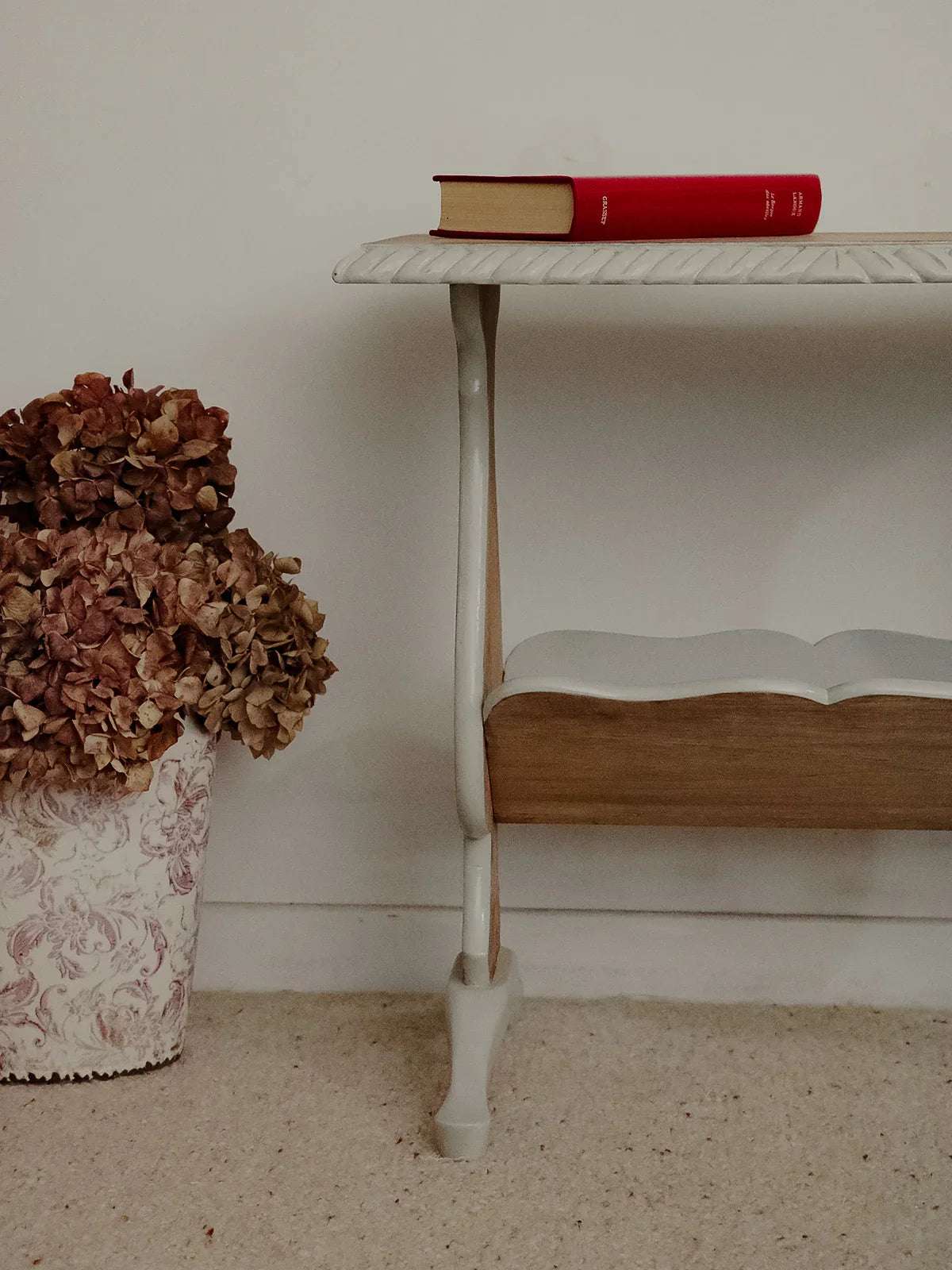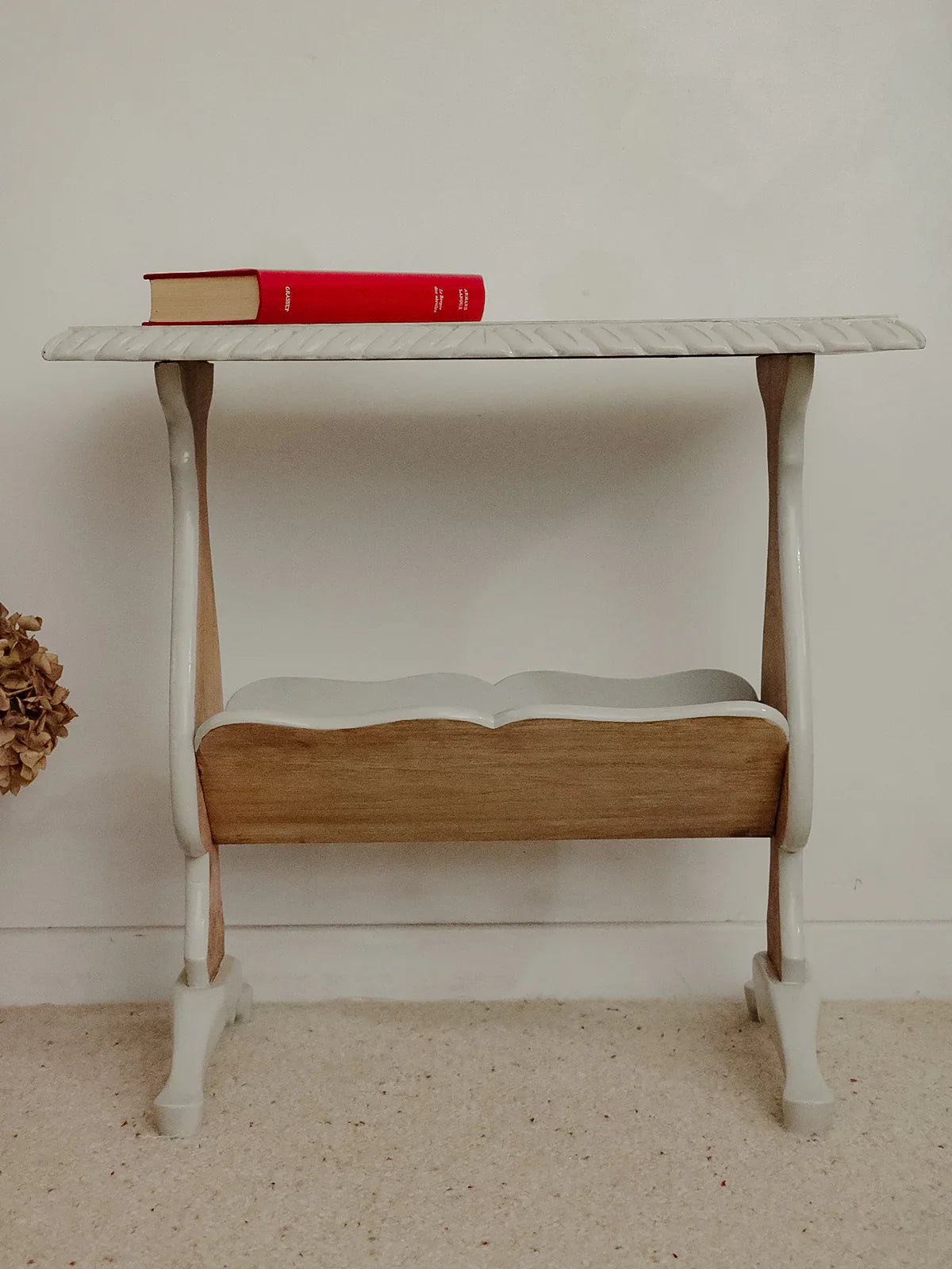 Choose this magazine rack crafted from oak and poplar, painted a soft gray that reveals the light wood grain. Its compact silhouette and well-proportioned design accommodate a generous selection of magazines without cluttering the space, making it ideal next to an armchair, in an entryway, or a bedroom. The combination of woods ensures both sturdiness and visual lightness, adding a warm and contemporary touch to your home.