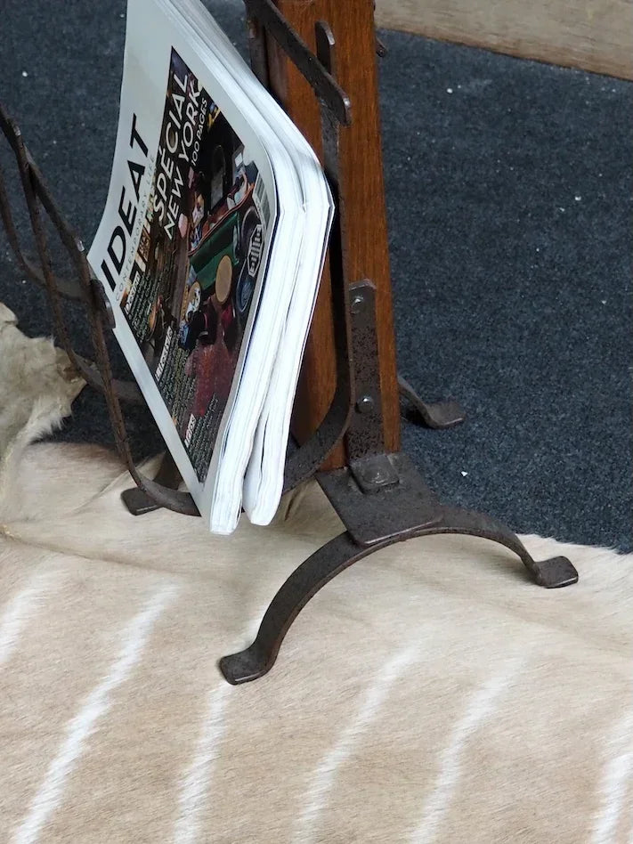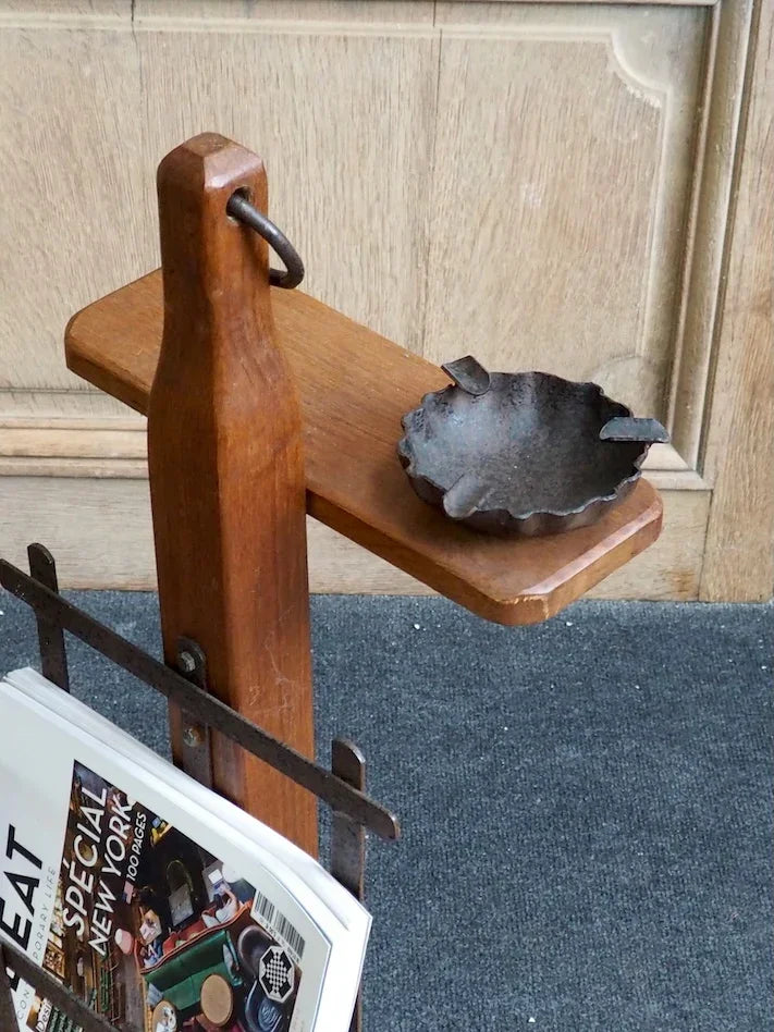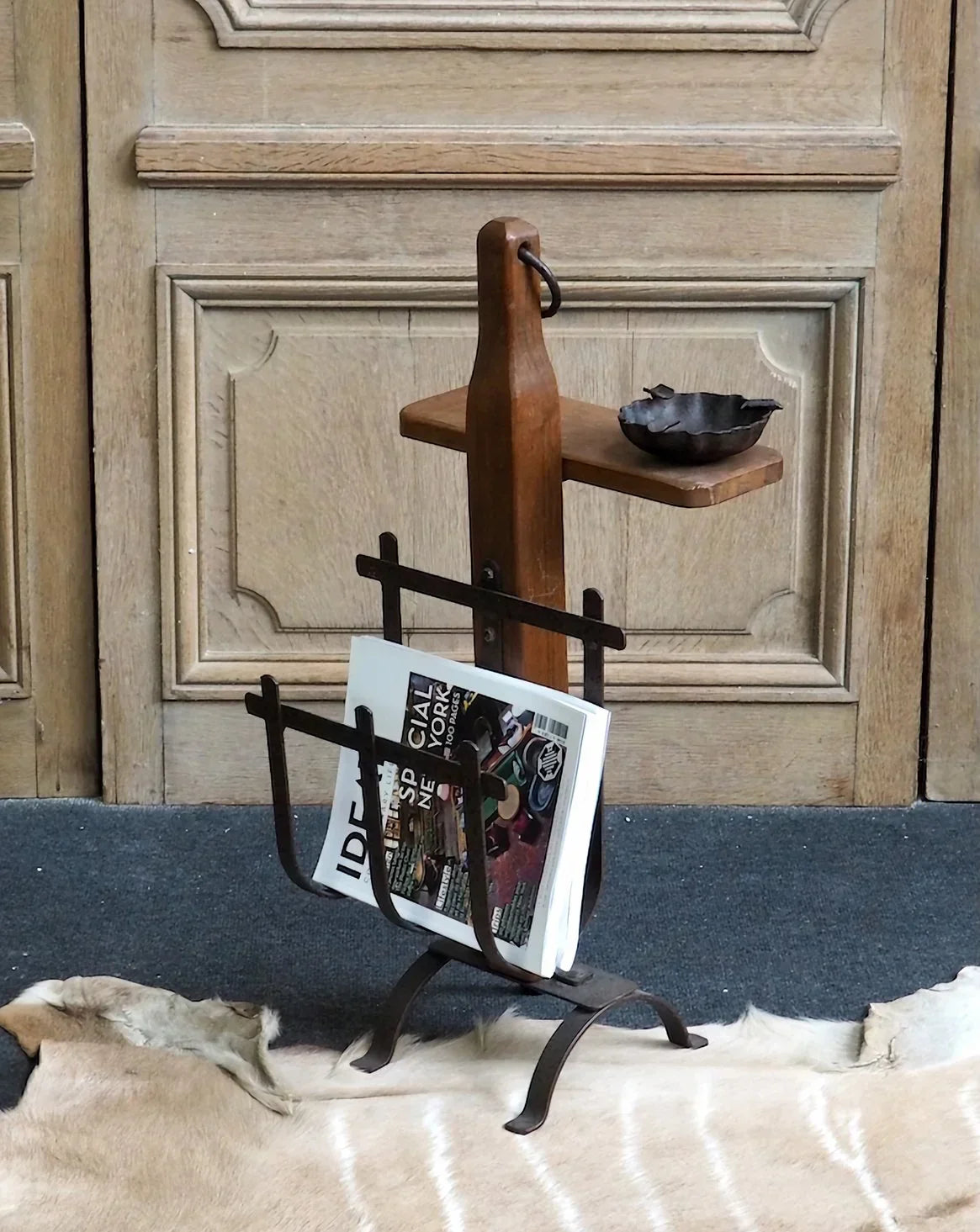 Embrace this brutalist magazine rack in oak and wrought iron, where clean lines meet the warmth of wood. Designed to hold newspapers and magazines, it incorporates a handcrafted wrought iron ashtray, a practical addition next to an armchair or desk. Its tall, slender silhouette takes up minimal space while offering reassuring stability, and its natural finish brings a touch of understated, refined workshop style to your interior.