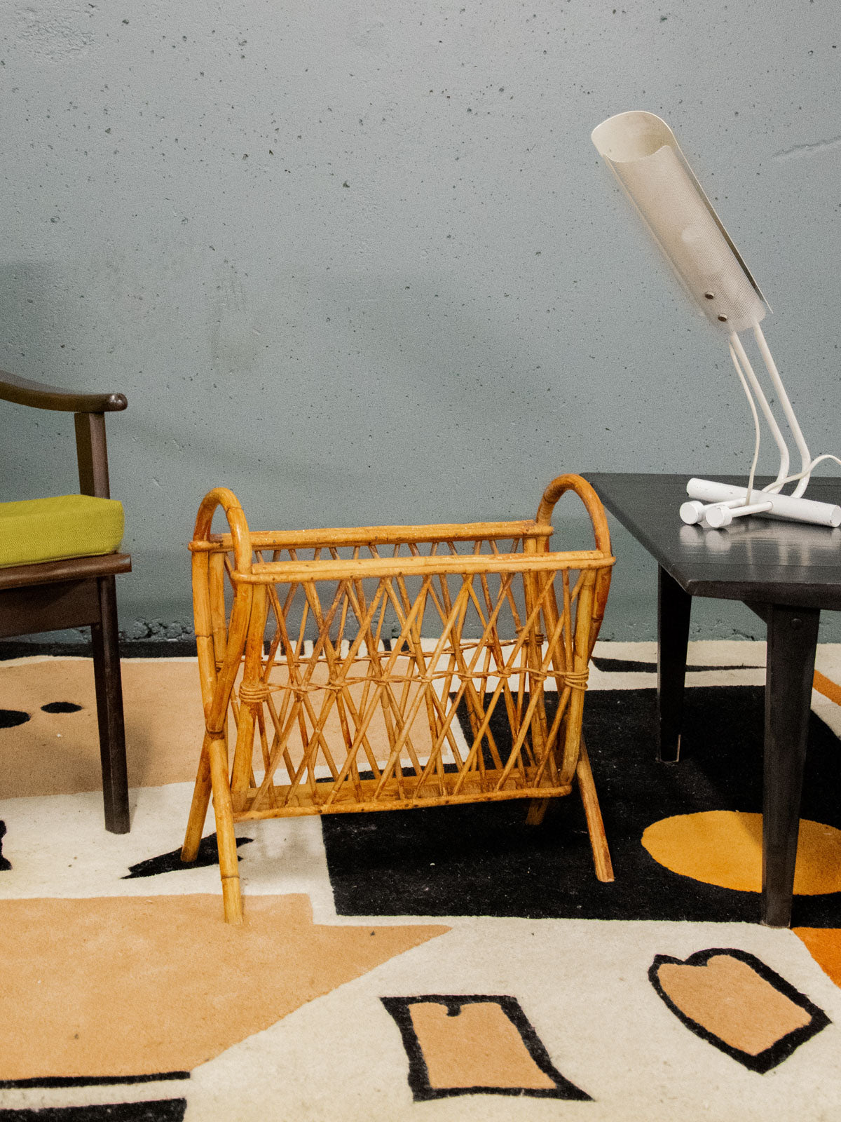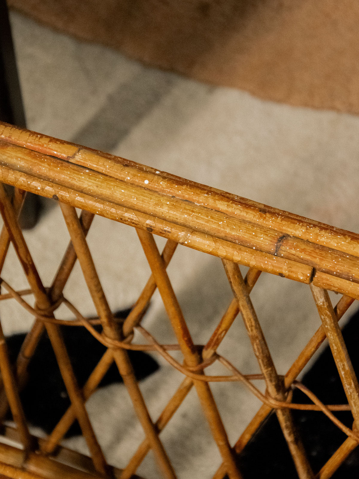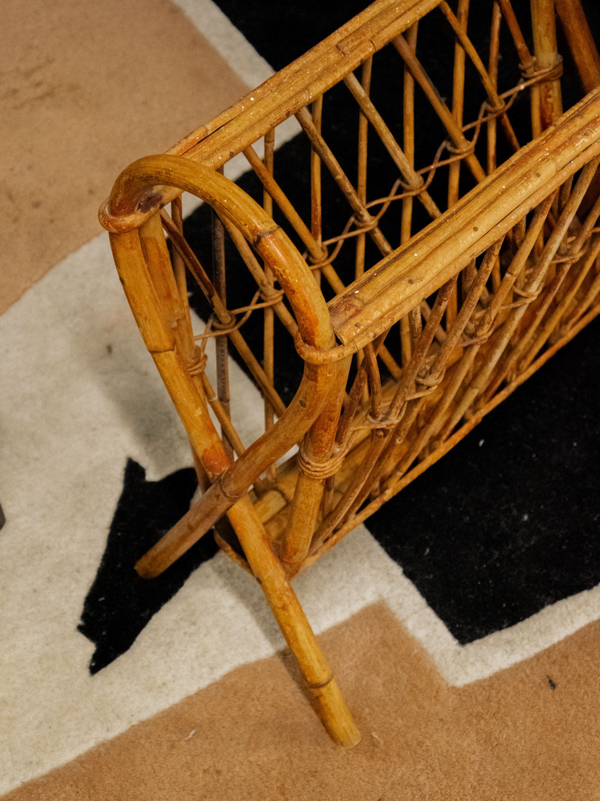 Invite this woven rattan magazine rack, adorned with elegant crossbars and rounded handles, into your home to add a touch of natural, graphic style. Its crossed legs give it a stable and refined silhouette, ideal for a reading nook or compact entryway, while its basket offers convenient storage for magazines and newspapers. In good condition, it exudes a warm and relaxed atmosphere, perfect for a simple and welcoming décor.