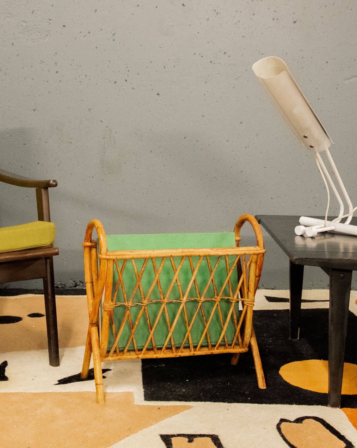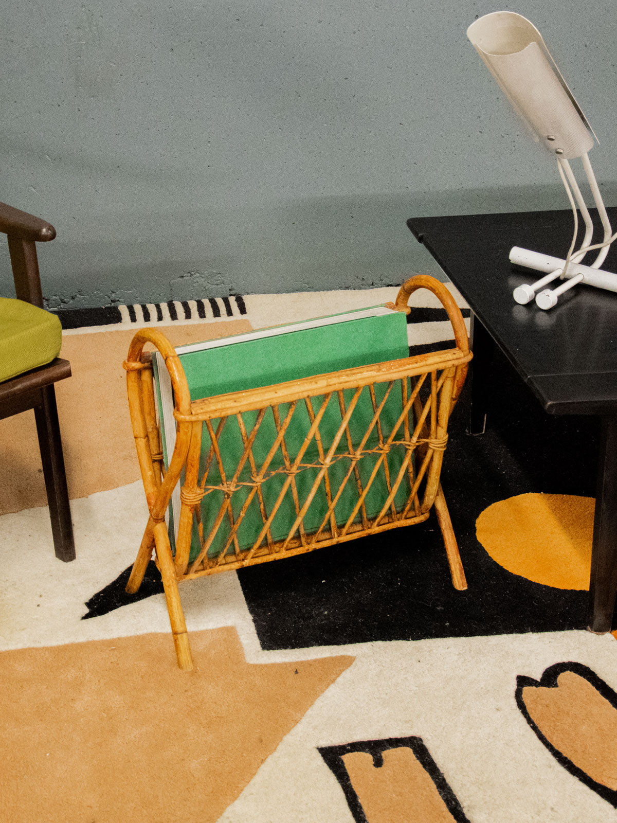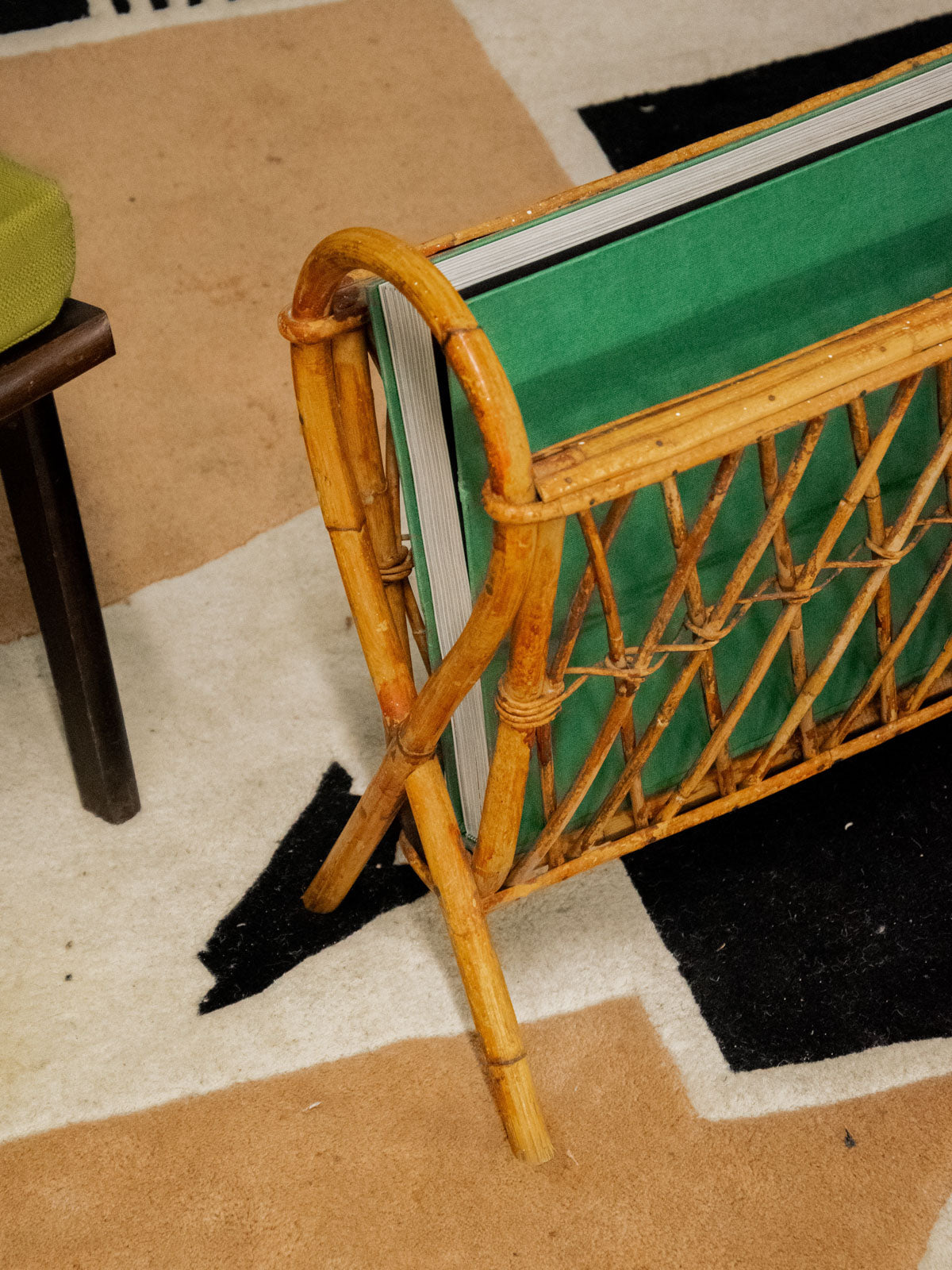 Invite this woven rattan magazine rack, adorned with elegant crossbars and rounded handles, into your home to add a touch of natural, graphic style. Its crossed legs give it a stable and refined silhouette, ideal for a reading nook or compact entryway, while its basket offers convenient storage for magazines and newspapers. In good condition, it exudes a warm and relaxed atmosphere, perfect for a simple and welcoming décor.