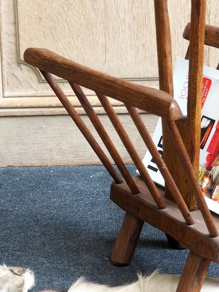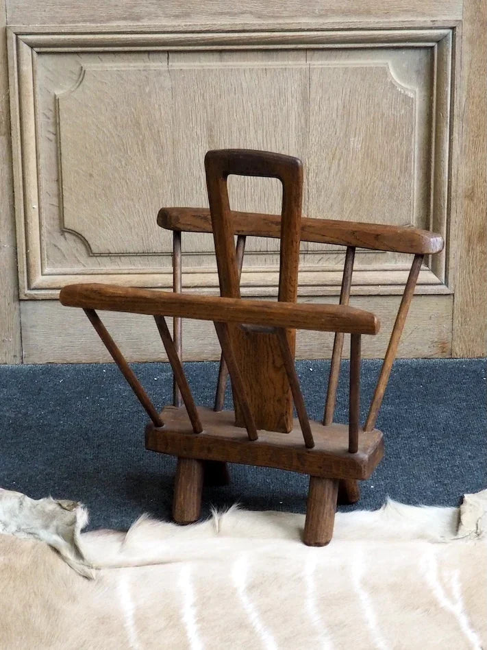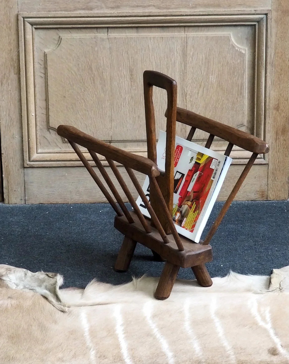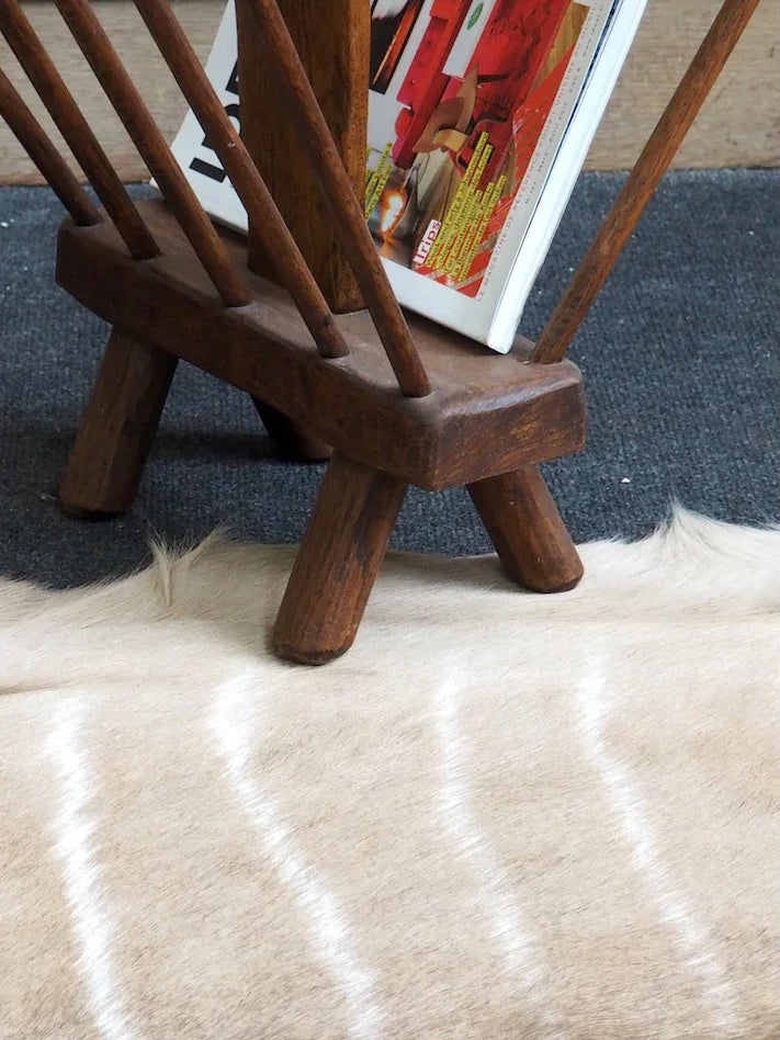 Embrace this elm magazine rack, an embodiment of Brutalist style reinterpreted through the lens of folk art. Its bold lines and balanced proportions securely hold magazines, catalogs, and books, providing a decorative focal point in a living room, entryway, or office. The beautiful presence of the wood—with its visible grain and natural finish—brings a warm, textured feel that underscores a contemporary and authentic ambiance.