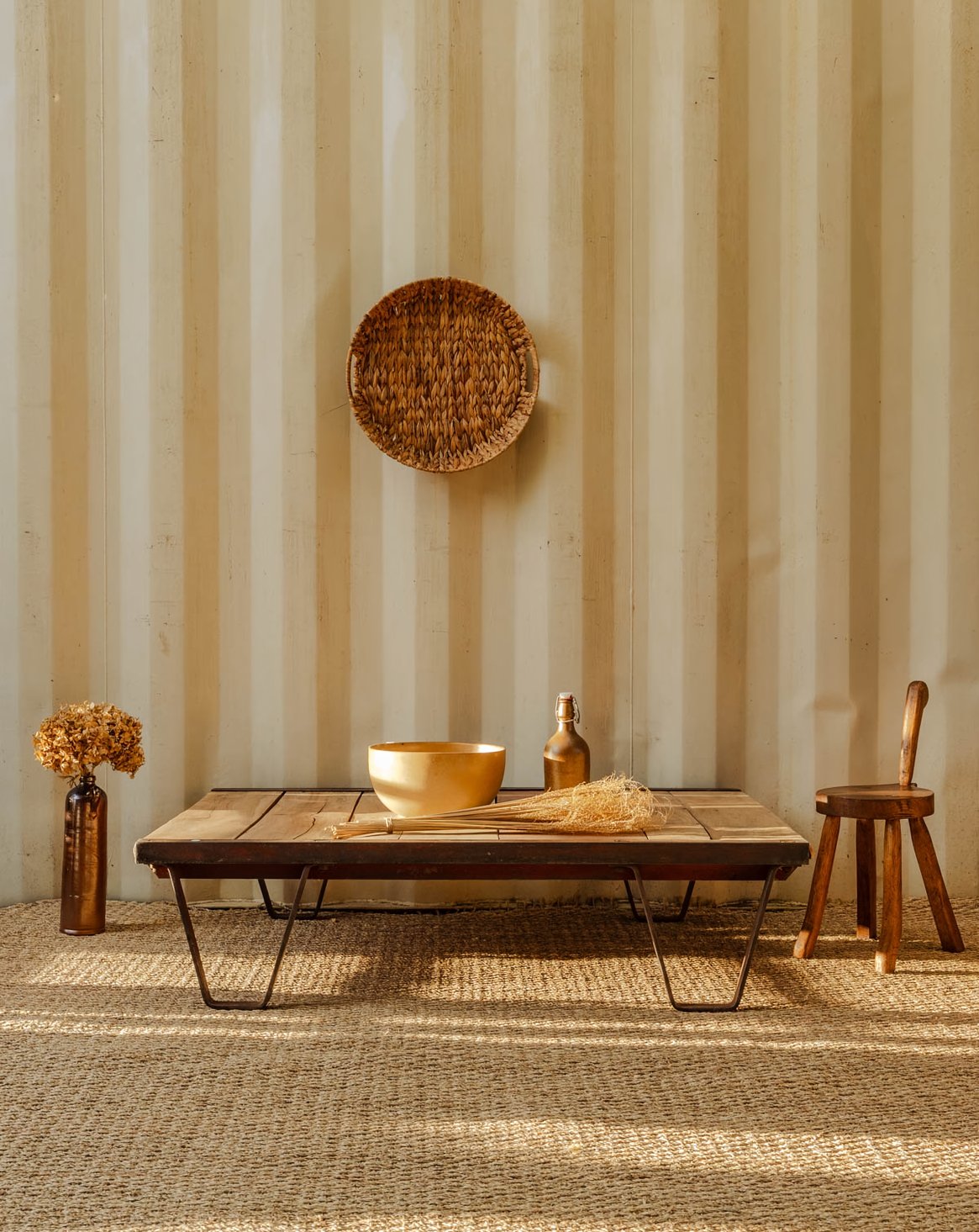 Embrace this vintage coffee table inspired by SNCF train carriages, with its distinctly industrial charm and raw varnished top, its sanded planks of varying sizes. Its simple structure highlights the natural beauty of the wood and offers a warm and functional surface for books, cups, or decorative objects, ideal for a living room or loft with a workshop style. Easy to integrate, it creates a welcoming and authentic atmosphere.