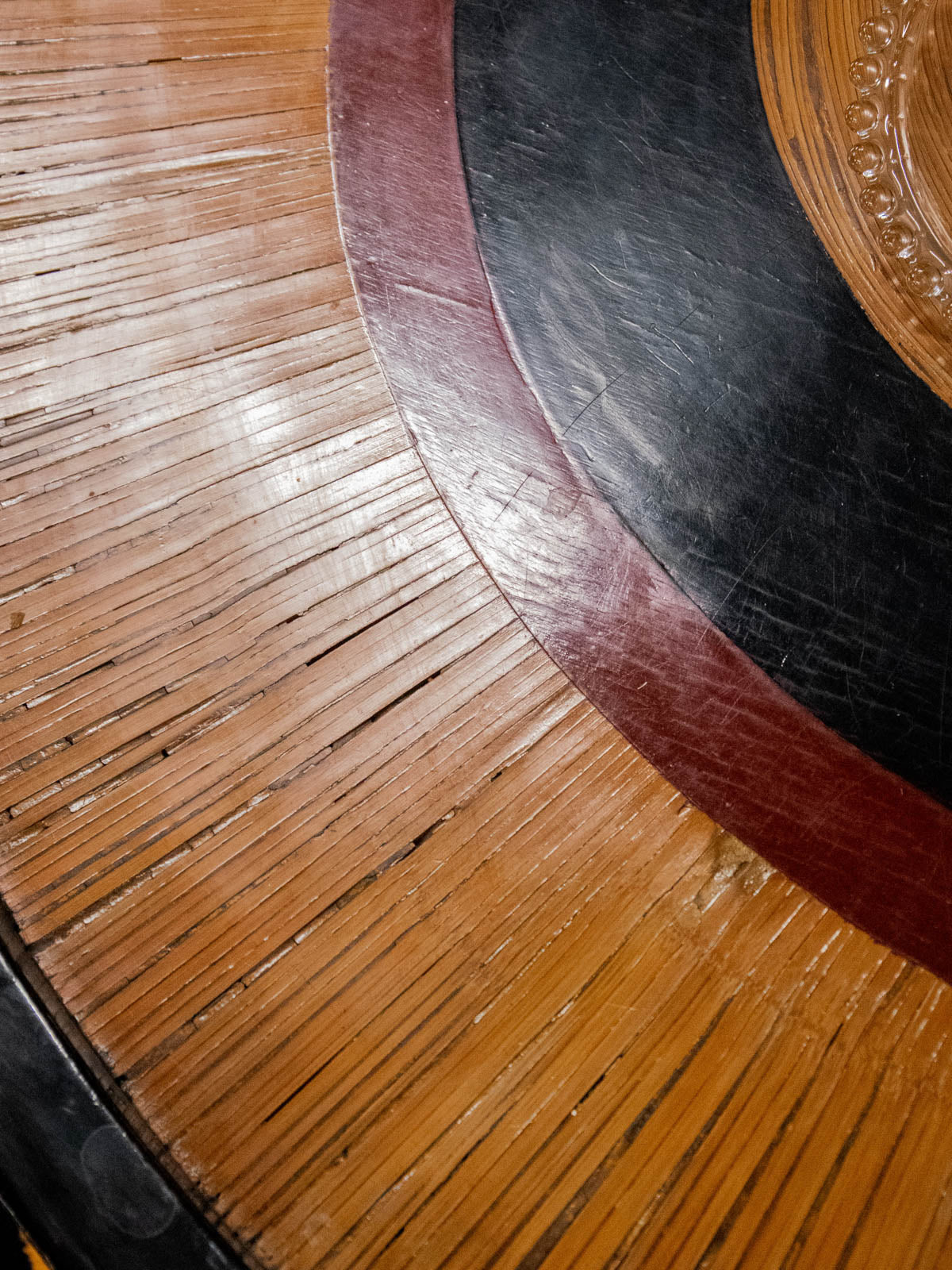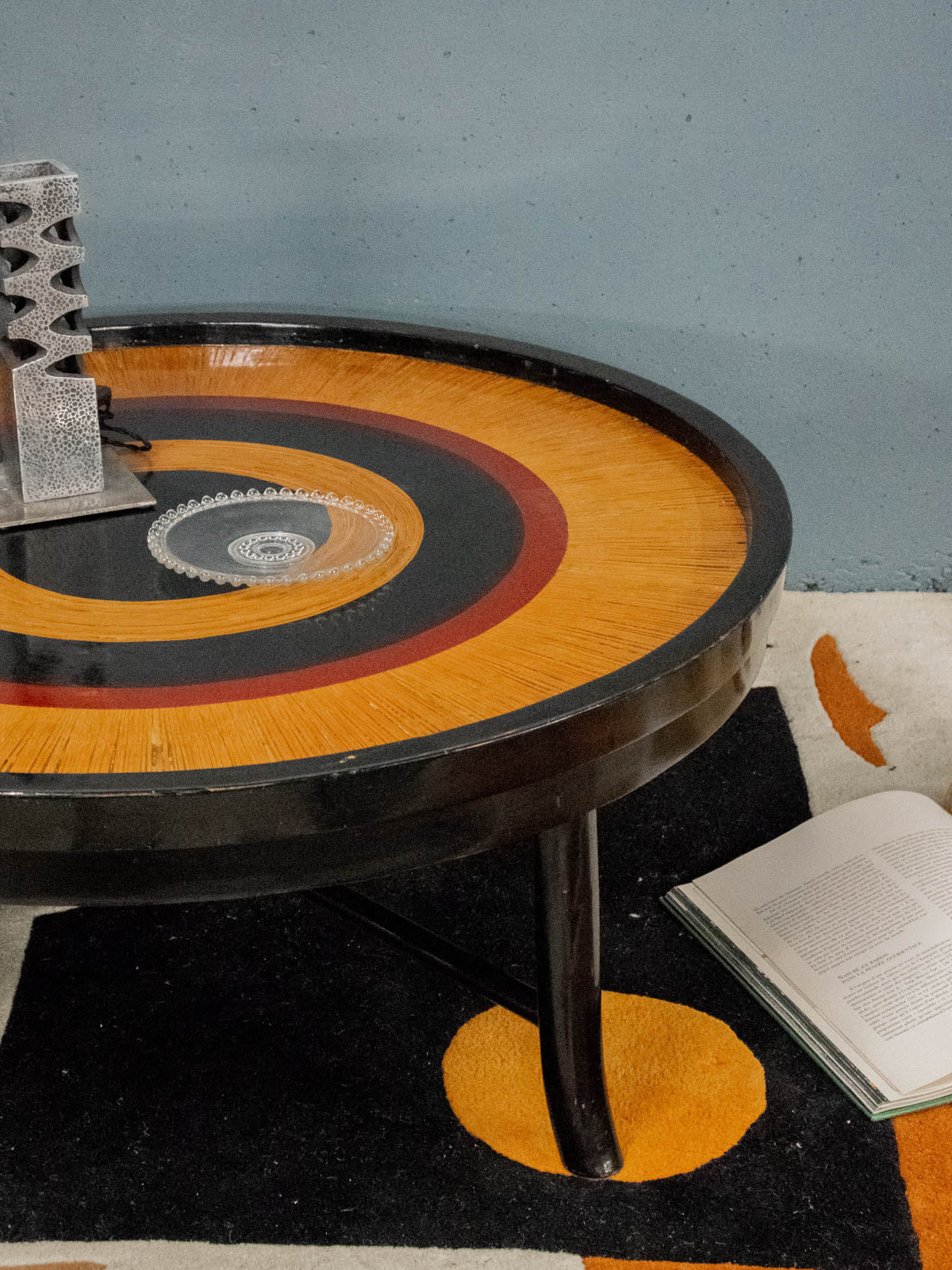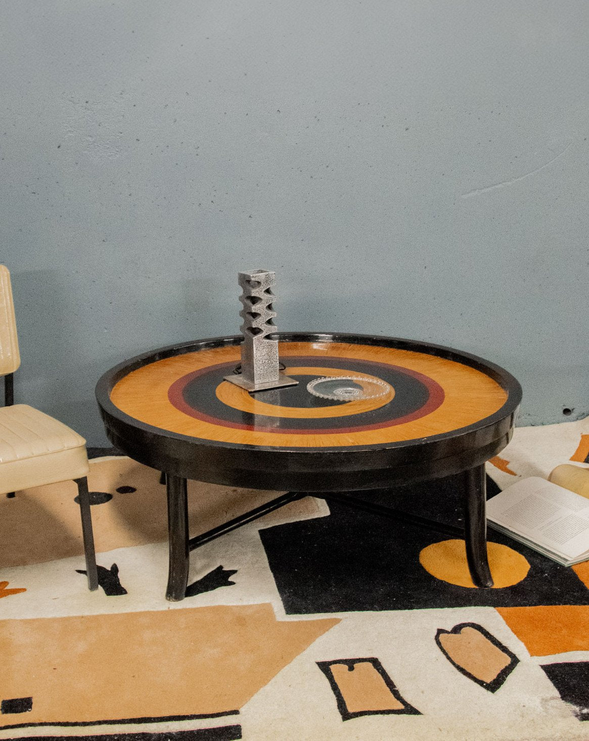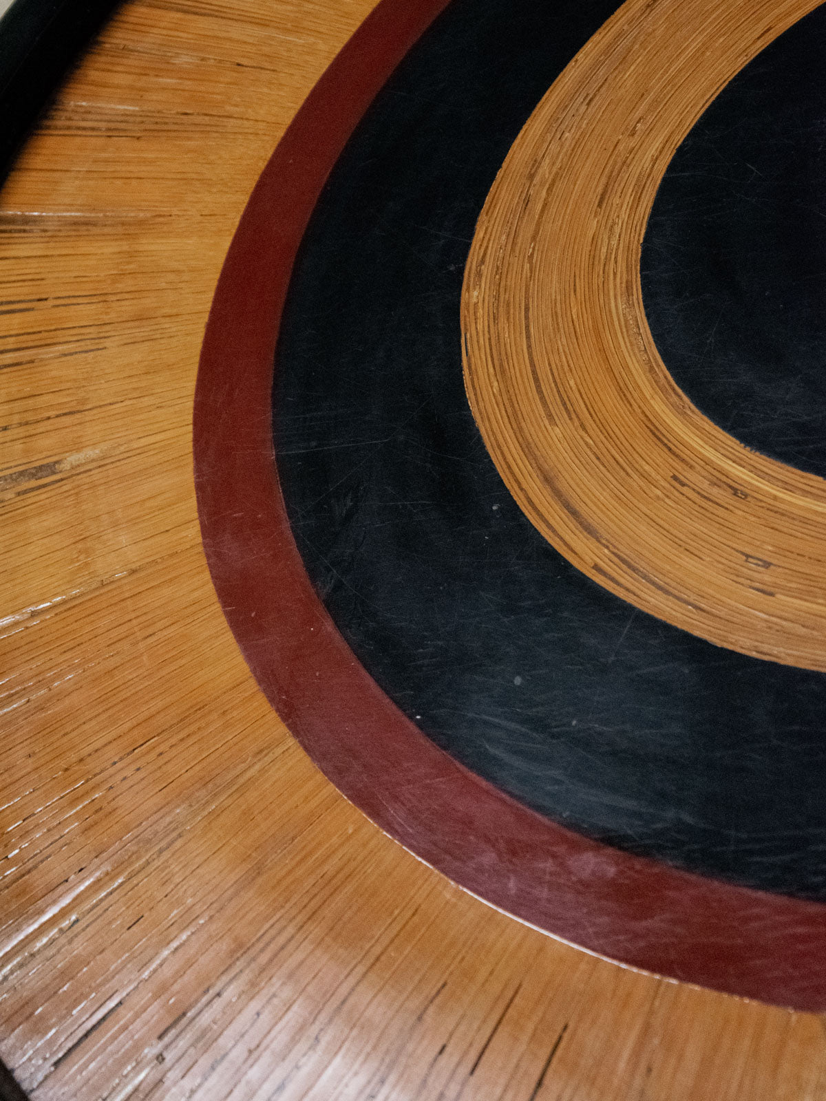 Invite this Japanese-inspired marquetry coffee table into your home, where three wood species—black, brown, and light—form concentric circles that captivate the eye. Its generous top and low height make it a perfect centerpiece for the living room, ideal for serving tea or displaying books and decorative objects. The gently curved legs accentuate its understated elegance and add a handcrafted touch to a serene and contemporary atmosphere. There are a few minor scratches and chips on the tabletop.