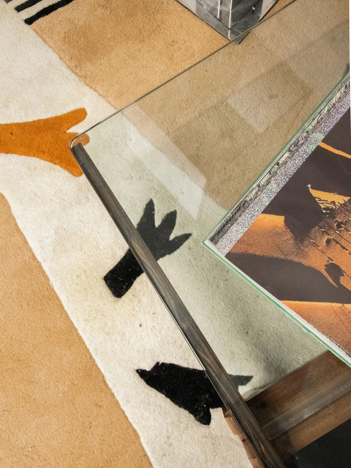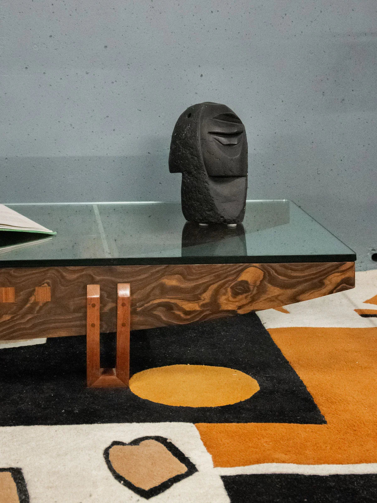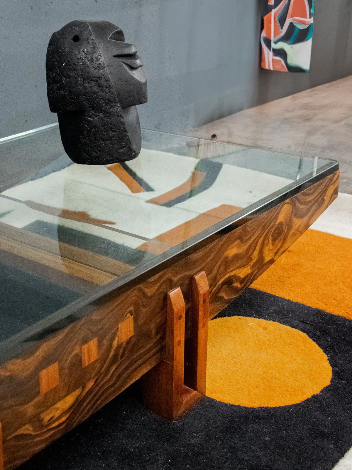 Elevate your living room with this Brazilian coffee table from around 1970, crafted from rosewood and glass with sculptural lines and a dynamic curve. Its generous size and low profile make it a beautiful centerpiece for displaying books, decorative objects, and entertaining, while the plexiglass supports lighten the overall look. The glass top showcases the rich, warm tones of the wood, creating a welcoming and graphic atmosphere with a refined vintage design.