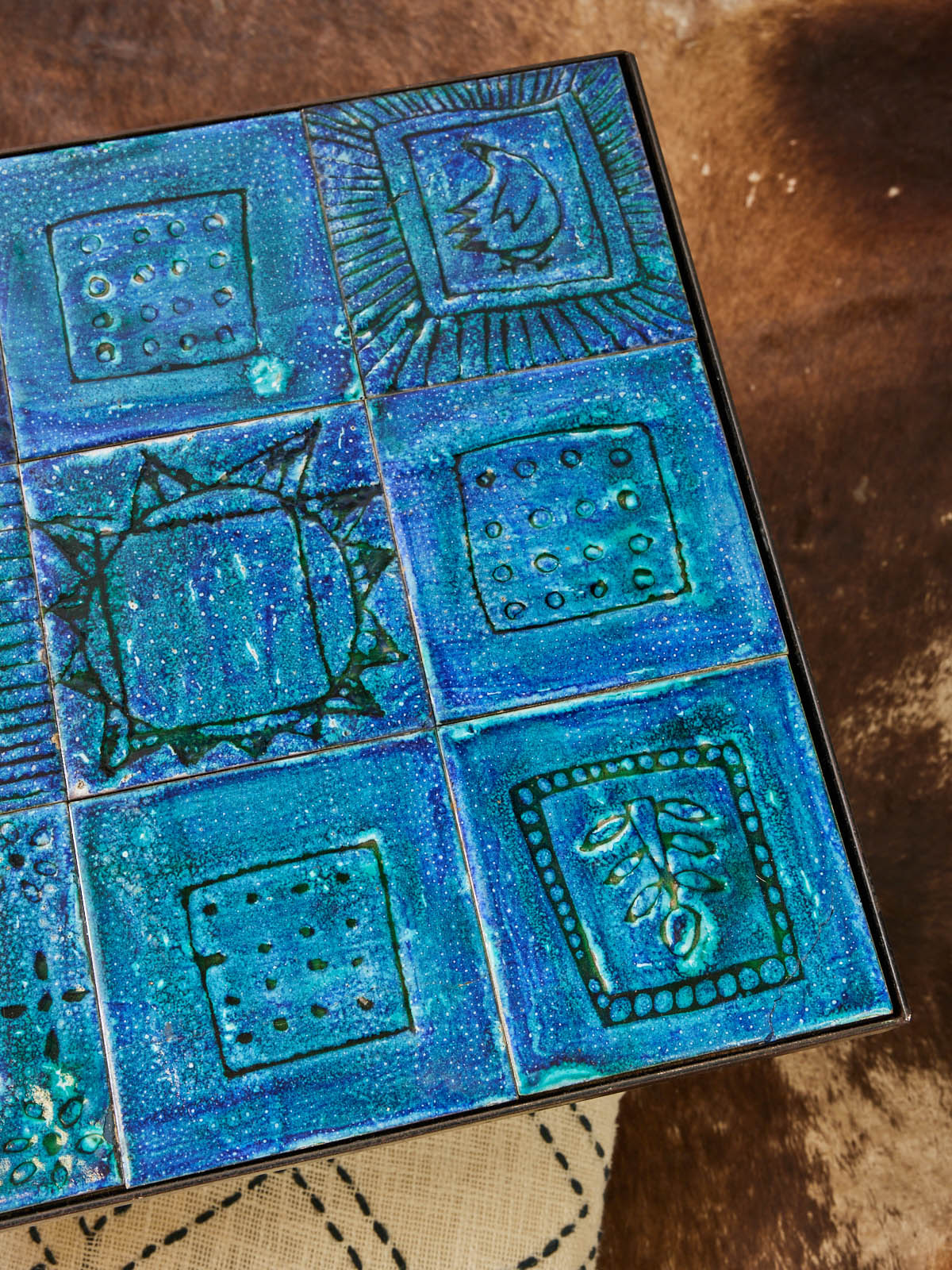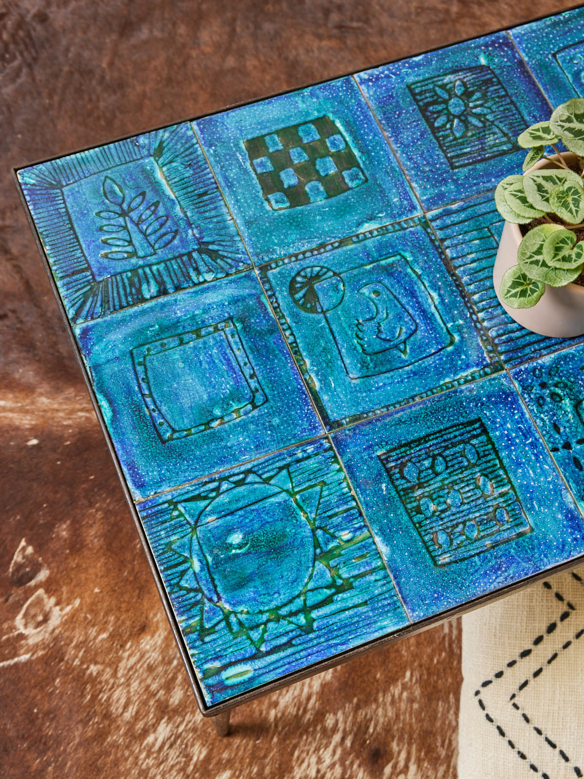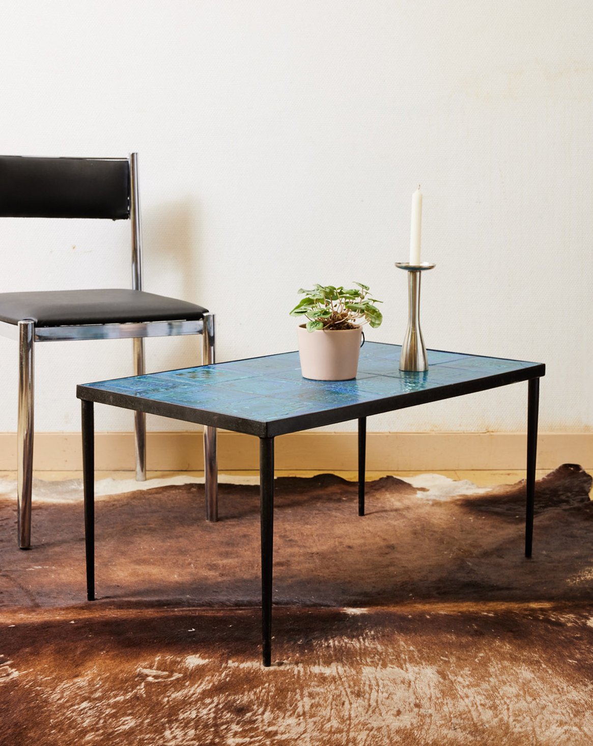 Elevate your living room with this designer coffee table, featuring a blue ceramic top and a black metal base. Dating from the 1960s, this rare piece plays on the contrast between the luminous ceramic and the graphic structure of the metal, offering a sculptural and elegant silhouette. Its size makes a discreet statement while providing a stable surface for books and objects, ideal as the centerpiece of a contemporary living room or entryway. A piece of decorative history, perfect for a vintage yet trendy ambiance.