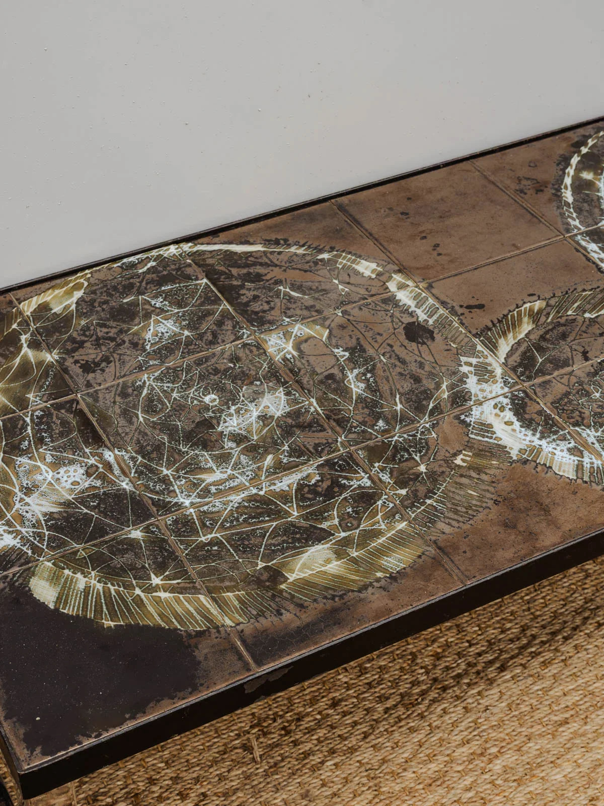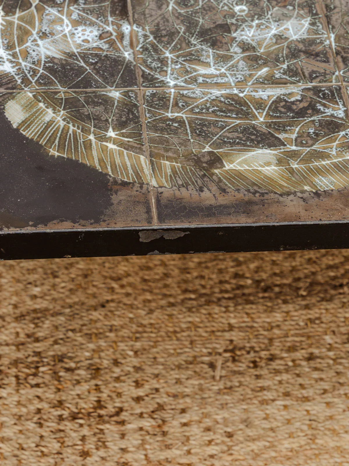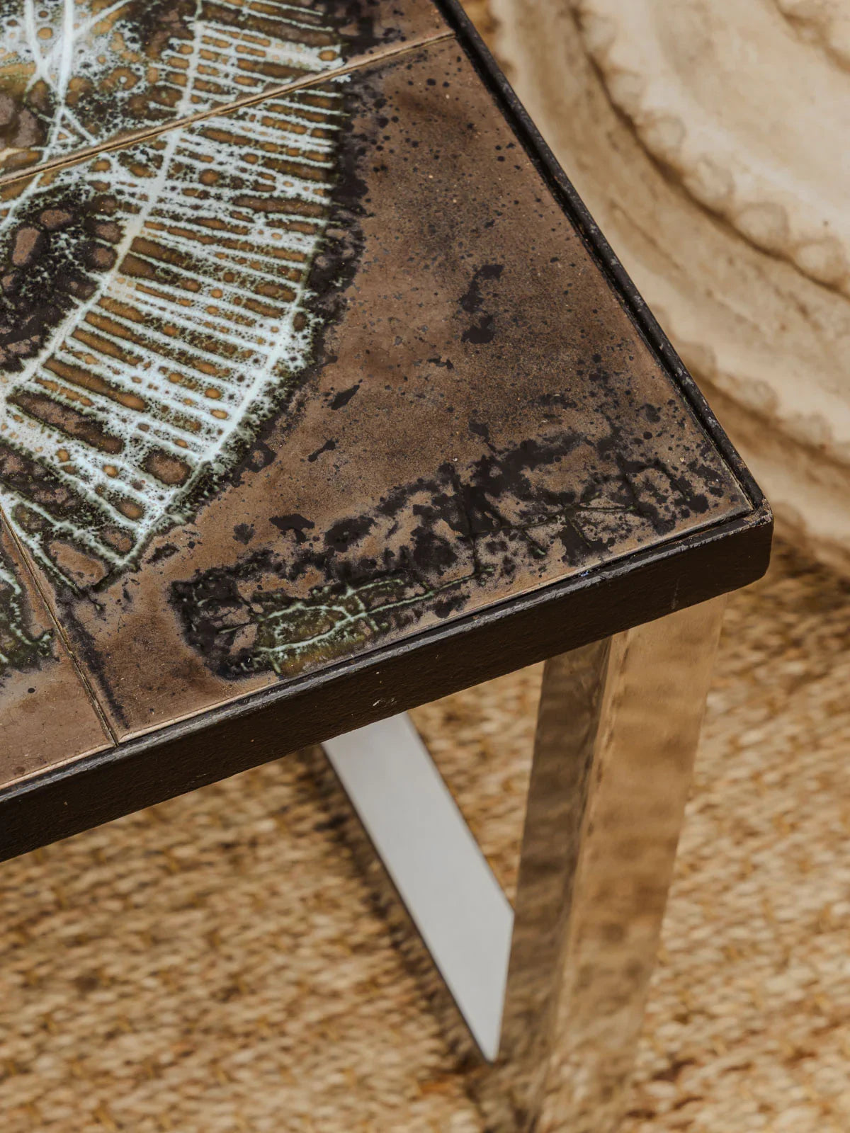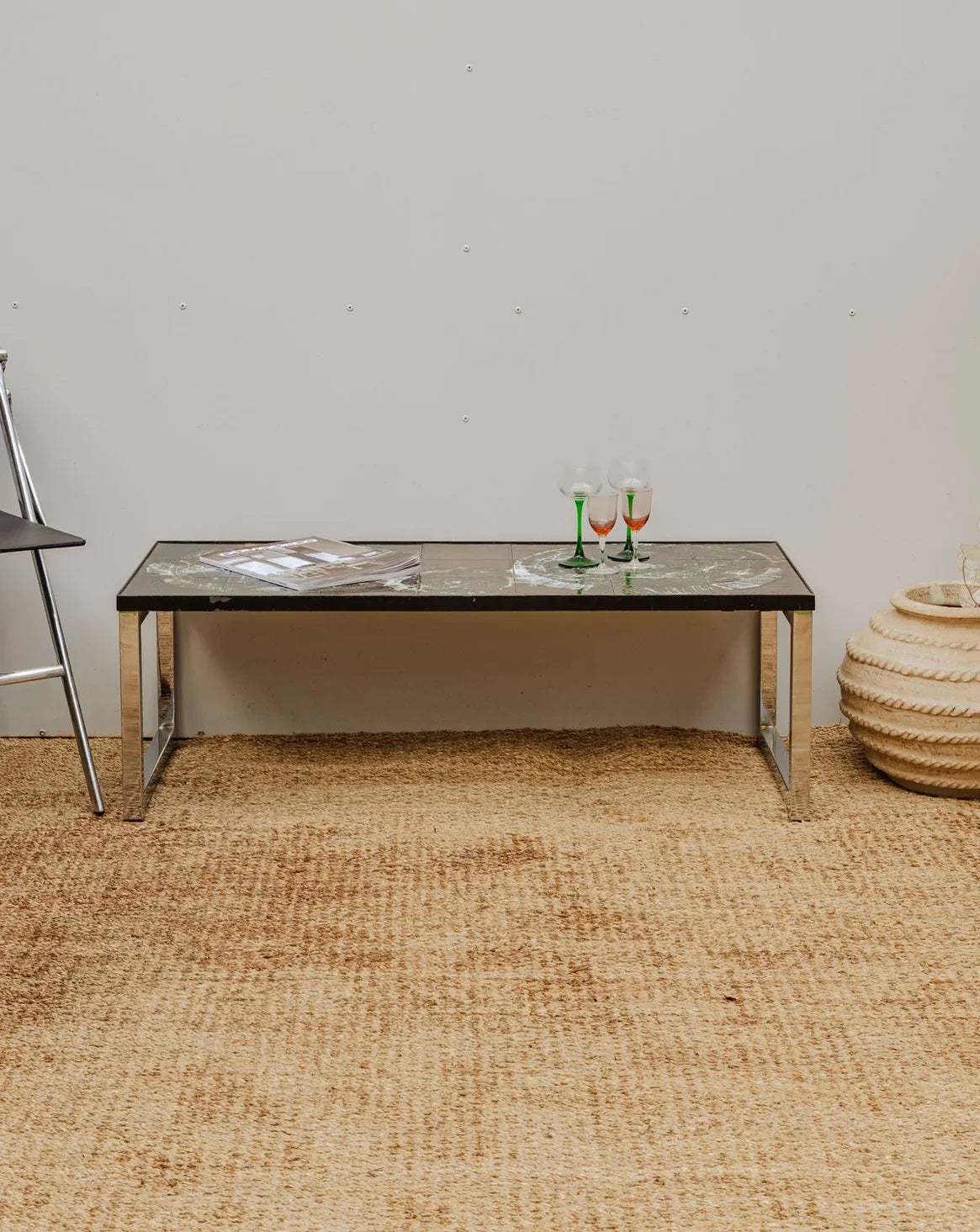 Discover this vintage coffee table by Juliette Belarti, featuring chrome legs and a black ceramic tile top adorned with white floral motifs. Its generous surface area invites coffee breaks and beautifully displays books and decorative objects, while the combination of chrome and ceramic creates a refined aesthetic that is both graphic and inviting. Perfect for adding a touch of retro-contemporary style to your living room. Some signs of age are present.