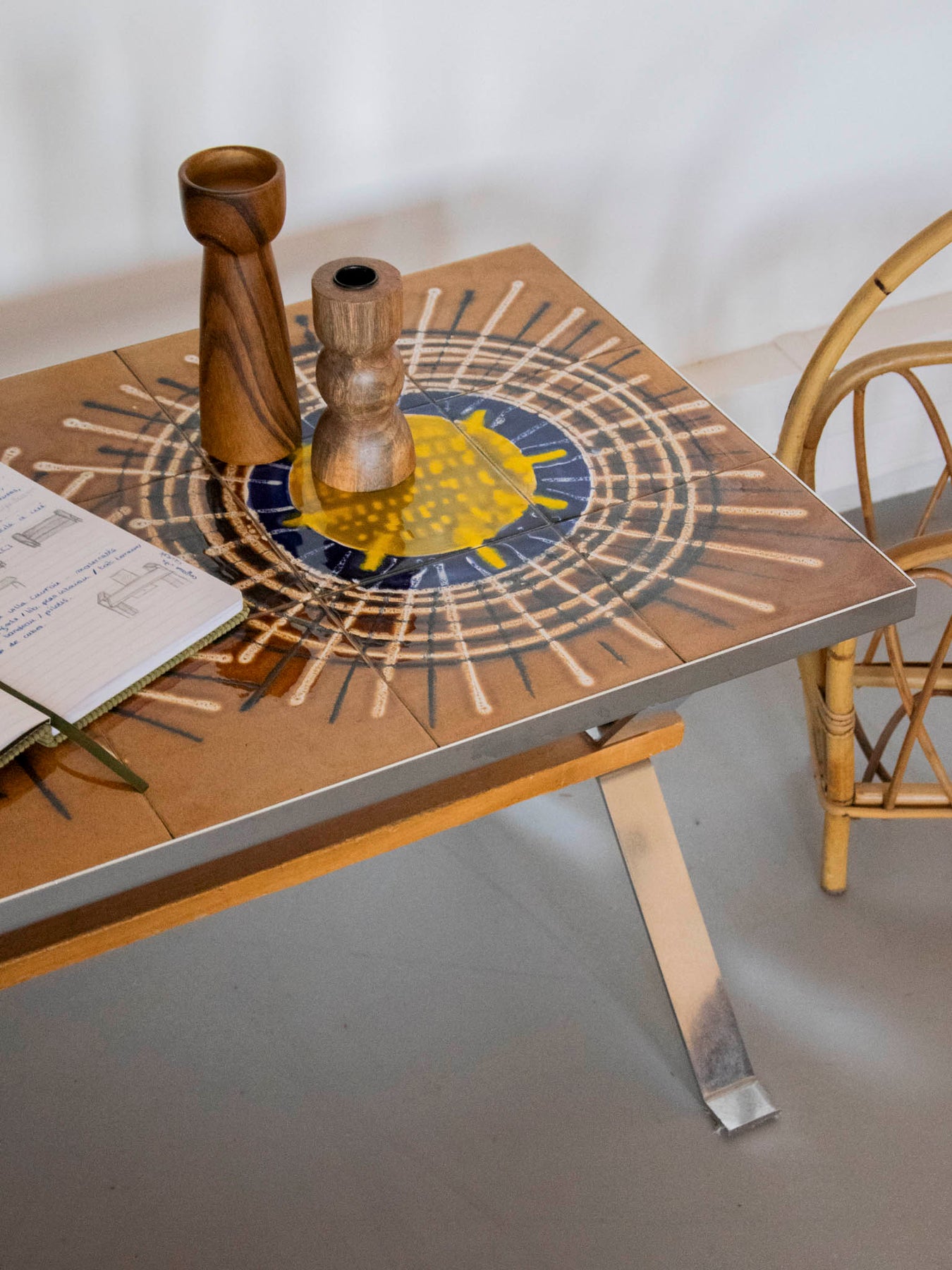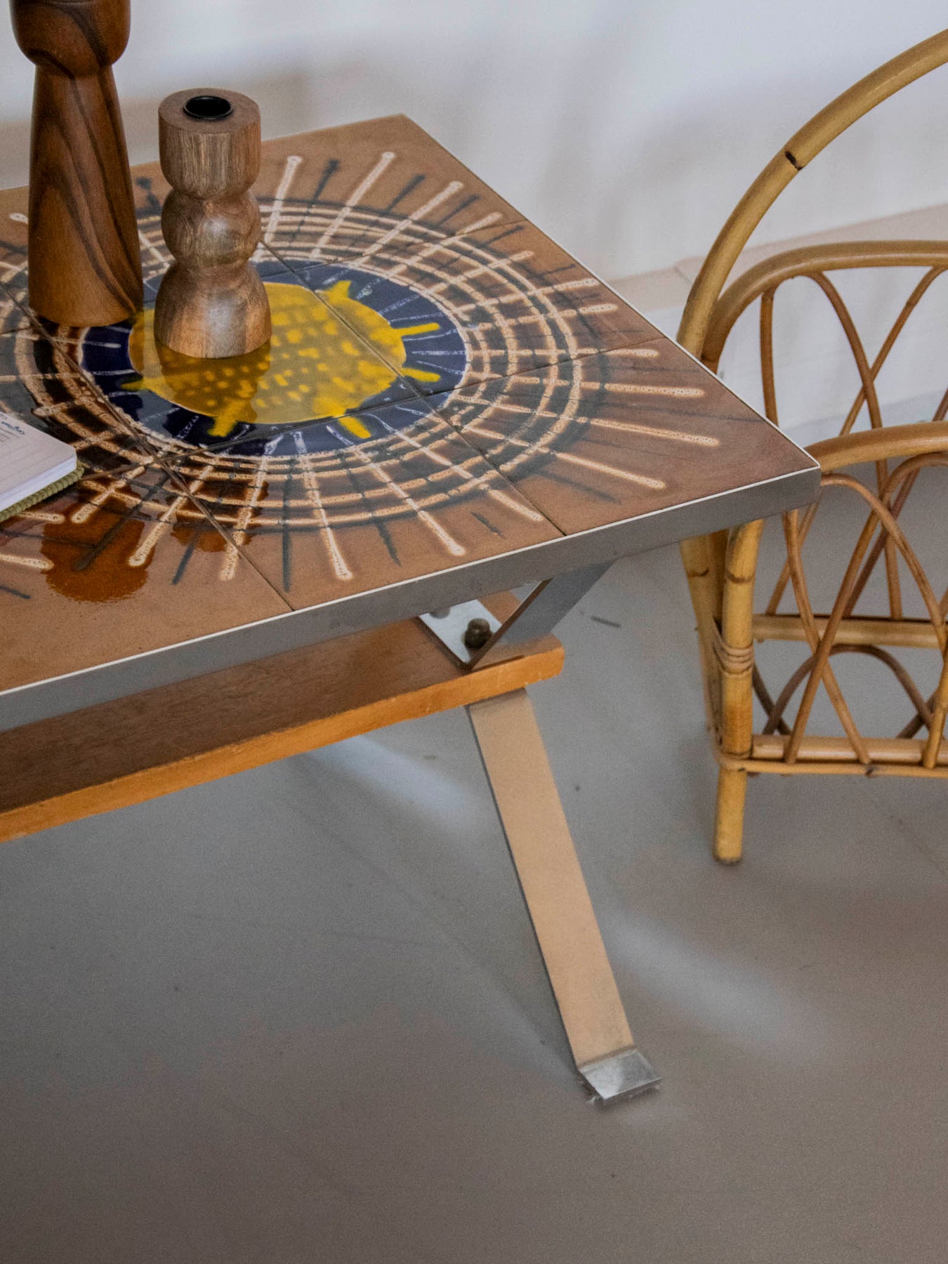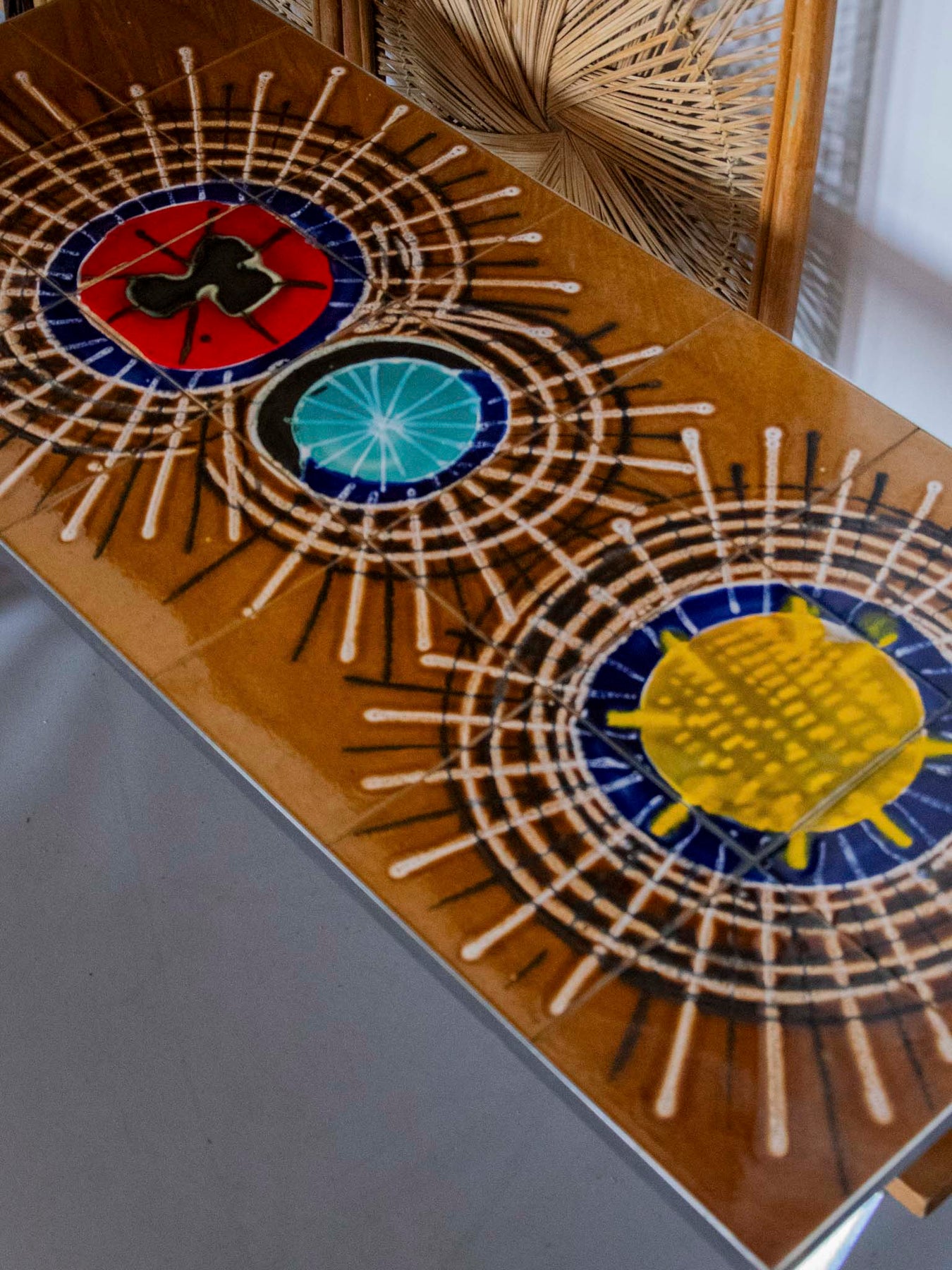 Enhance your living room with this mid-century coffee table in earthenware, metal, and wood with graphic lines. Its colorful tiled top, supported by a wooden structure and metal legs with assertive geometry, creates a lively and refined focal point. Its elongated and low proportions make it ideal in front of a sofa or bench for placing books, plants, and cups. It brings a retro-chic and warm touch, perfect for enlivening a contemporary interior.