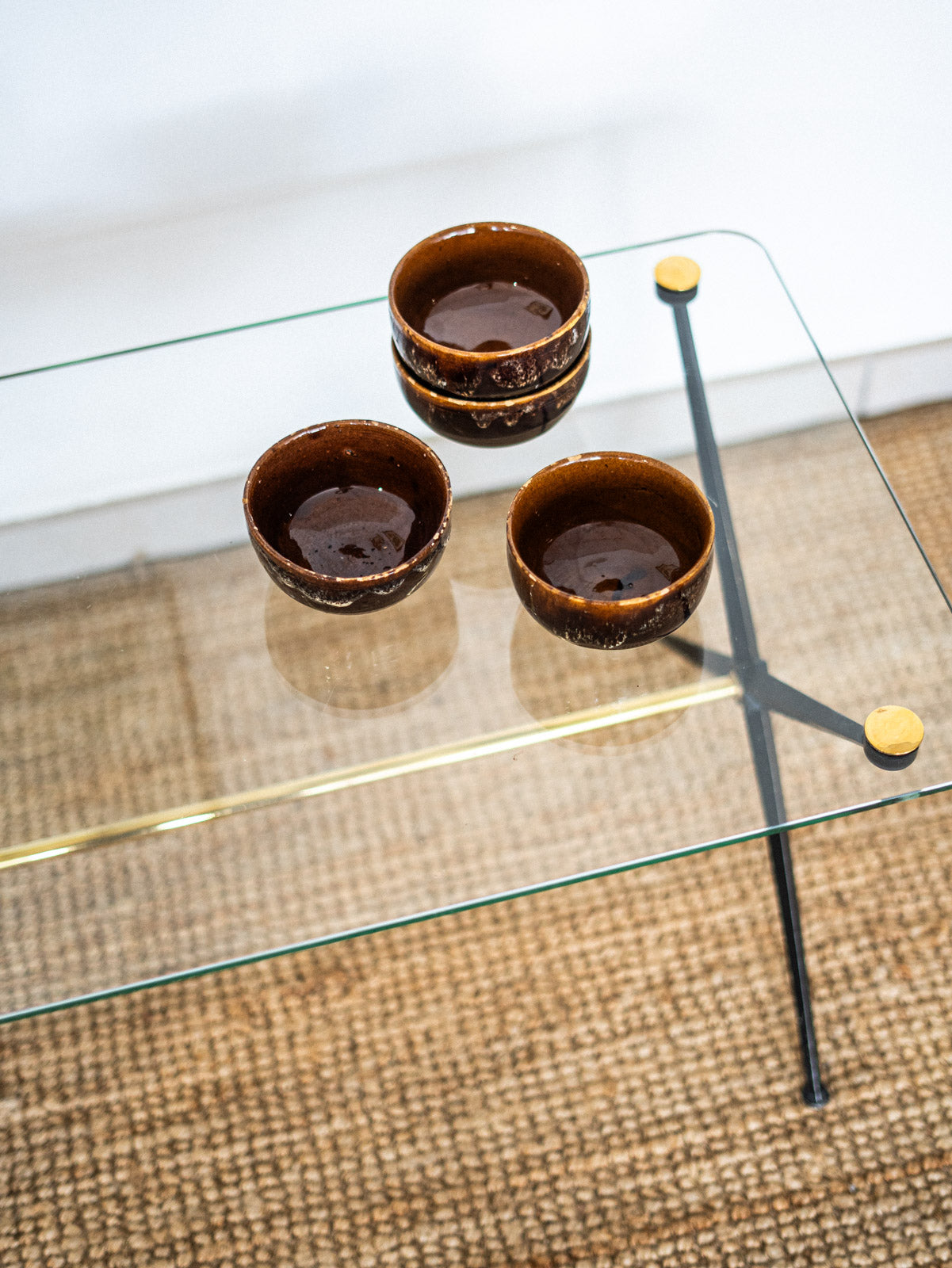 Discover the OSTUNI coffee table, a true gem from the 1950s. Its elegant glass top with rounded corners is supported by a black metal base, embodying delicacy and modernity. Gold touches, such as the brass screw cover and crossbar, add a touch of refinement to this set. Although some slight marks are present on the top, they in no way alter the timeless charm of this unique piece. This coffee table is ideal for enhancing your living room with style and character.