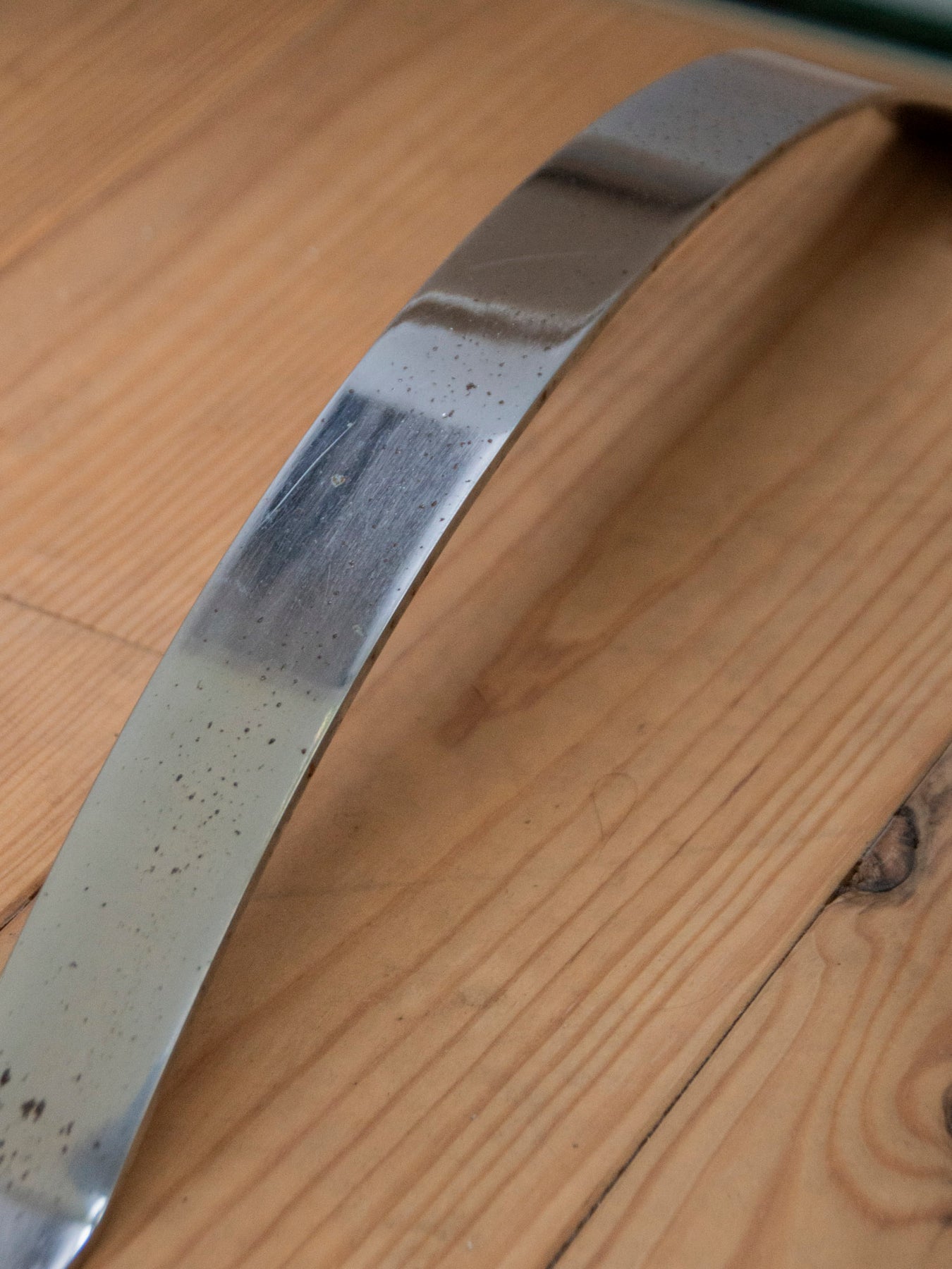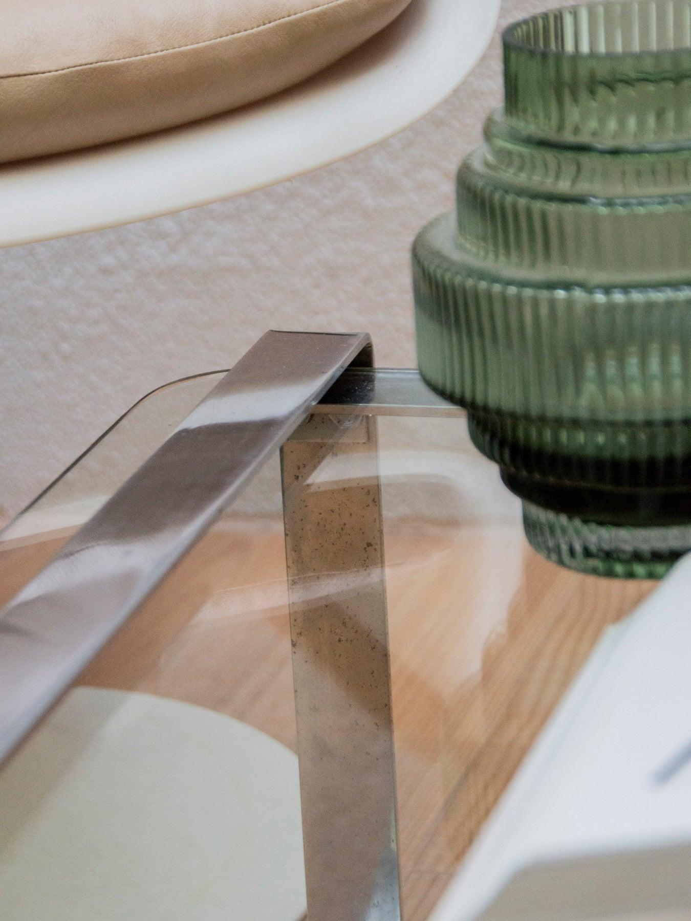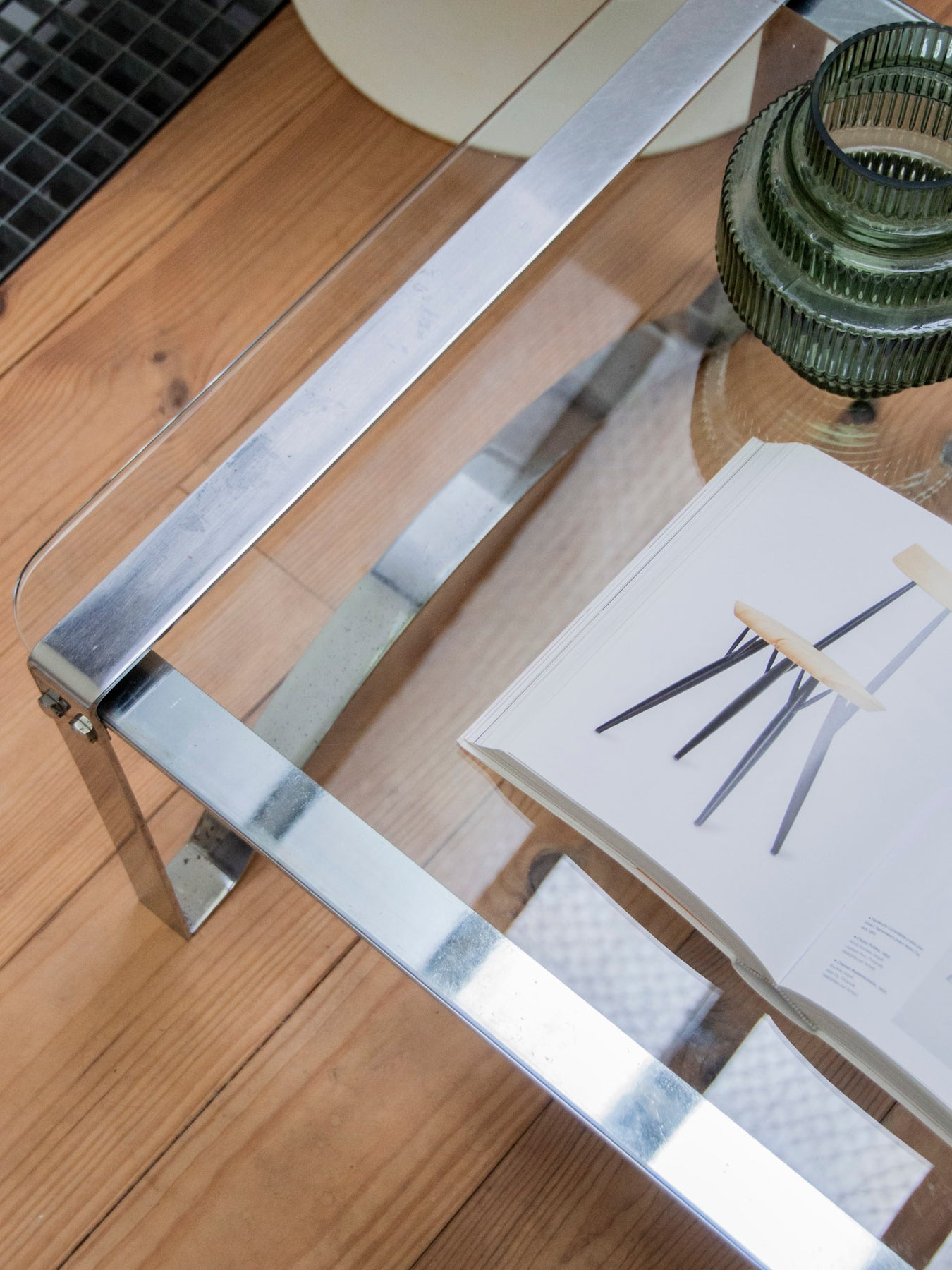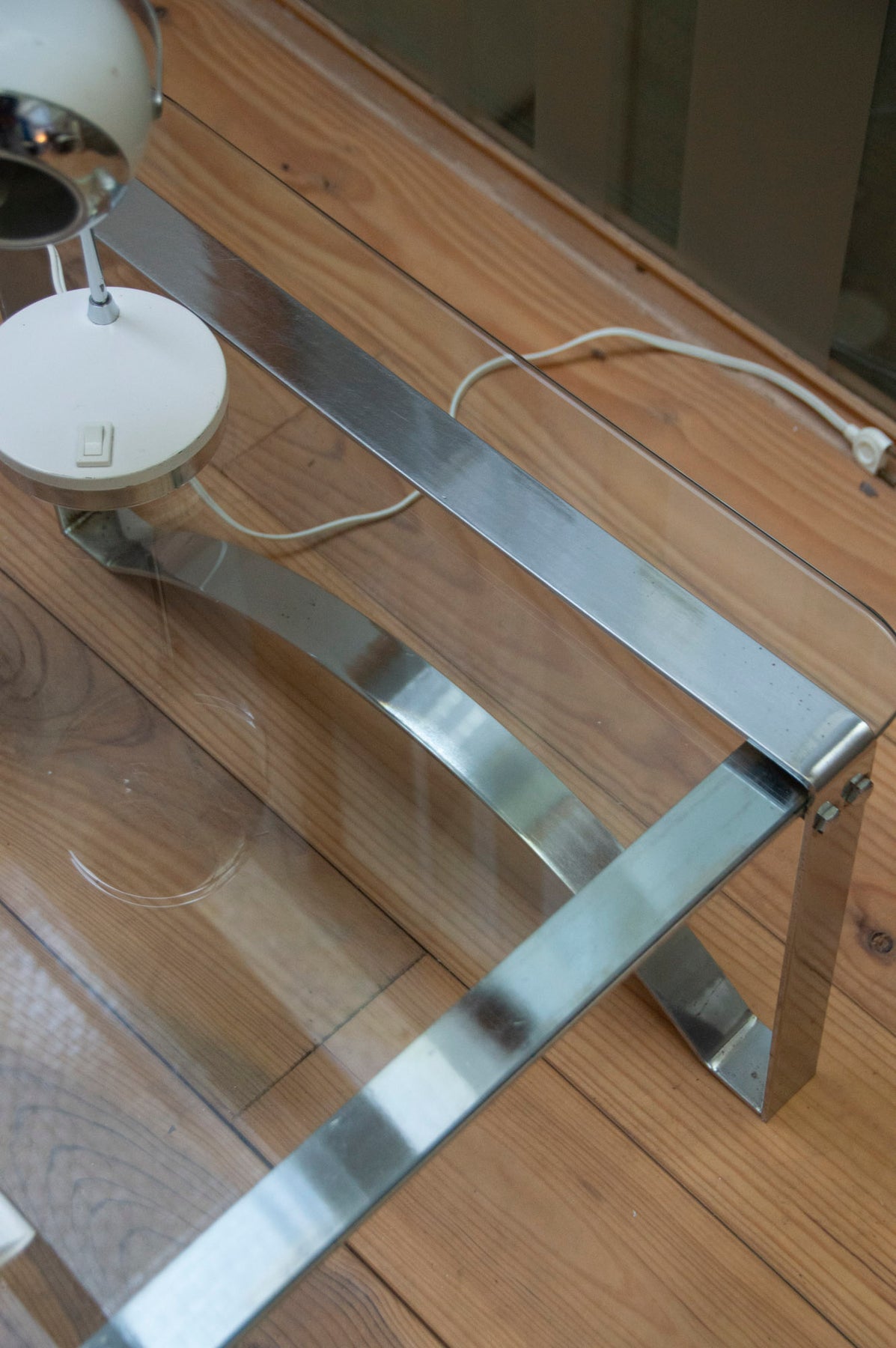 Elevate your living room with this glass and metal coffee table, featuring a wide top that prioritizes light and elegance. Its flared, slightly curved legs create a graphic silhouette and provide stability, while the transparent top showcases decorative objects and textiles. Its low profile makes it ideal as a sofa table or a versatile side table. Minor signs of wear on the bottom of the legs.