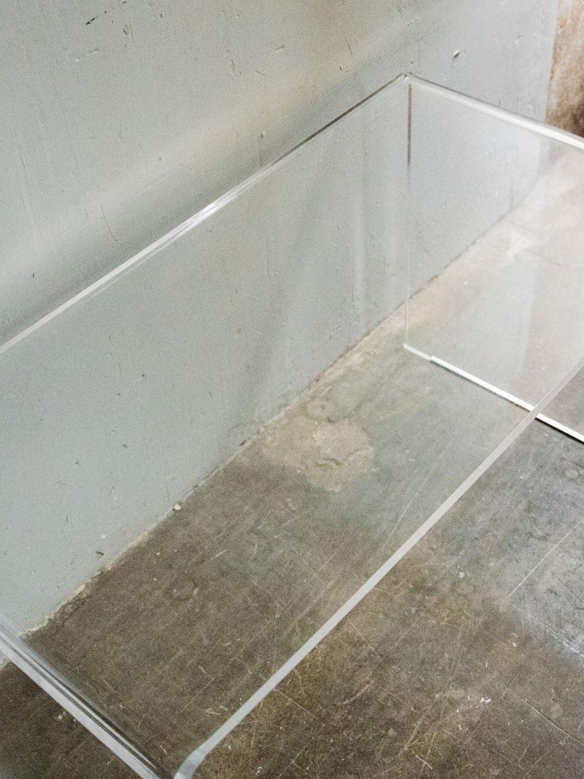 Discover this elegant coffee table made of heavy plexiglass, with its rounded, rectangular design, which will bring a modern touch to your interior. Its clean lines and subtle transparency allow this piece of furniture to blend seamlessly into various decorating styles. Although the item shows some minor wear, its sturdiness and timeless aesthetic make it an ideal choice to enhance your living space while combining functionality and elegance.