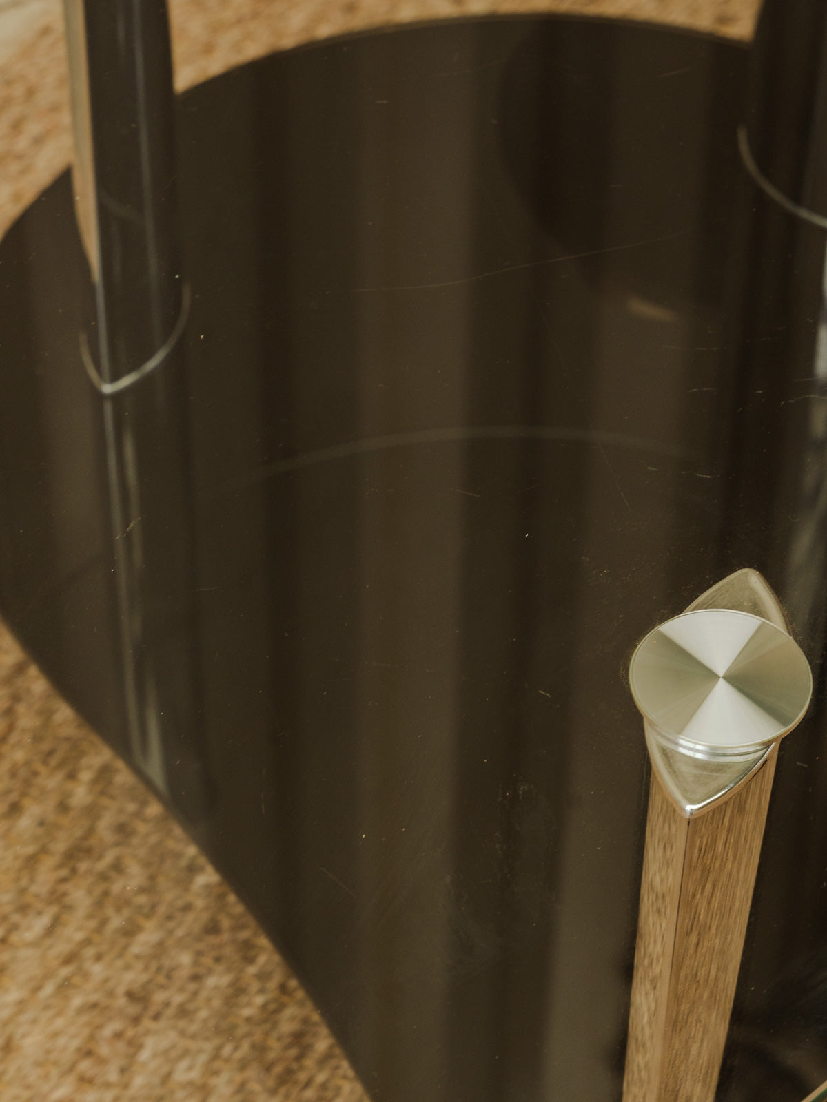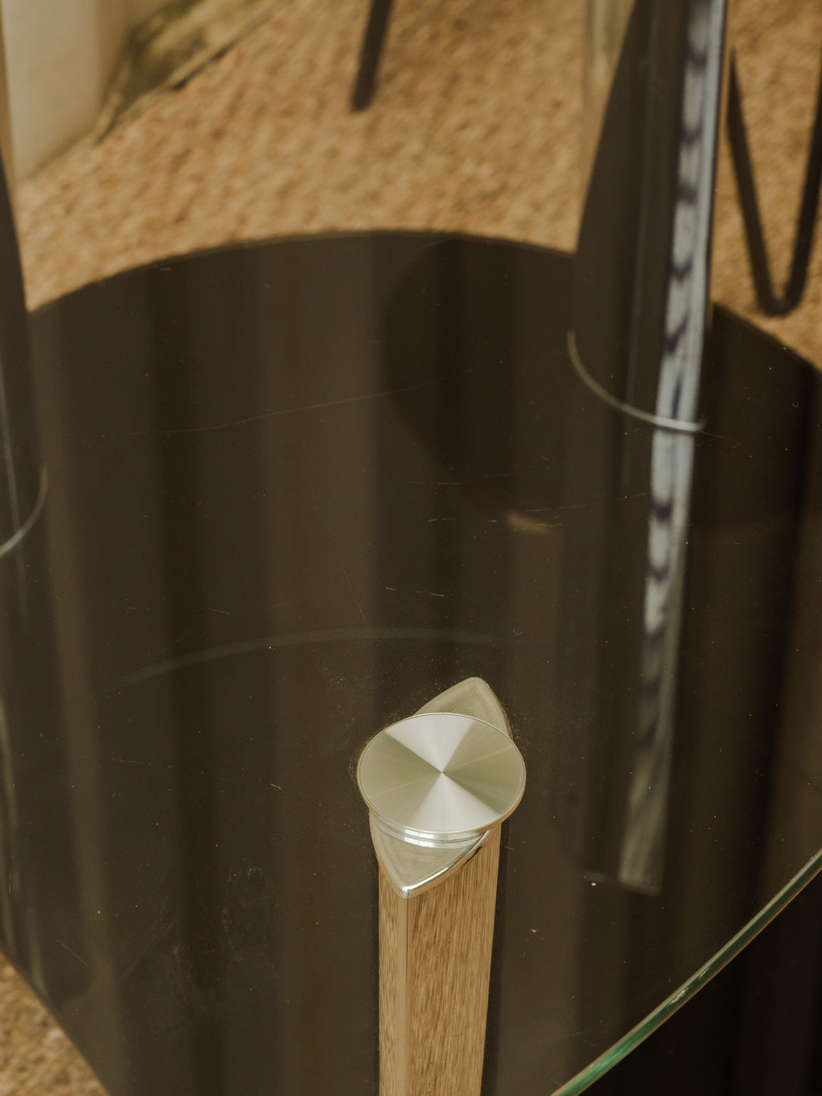 Elevate your living room with this coffee table featuring a curved silhouette, crafted from clear glass and resting on chrome legs that lend it a light and contemporary feel. Its surface beautifully displays books and decorative objects, while the black glass shelf beneath creates a refined contrast and offers discreet storage. Ideal for structuring a cozy corner without overwhelming the space, it adds a graphic and elegant touch to the overall design. A few scratches add to its unique character.