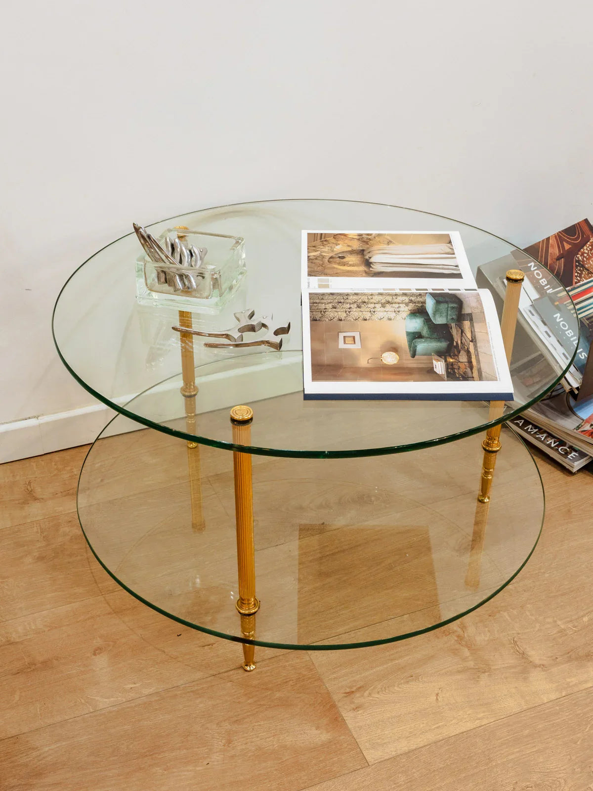 Elevate your living room with this round glass coffee table, featuring two shelves that combine functionality and elegance. The interplay of transparency beautifully showcases the objects placed on it, while the gold base adds a warm and refined touch, contrasting with the lightness of the glass. Its size makes it easy to place in front of a sofa to hold books and cups or create a cozy and bright corner. Some signs of age are present.