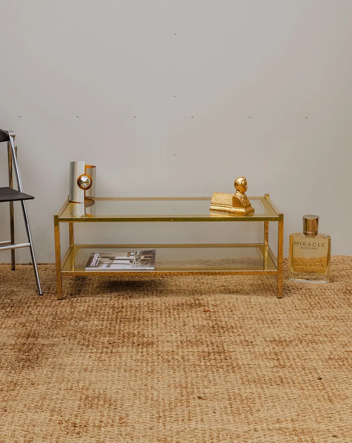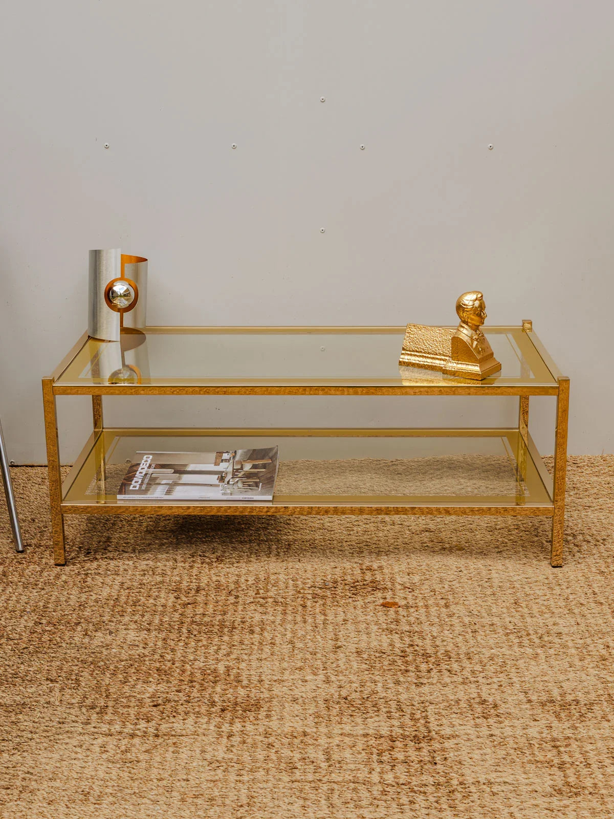 Elevate your living room with this coffee table featuring a gold frame and a glass top edged in gold, combining refinement with visual lightness. Its top provides an elegant surface for displaying books, decorative objects, or a serving tray, while the slender frame lends an airy silhouette that complements both contemporary and classic interiors. Ideal for creating a warm and sophisticated atmosphere, it adds a touch of brightness without overwhelming the space. Some signs of age are present.