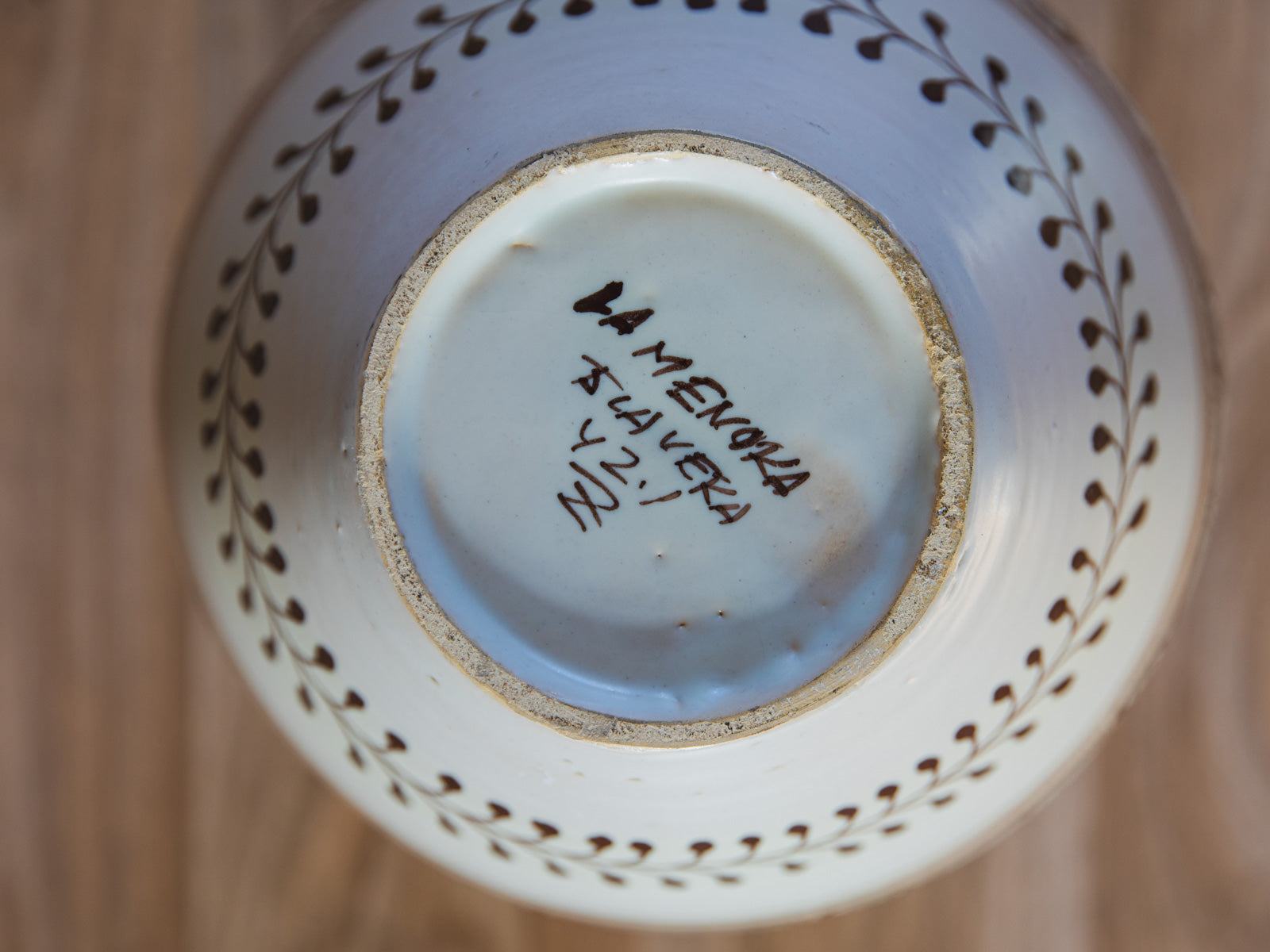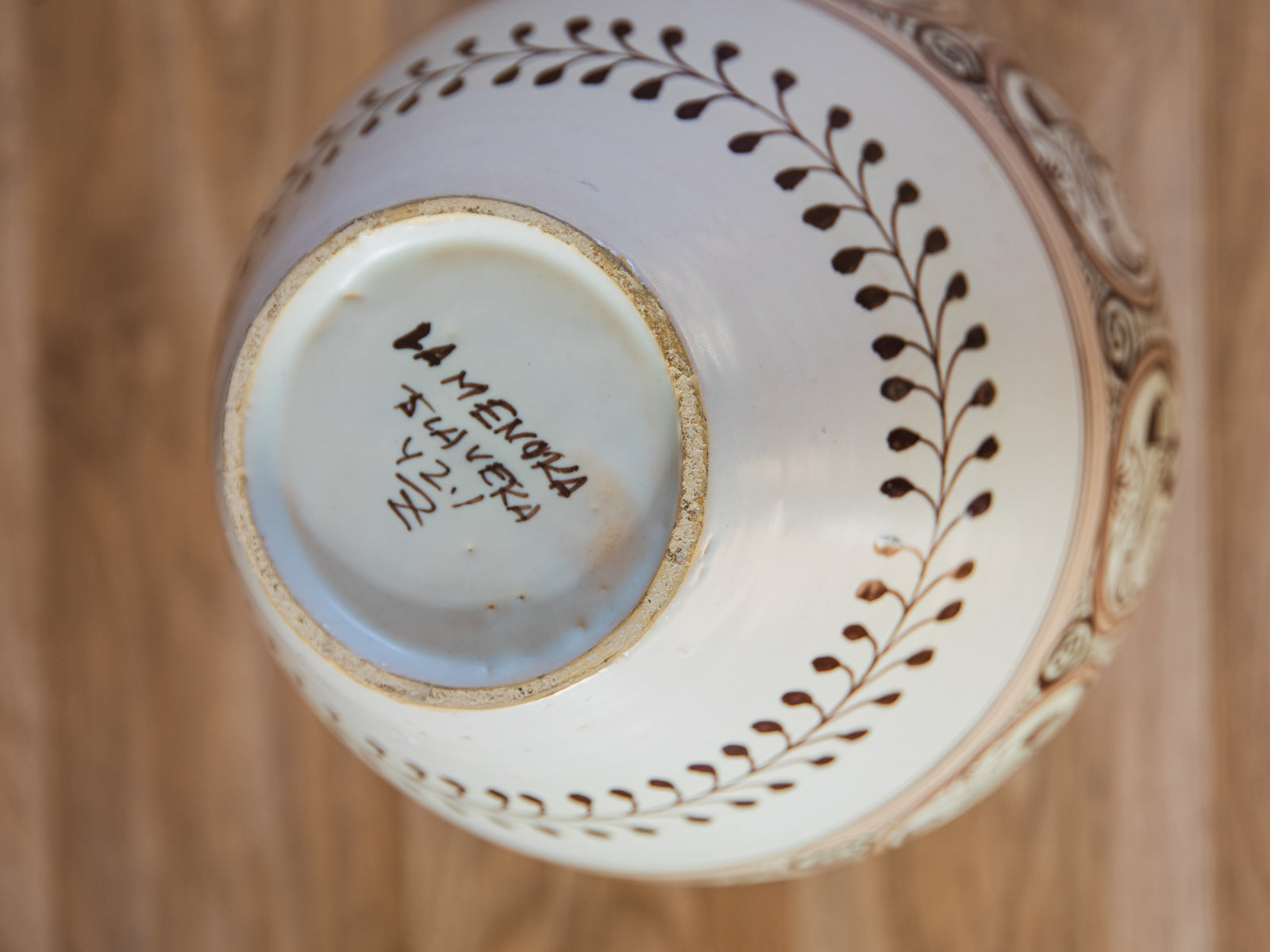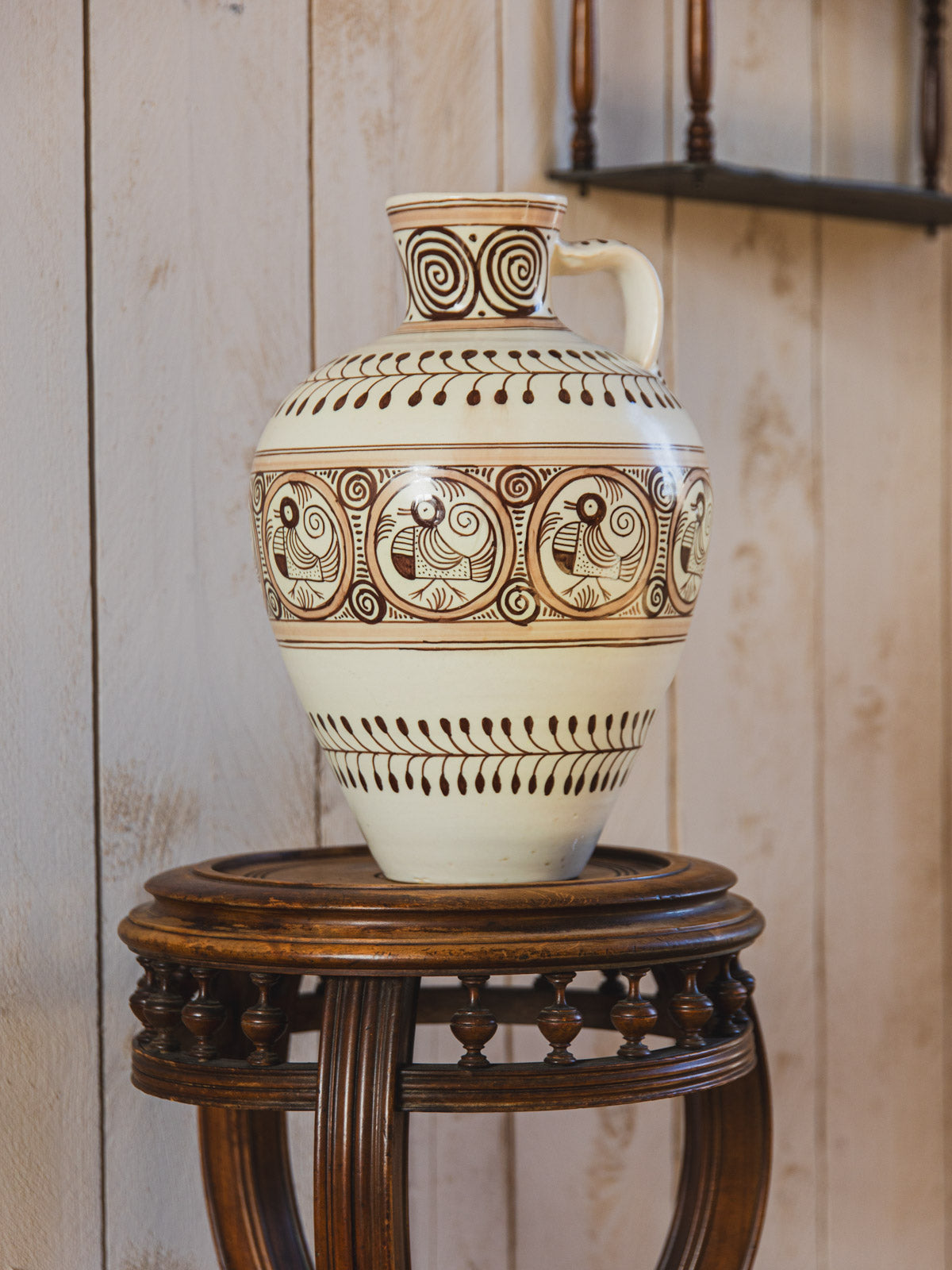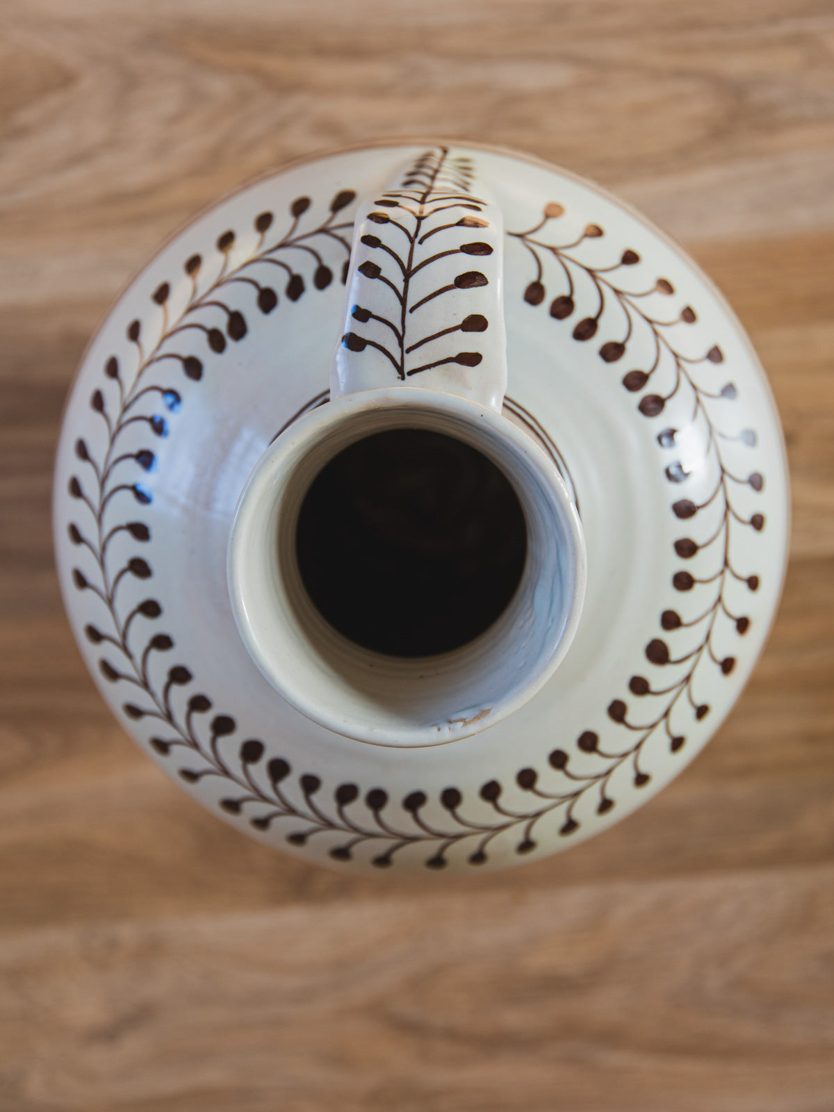 Invite this ceramic vase with a single handle, made in Spain in the 1970s, into your home. Adorned with a delicate hand-painted bird motif, its balanced silhouette and sculpted handle offer an elegant grip, making it ideal for small bouquets or as a decorative piece on a console table. The subtle palette and meticulous craftsmanship create a warm and poetic ambiance that enhances the space without overwhelming it. Minor, discreet signs of age.