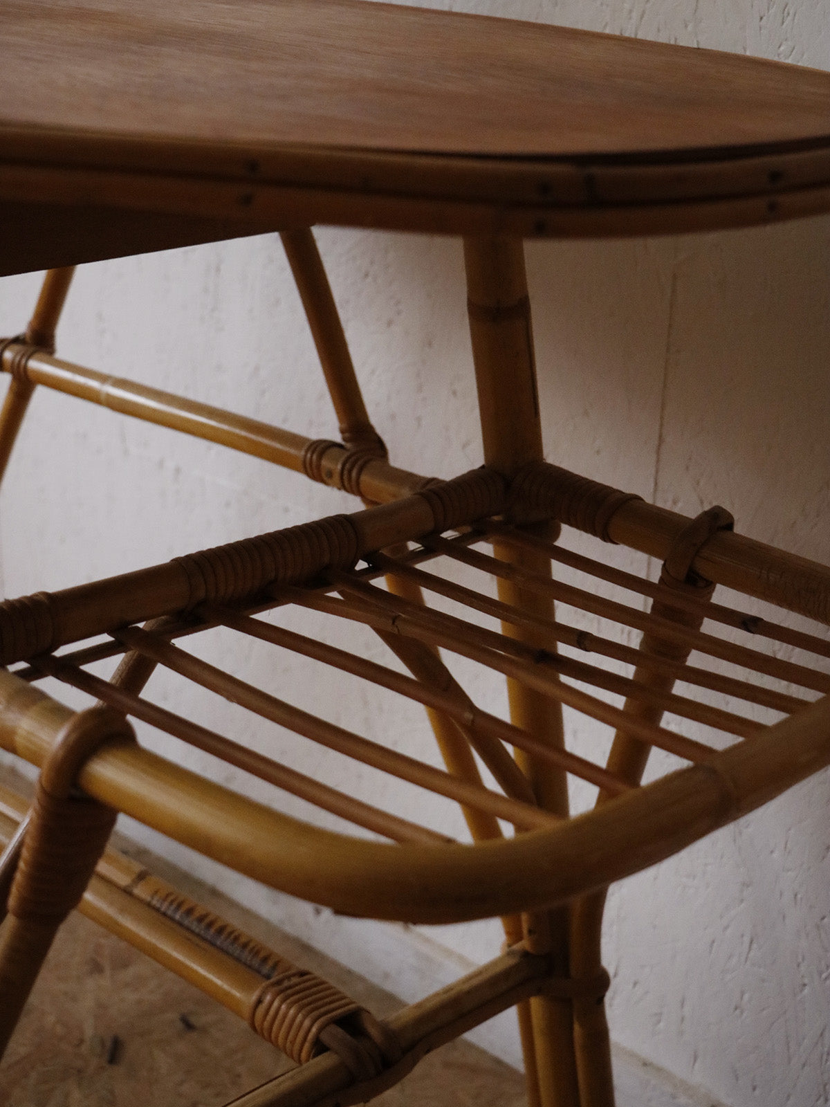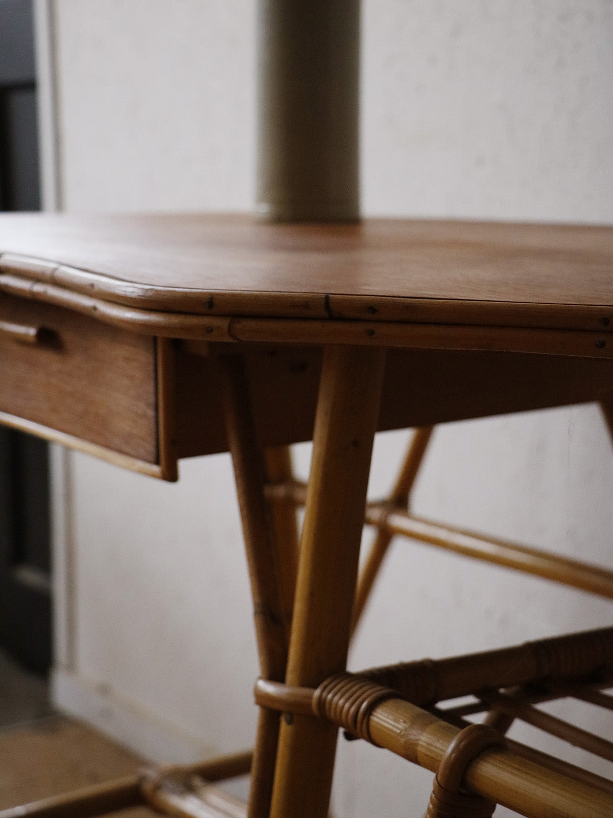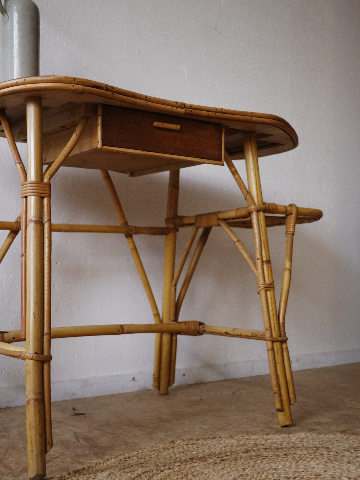 Discover this 1960s rattan desk with a wood veneer top, whose free-form shape lends an organic and elegant silhouette. Its compact proportions offer a practical workspace for a laptop, while the discreet drawer and rattan shelf provide clever storage for notebooks and other items. The natural weave of the rattan and the warmth of the wood create a soft and inviting atmosphere, perfect for an interior with vintage charm.