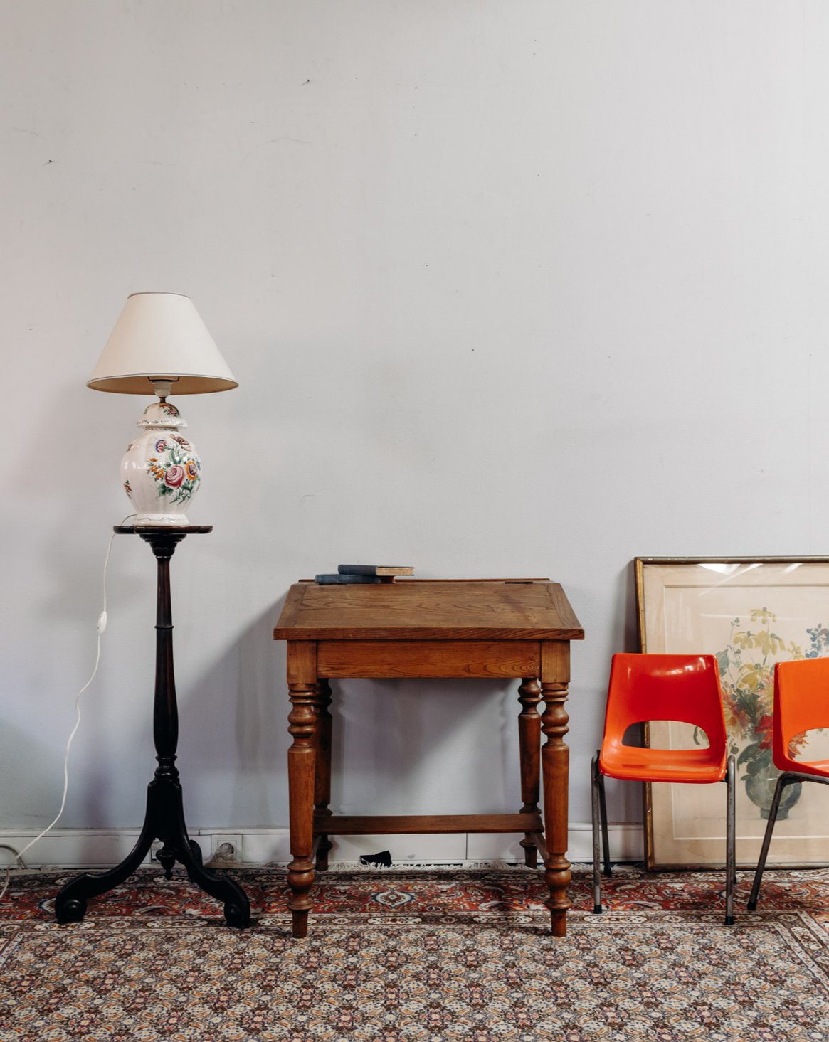 Discover this dark wood desk with turned legs, whose classic silhouette brings a handcrafted touch to any interior. The top opens wide to accommodate stationery or a laptop, while the small hole for an inkwell recalls its historical use and adds a charming detail. Its proportions make it suitable for an office, entryway, or reading nook, creating a warm and studious atmosphere.