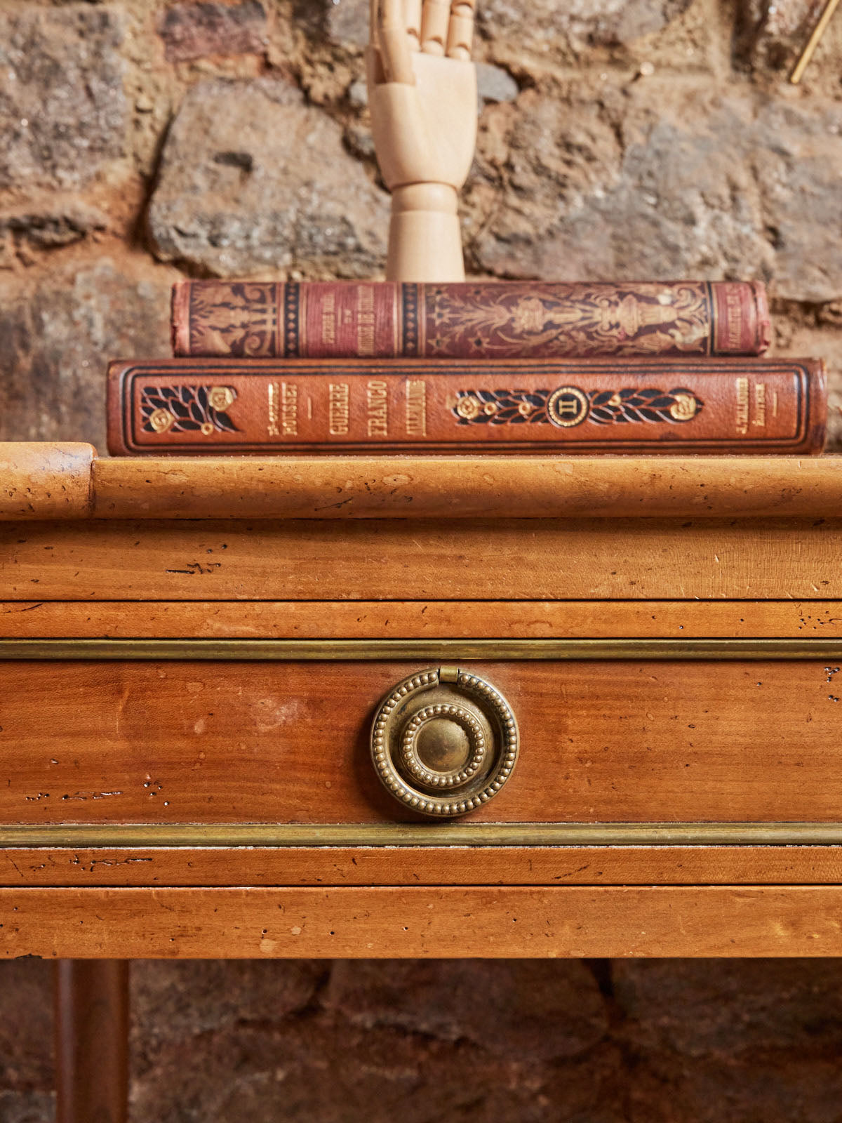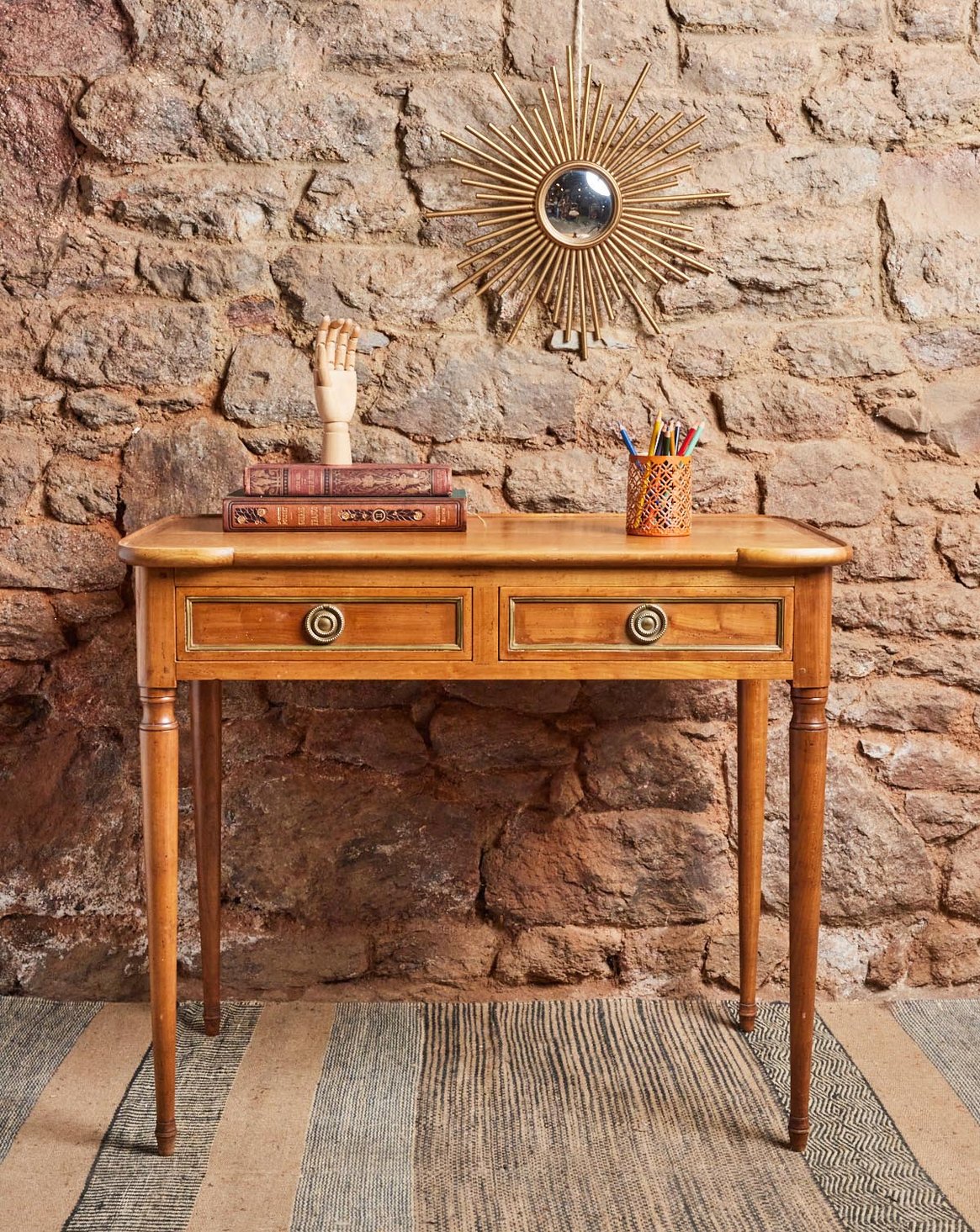 Choose this Louis XVI style desk, with its classic and refined lines that bring a touch of understated elegance to your home. Designed for everyday use, it features two practical drawers for organizing your papers and two large side shelves for displaying lamps, decorative objects, or plants, while keeping the work surface clear. Its presence creates a warm and timeless atmosphere, perfect for a home office or entryway where antique charm blends seamlessly with practicality.